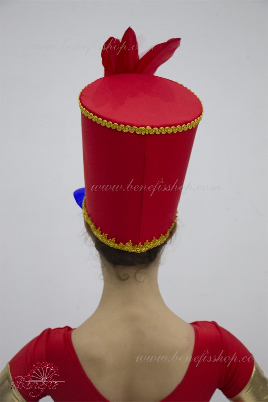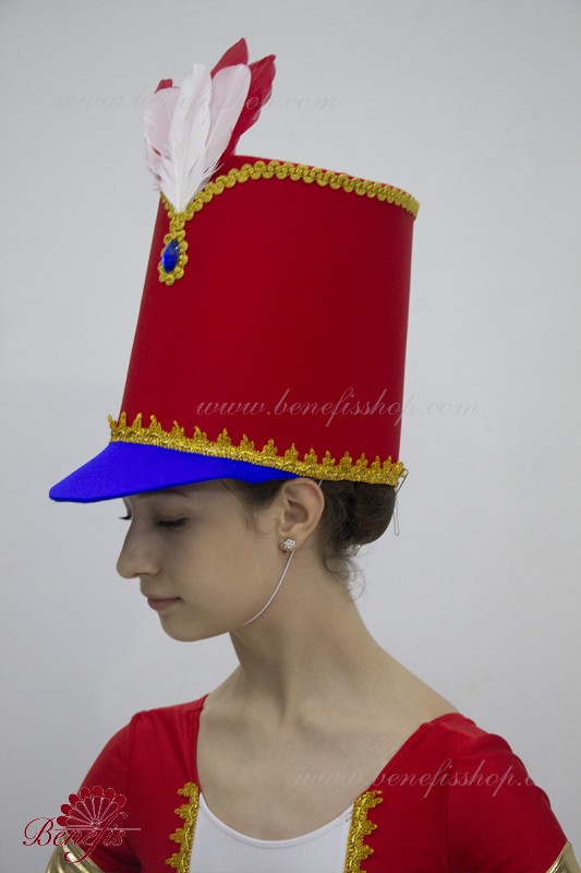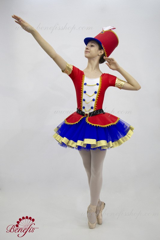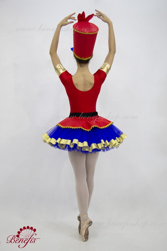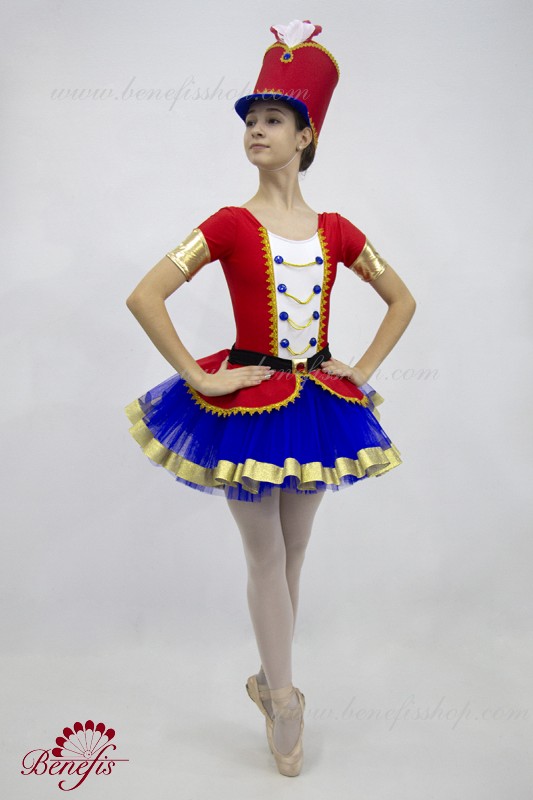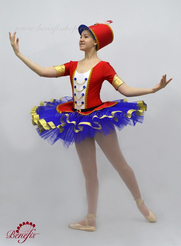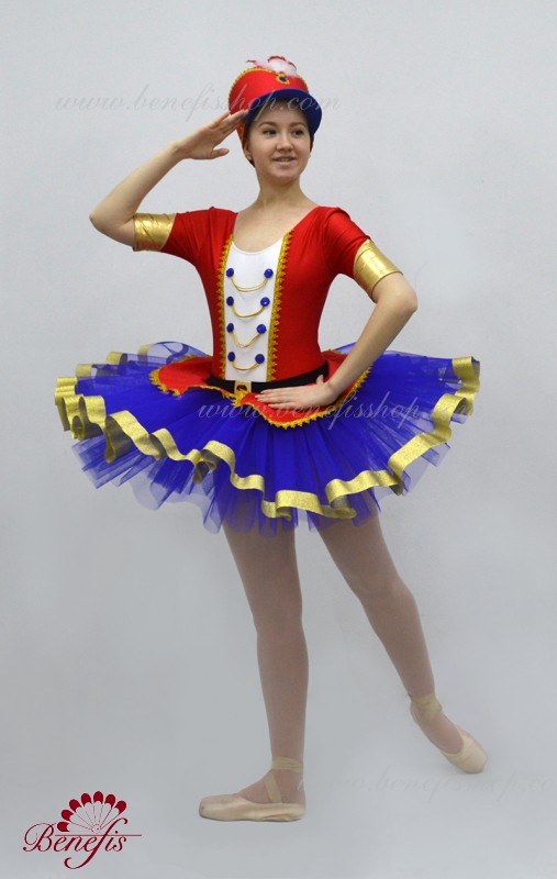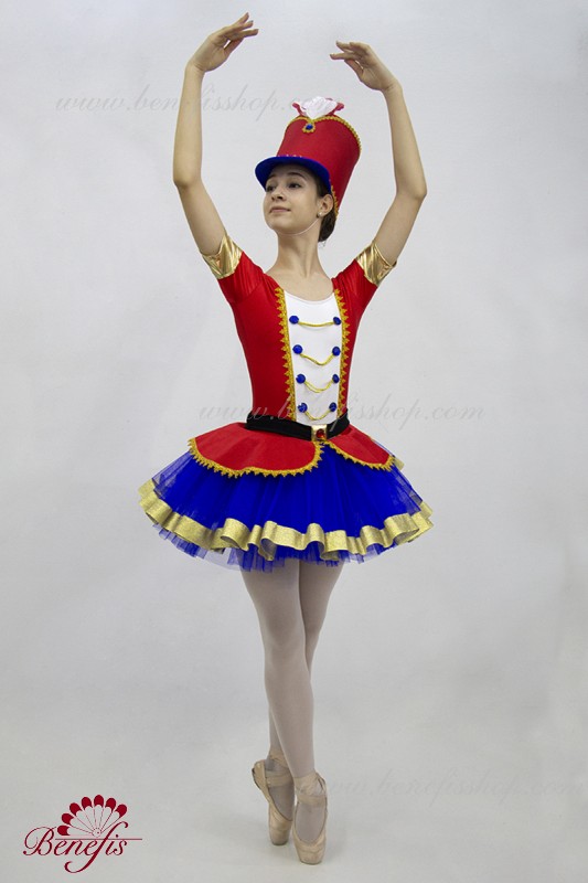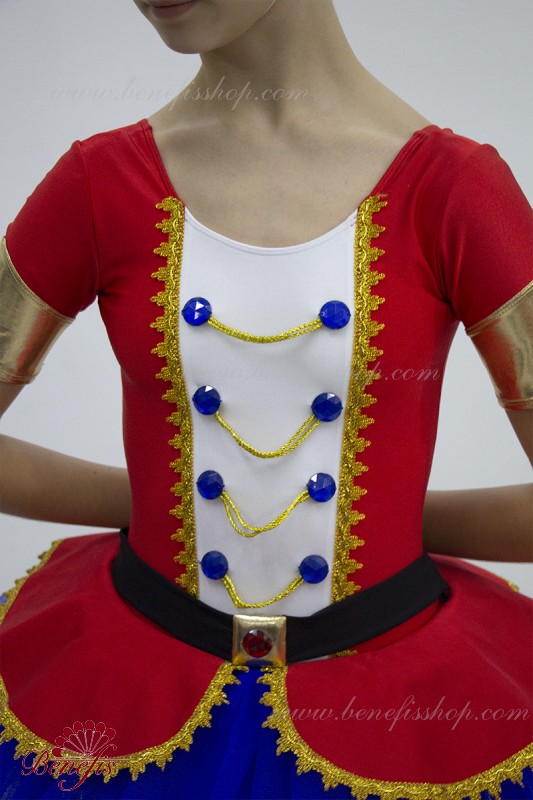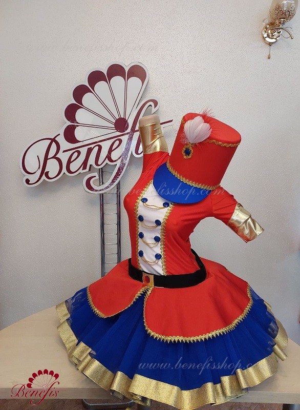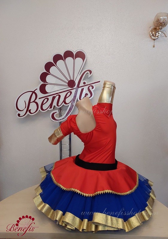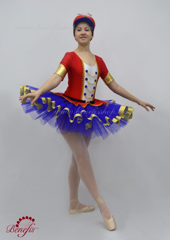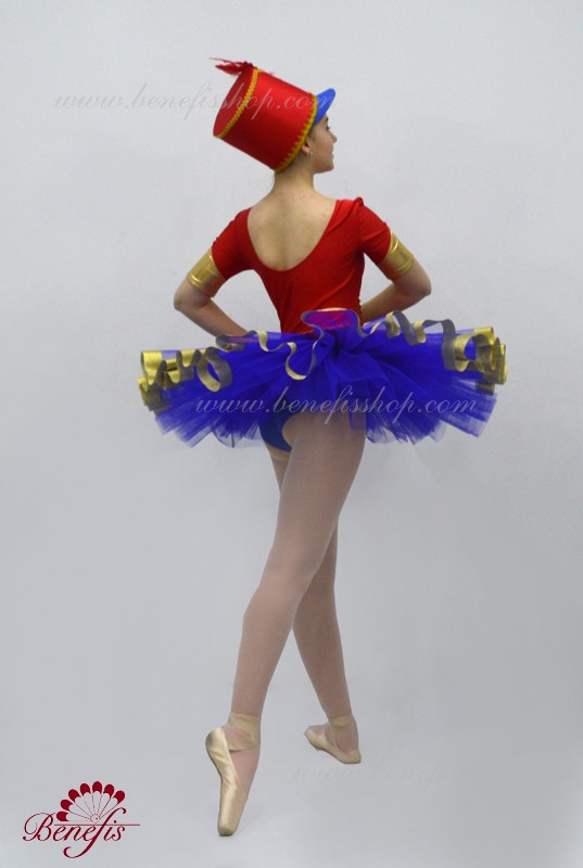 Costumul este realizat pe baza unui costum de baie cu inserție albă în față. Fusta este formată din 3 straturi de tul dur. Volanul superior este decorat cu o panglică largă de culoare aurie. Ca decor se folosește o împletitură, un garou, strasuri.