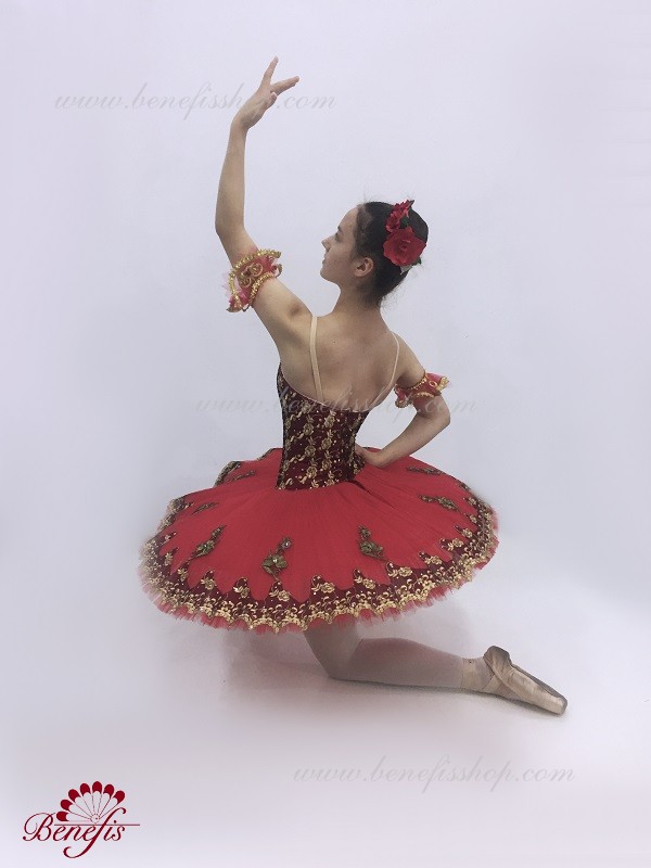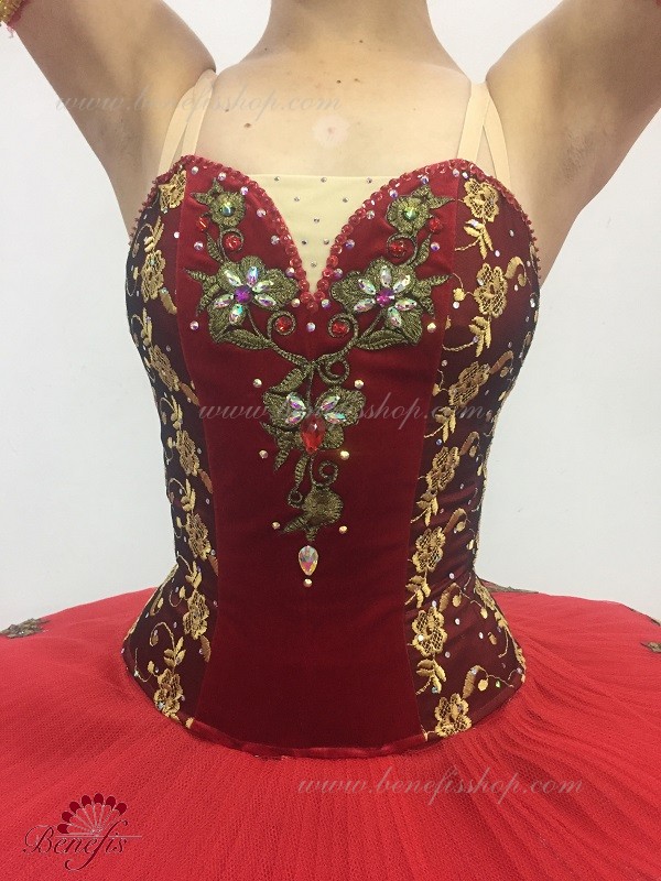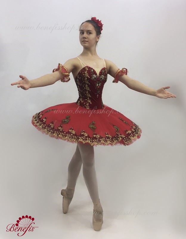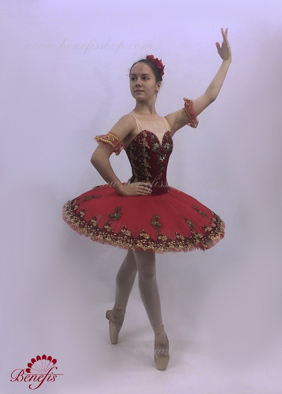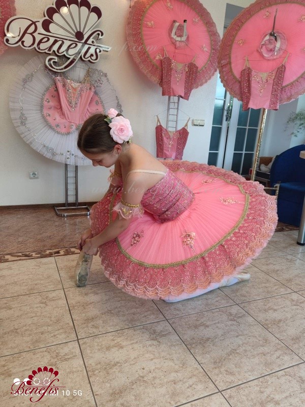 Detalii: costum, banderole. Acest costum de scenă profesional este realizat pe baza fustei de balet profesioniste #T0001B (vezi compartimentul „Fuste de balet de baza si pentru repetitii”). Corsetul din fata este din satin catifelat cu ghipura.