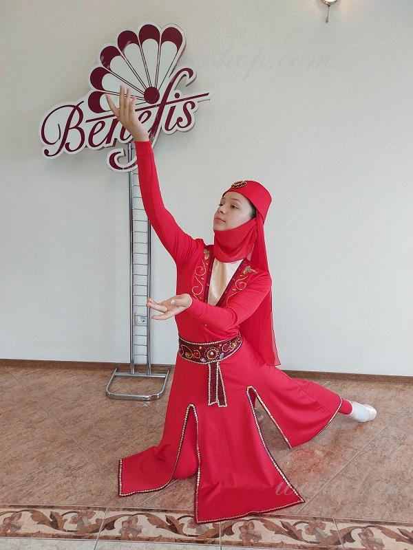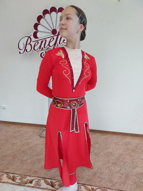 Fabricat din țesătură din lycra stretch.Salopeta fără picioare se bazează pe modelul de bază C0005. Cu adăugiri de elemente - o inserție nudă pe piept, un fermoar pe spate, o bandă elastică pentru un deget pe mânecă. Fusta se poartă separat, se fixează în spate. Țesăturile strălucitoare, aplicațiile, paietele și pietrele sunt folosite ca decor.