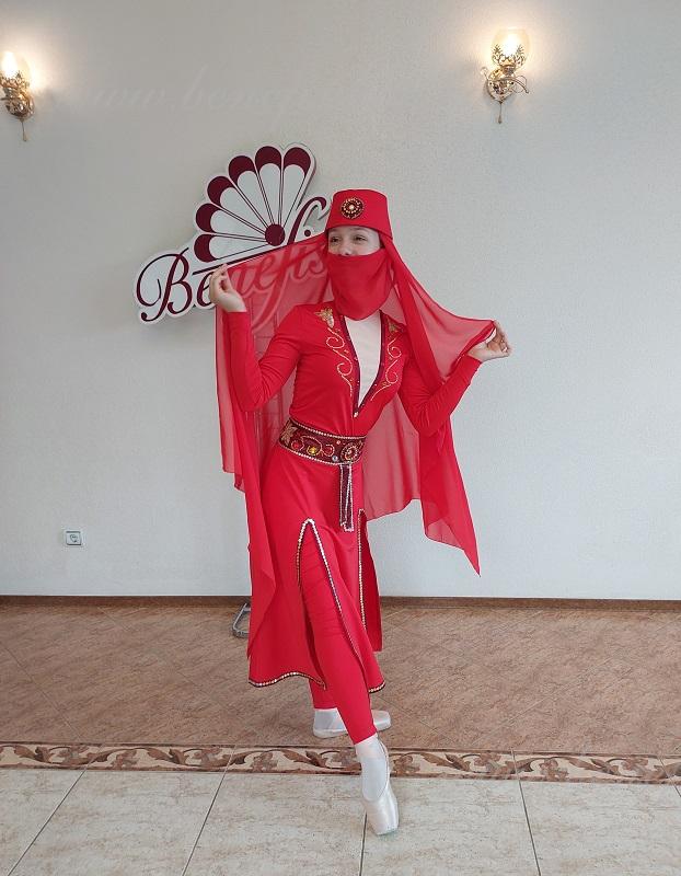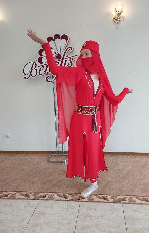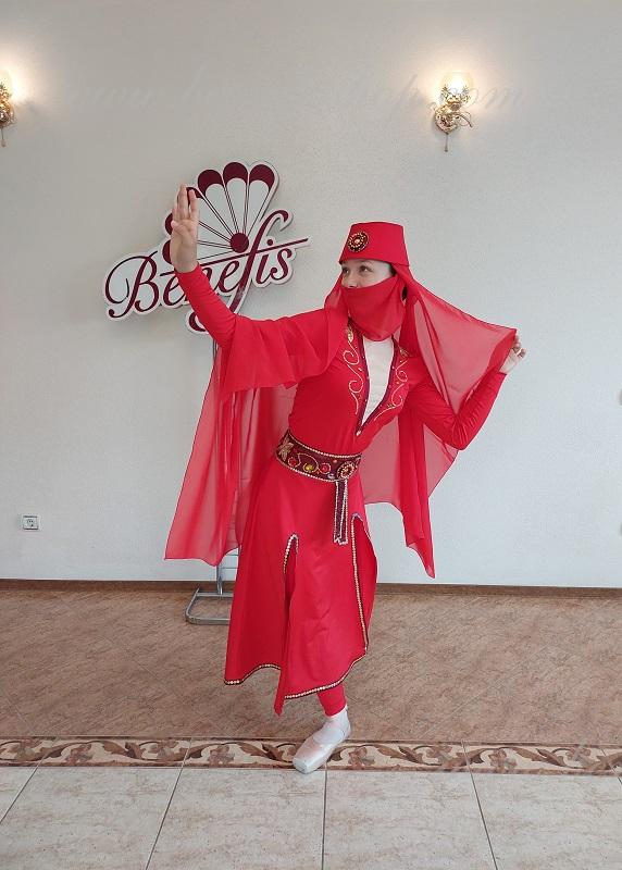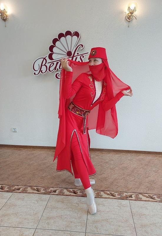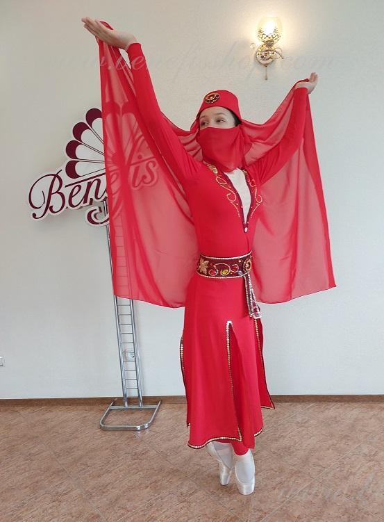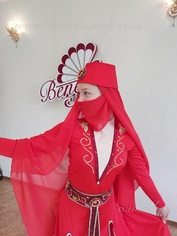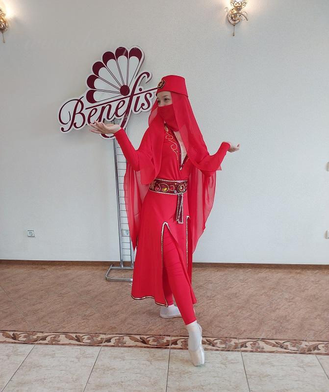 Detalii: salopetă, articol decorativ pentru cap, fustă. Acesta este un costum profesional de scenă.
