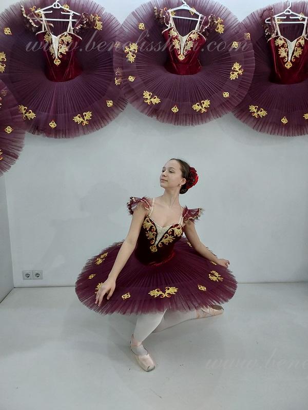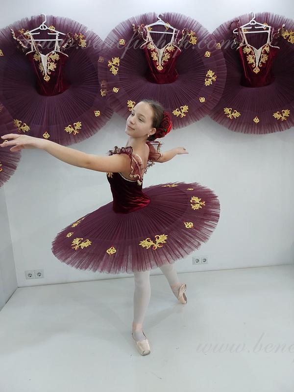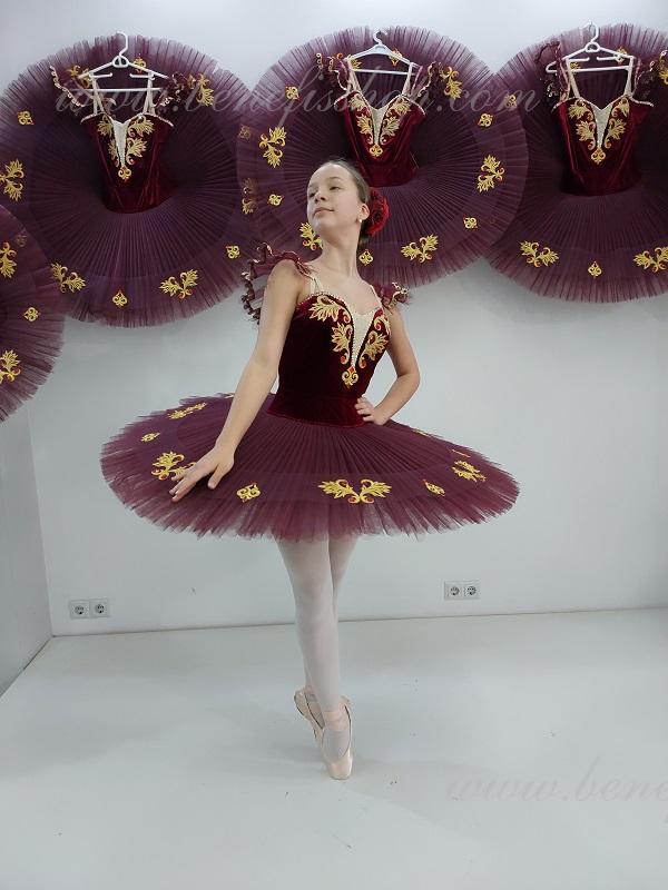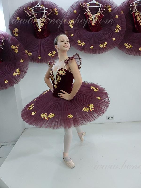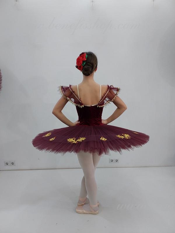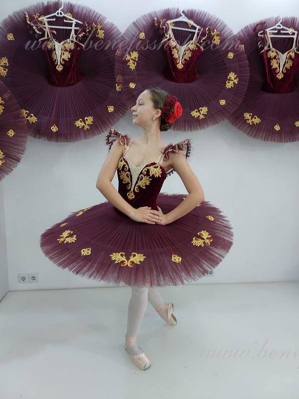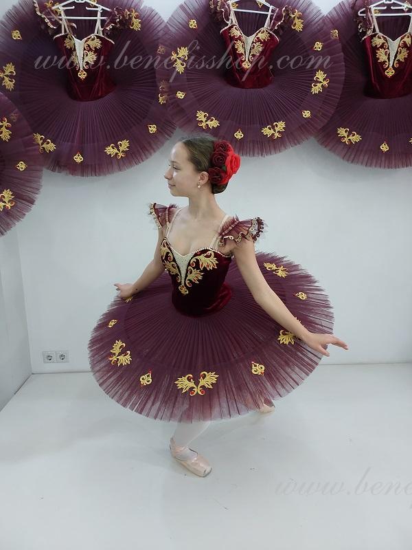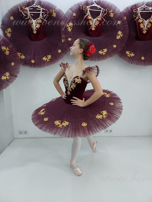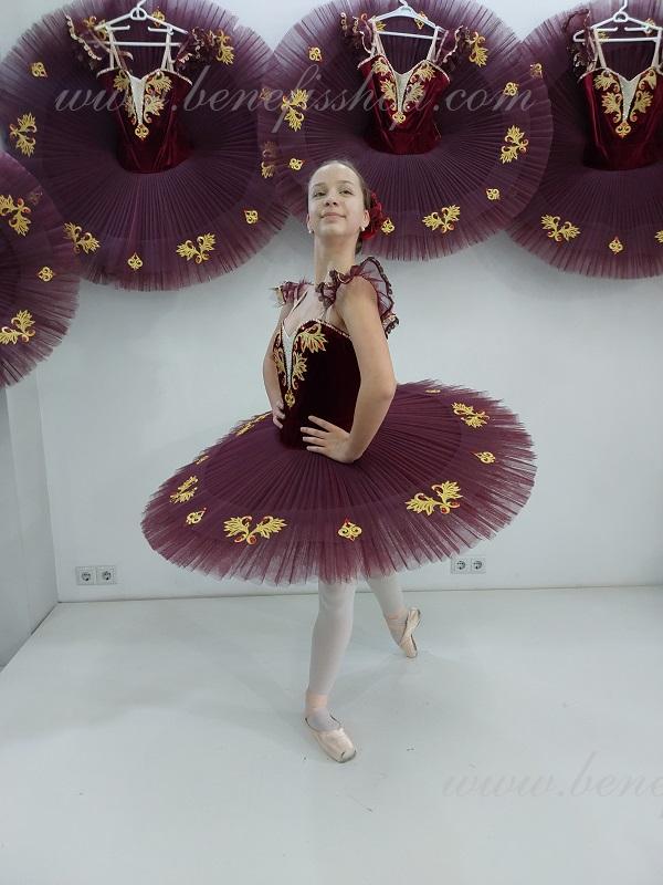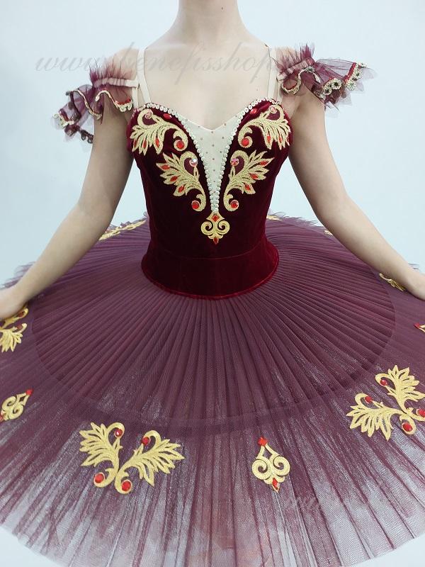 Acest costum profesional de scenă are la bază tutu-ul profesional de bază #T 0001K (vezi secțiunea "fuste de balet de bază"). Acest costum profesional de scenă este realizat în tradiții clasice stricte. Corsetul este confectionat din tesatura densa semi-elastica. Pe piept există o inserție de țesătură elastică de culoare bej. Curele de umăr de culoare bej. Corsetul este fixat cu cârlige în două rânduri pentru o reglare ușoară, iar cordonul interior este folosit pentru a strânge corsetul în zona pieptului. Decorul este realizat cu aplicații rafinate din aur sau argint. Decorarea produsului este realizată manual.