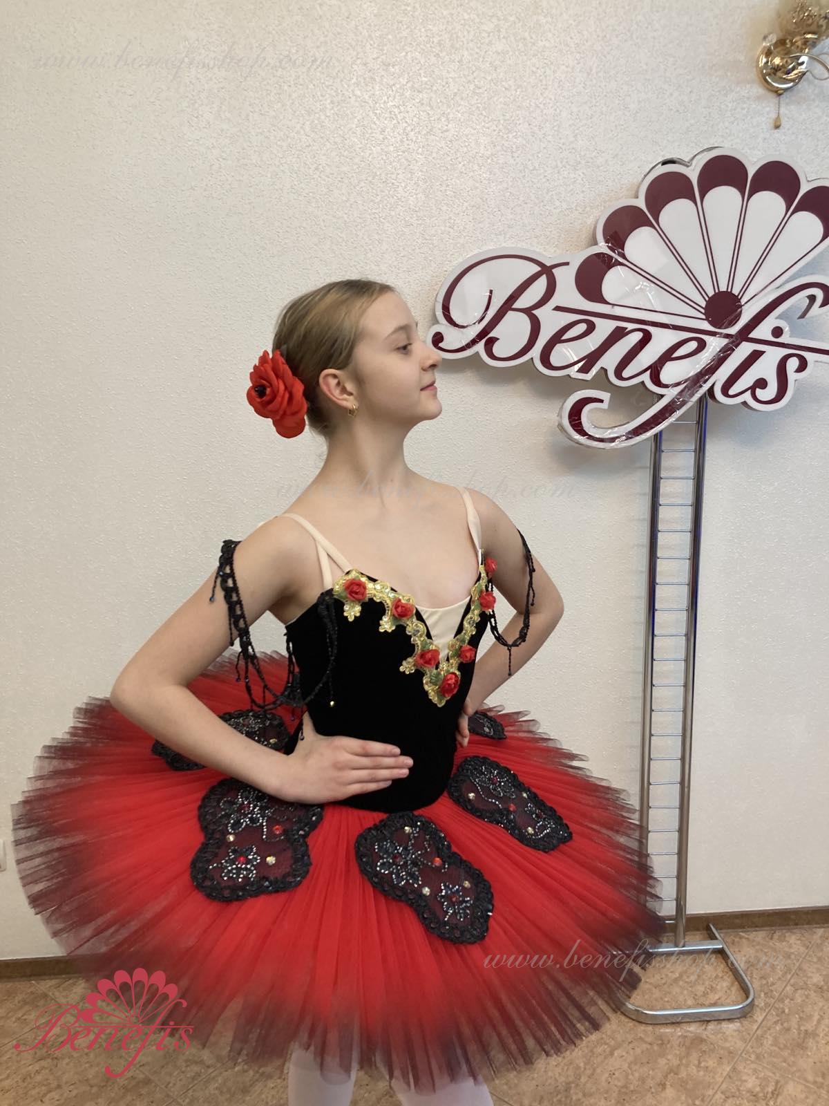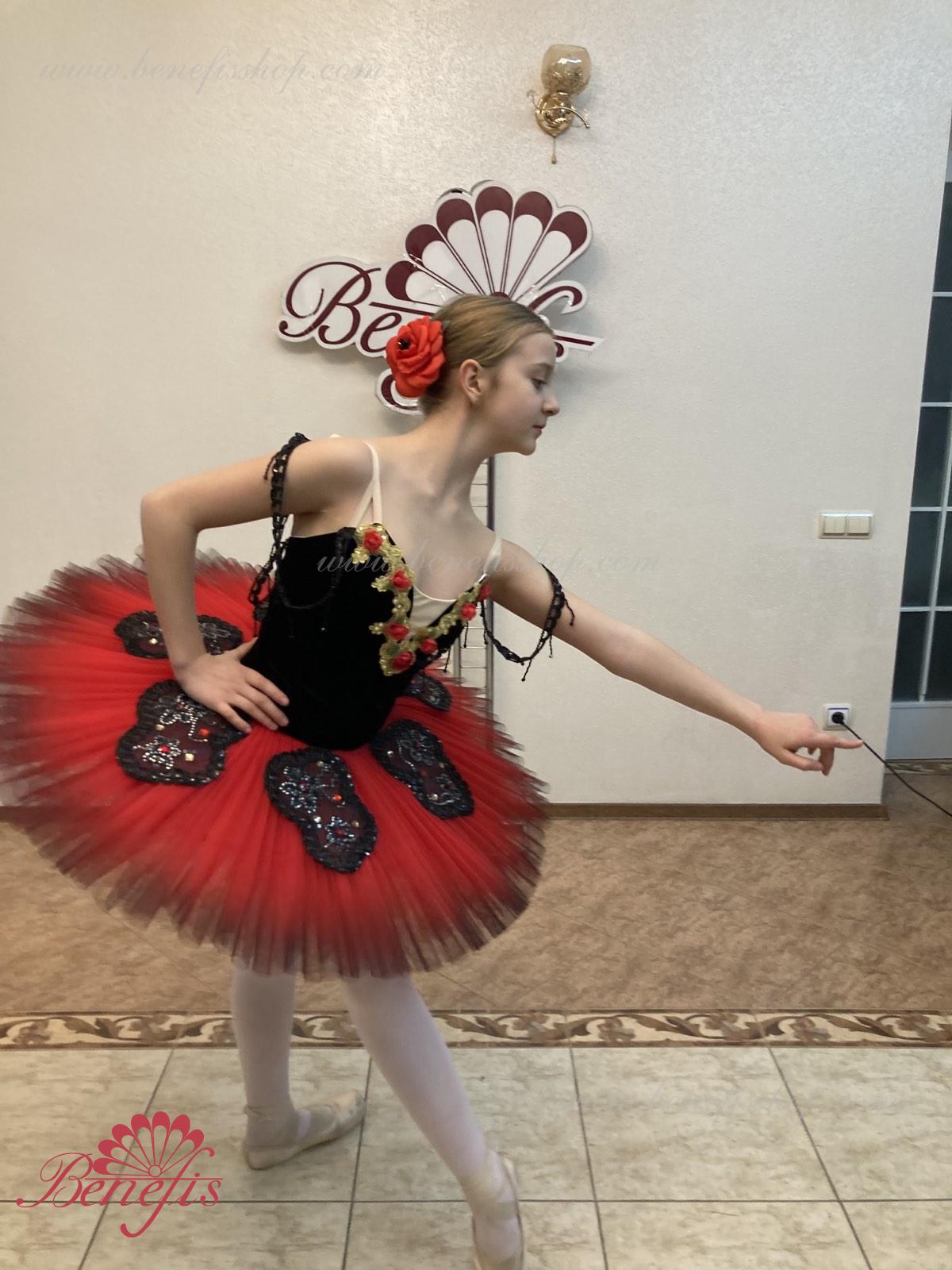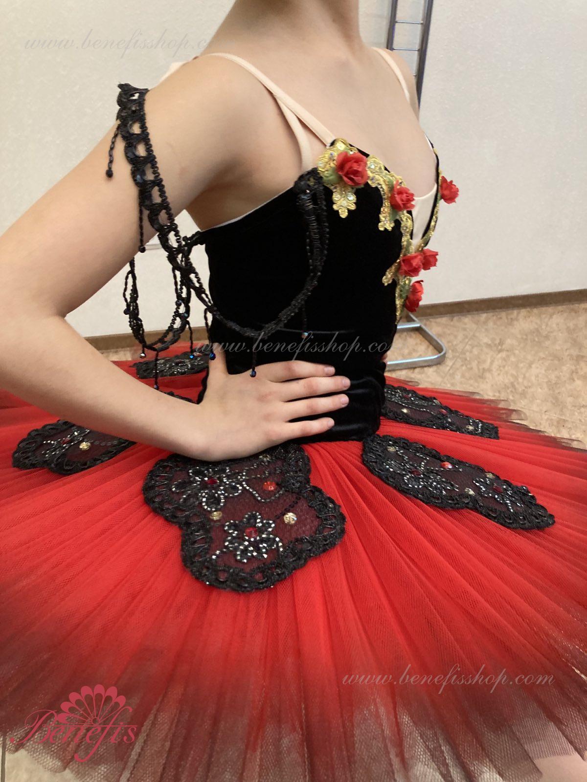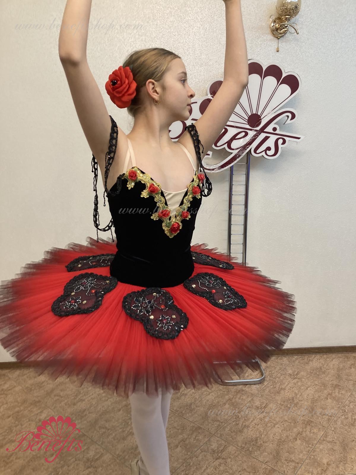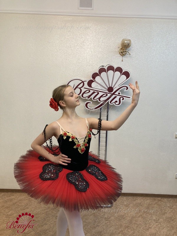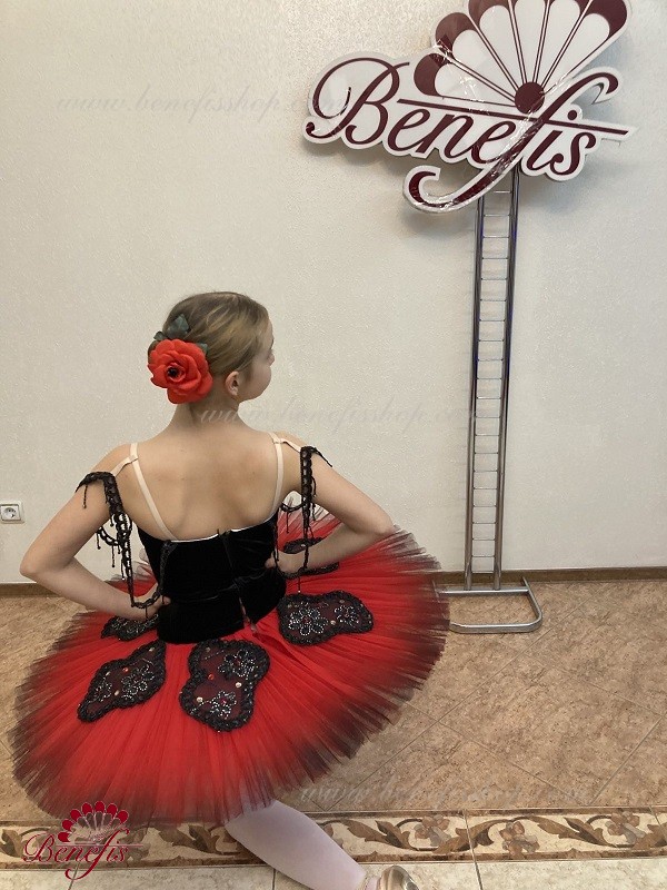 Corsetul este fixat la spate într-un rând de cârlige-chingi, în interiorul cablului este folosit pentru a regla dimensiunea în zona pieptului. Opt straturi gradate plisate de tul semi-moale - șapte lungi și unul scurt pe chiloți din tul cu jug de 10 cm atașat la o talie elastică. Două cercuri de crinolină sunt încorporate în stratul mijlociu cu două bibelouri scurte suplimentare la margini. Lungimea stratului superior este de 36-38 cm, fiecare strat următor este cu 4 cm mai scurt. Fusta este fixata în spate cu 6 cârlige și bucle mari. Strasuri, paiete, împletitură, flori din satin sunt folosite ca decor al fustei de balet și al corsetului. Acest decor arată grozav de pe scenă.
