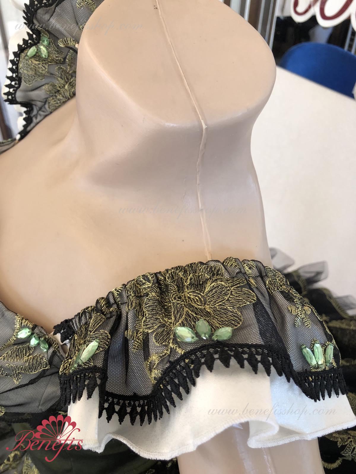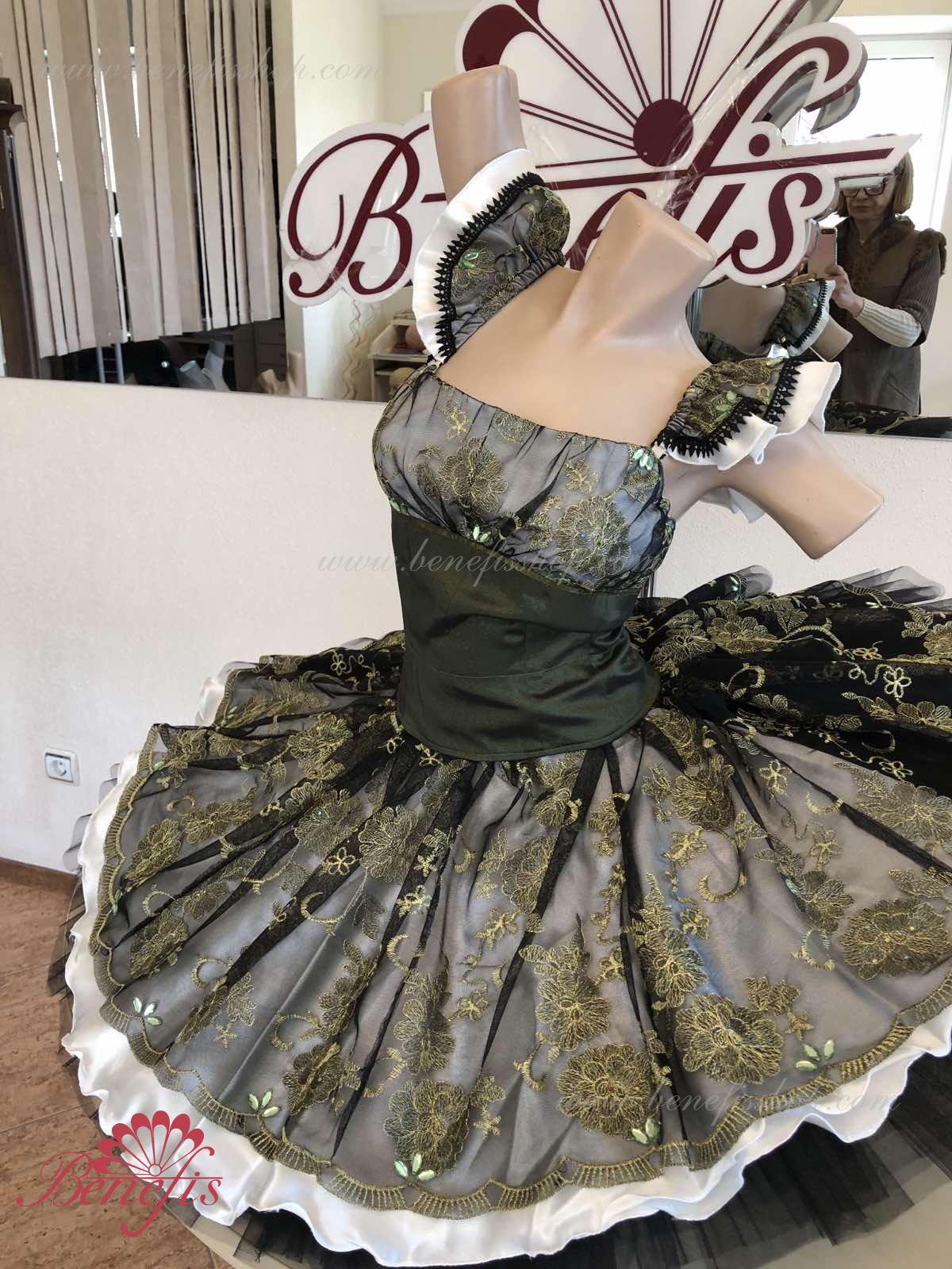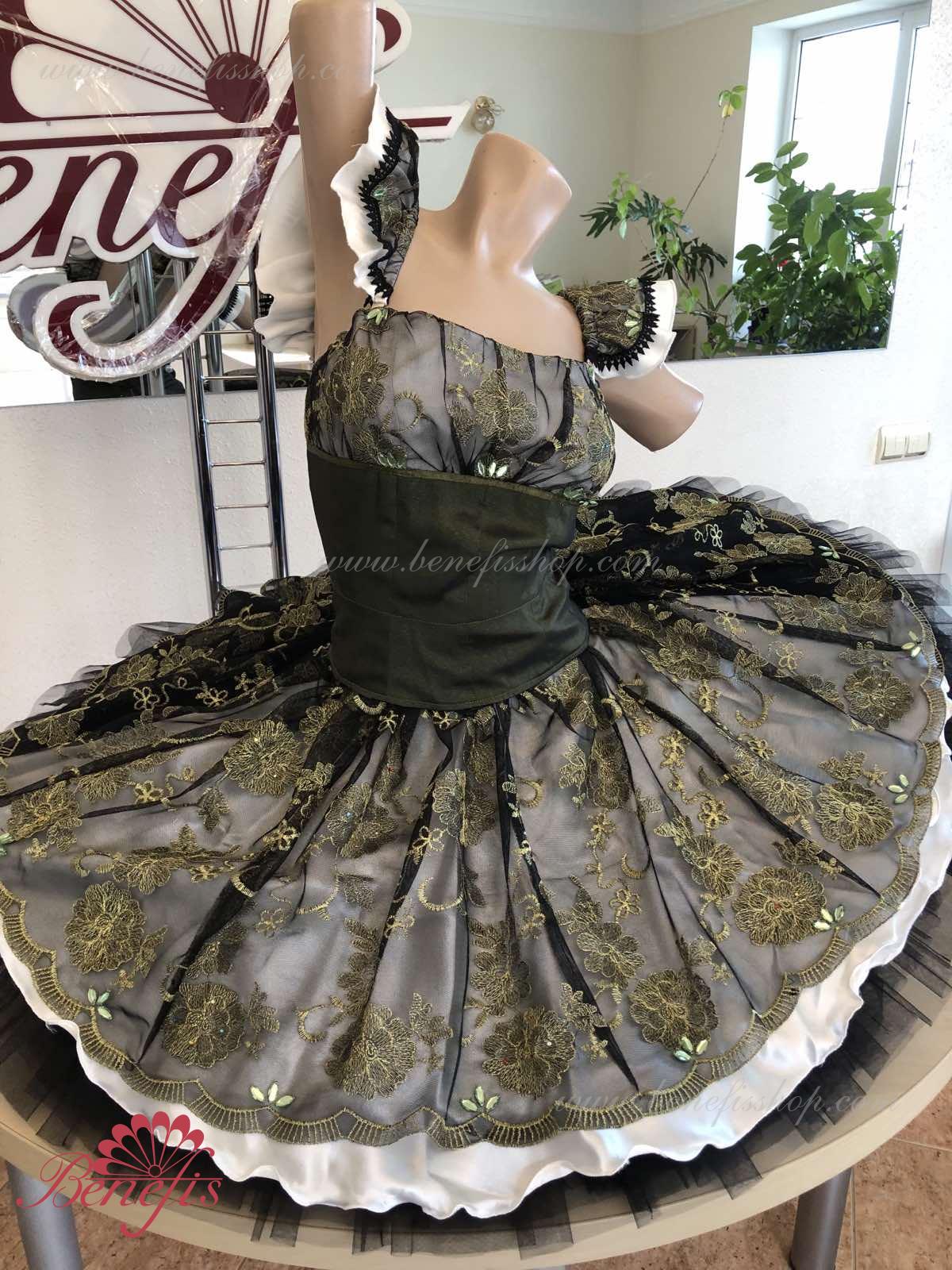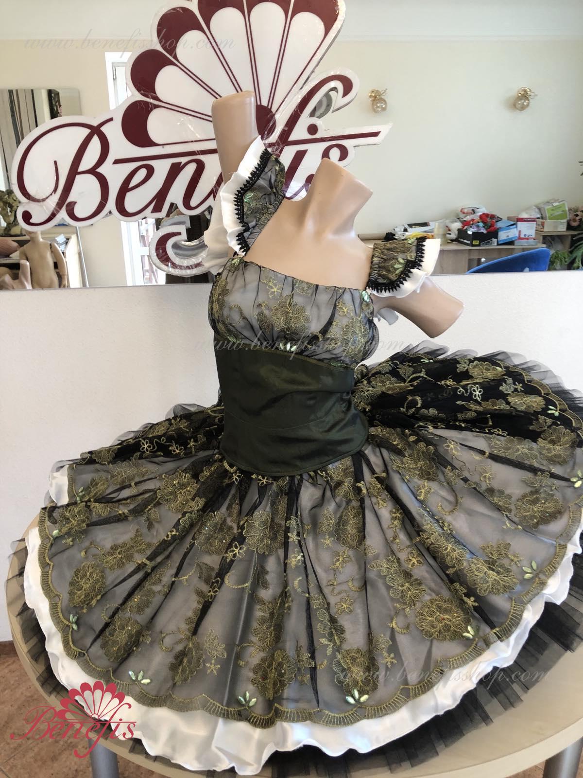 Detalii: rochie. Acesta este un costum de balet profesionist. Corsetul este fixat la spate cu două rânduri de cârlige. În zona pieptului, corsetul este fixat cu un cordon intern în zona pieptului. Baza se bazează pe modelul de bază T0001r realizat din tul moale și dur. Ca decor, se folosesc aplicații, panglică de dantelă.