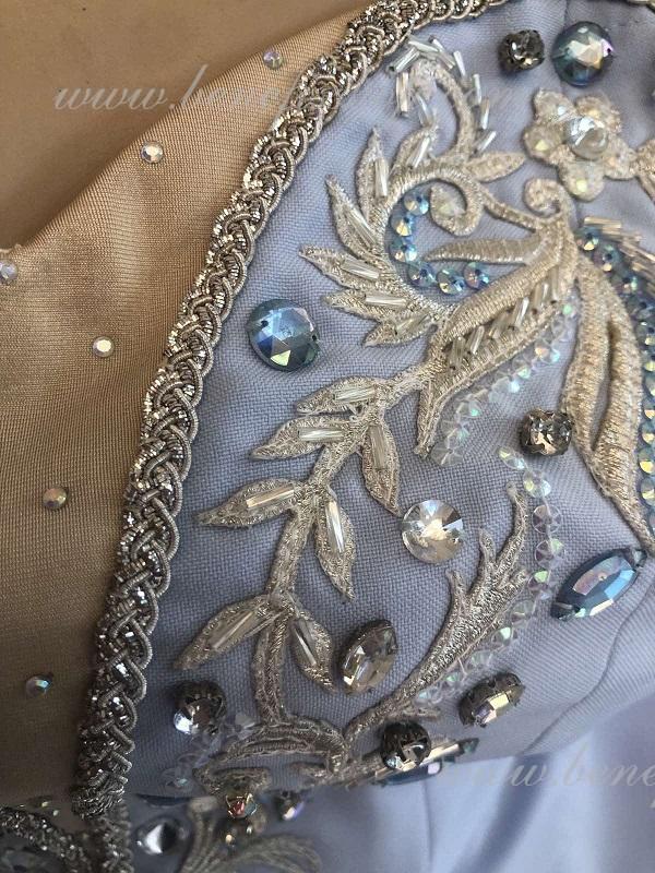 Decorul într-un stil restrâns este realizat în combinație cu tonul costumului. Au fost utilizate un număr mare de aplicații, împletituri, strasuri mari și mici, paiete, mărgele și mărgele de sticlă.Acest costum de balet este perfect pentru spectacolul "Spărgătorul de nuci".