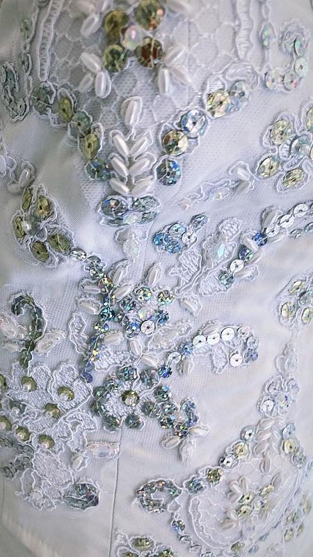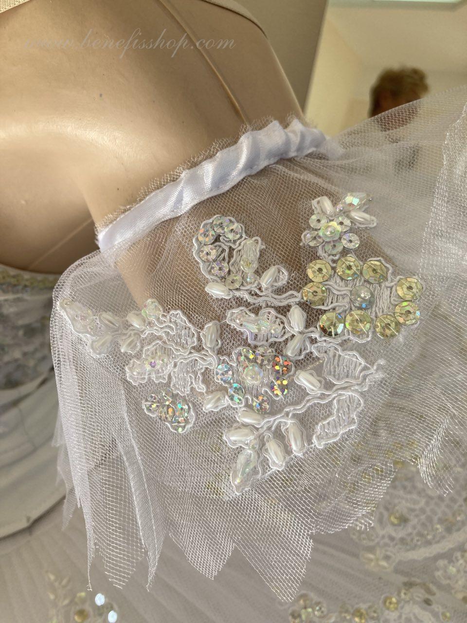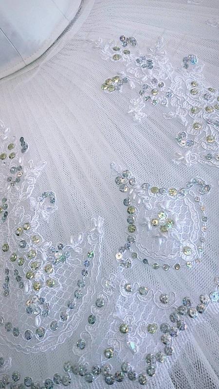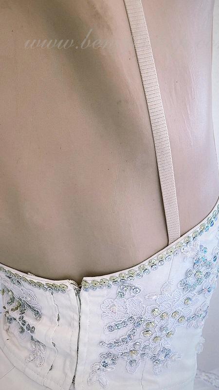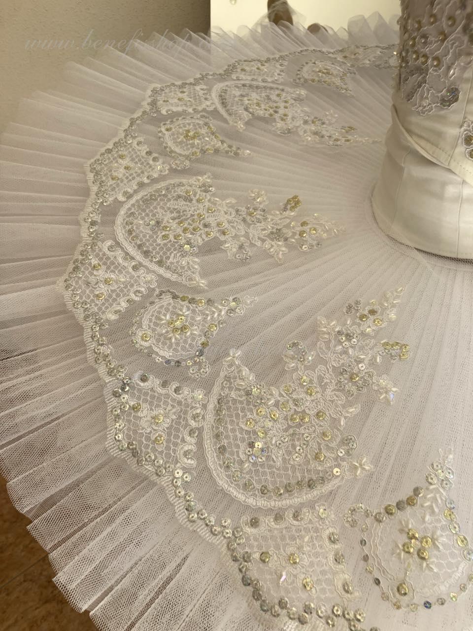 Corsetul se prinde cu ajutorul cîrligelor în doua rînduri pentru reglare comodă, iar cordonul intern permite tragerea corsetului în zona pieptului.Opt straturi plisate gradate de tul semi-moale - sapte lungi si un scurt, aseazate pe chilotei din tul cu platca de 10 cm fixata pe centura elastica.