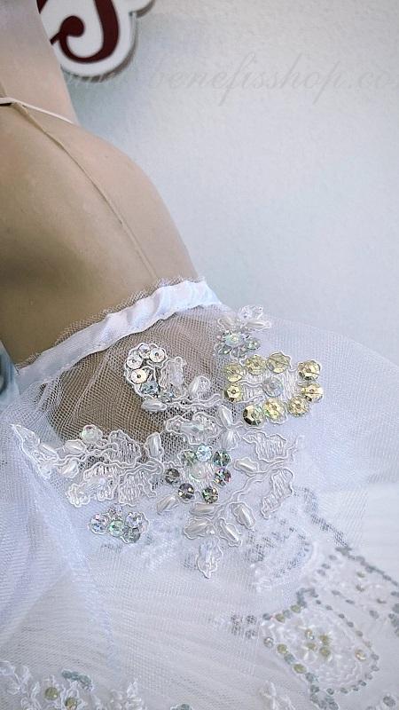 Sase cirlige mari si ochetele sunt fixate din urma.Decorul din Guipure este decorat cu paiete și strasuri.