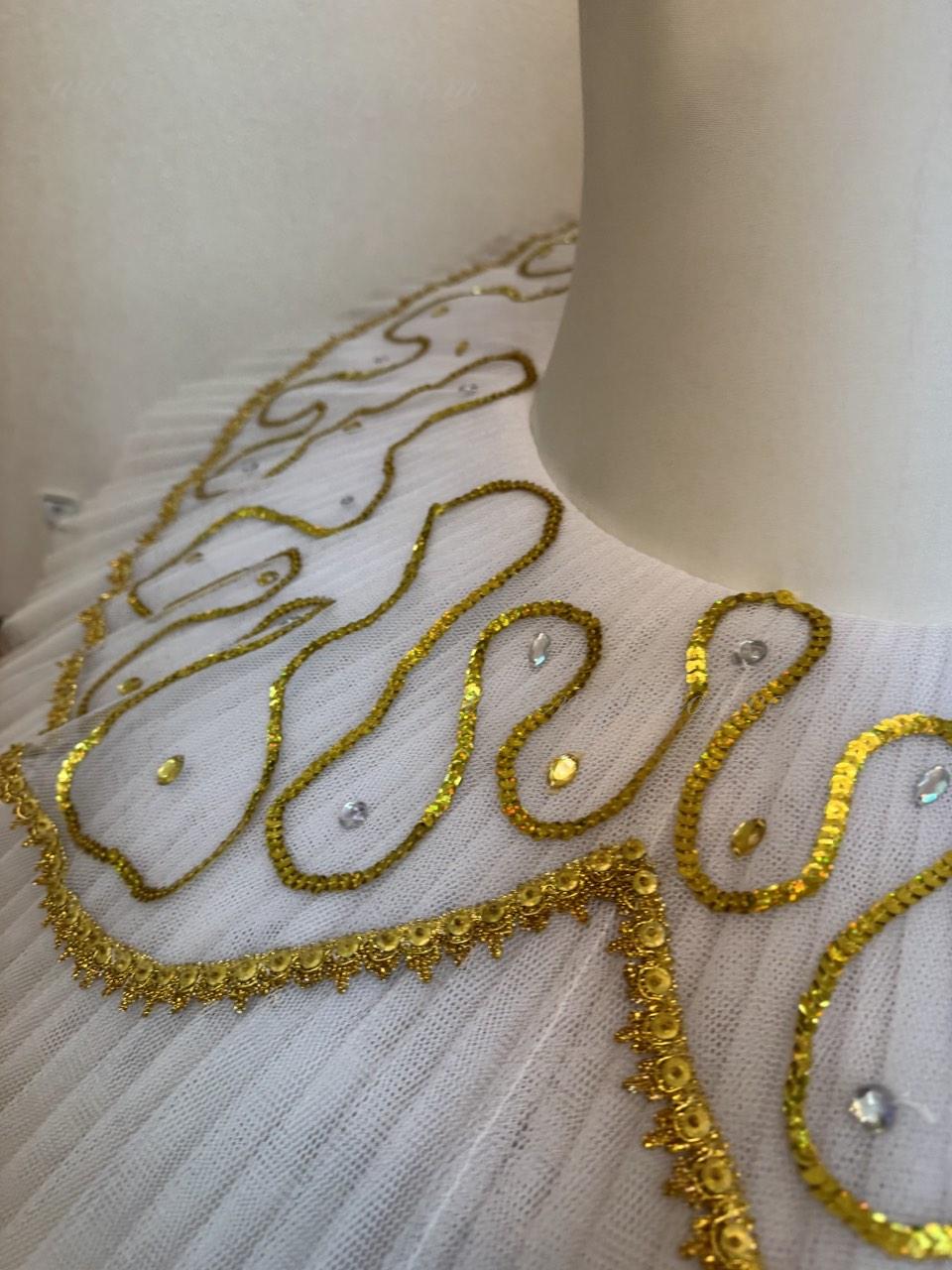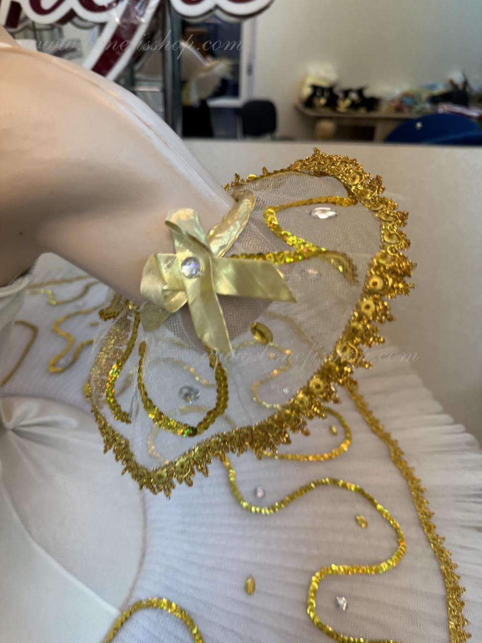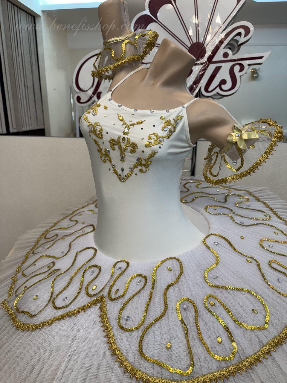 Acest costum de balet concert este indeplinit in baza unui tricou elastic si a fustei cu cercuri. Corsetul si stratul superior al fustei este decorat cu aplicatii aurii sau argintii, cristale de diferite marimi. Marginea stratului superior al fustei si minecute sunt impodobite cu panglica aurie sau argintie.