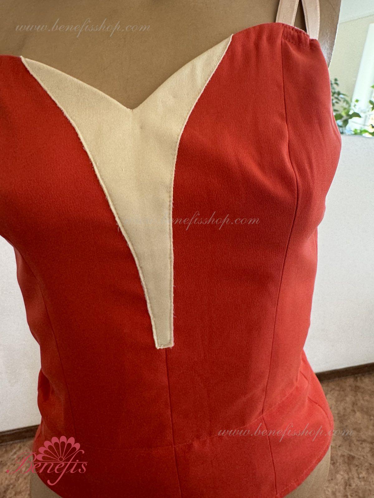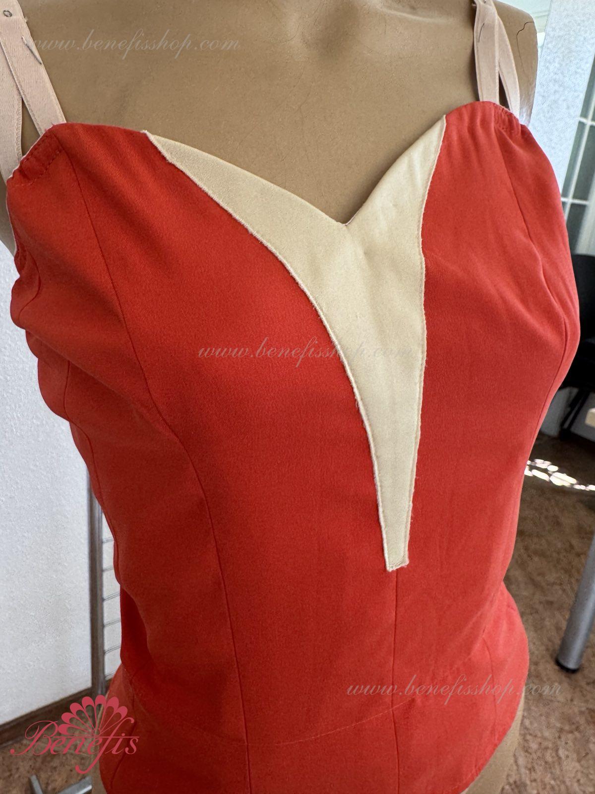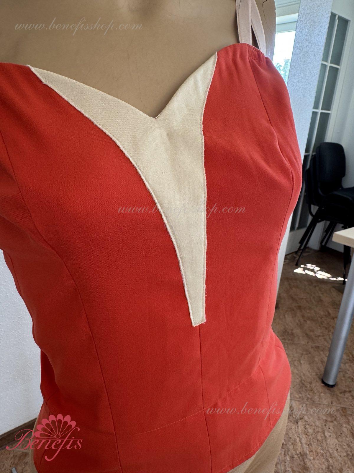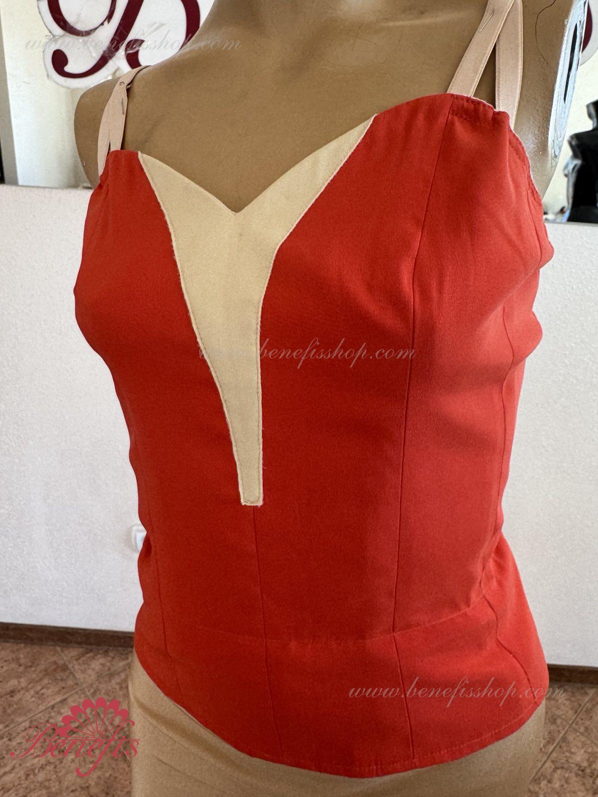 Detalii: Corsetul este confectionat din tesatura densa semi-stretch. Pe corset sunt prezente doua rinduri de chirlige pentru regularea comoda si un snur intern pentru stringerea corsetului la nivelul pieptului.Pe piept se intrevede o insertie de culoarea pielii. Chingele sunt de culoarea pielii.