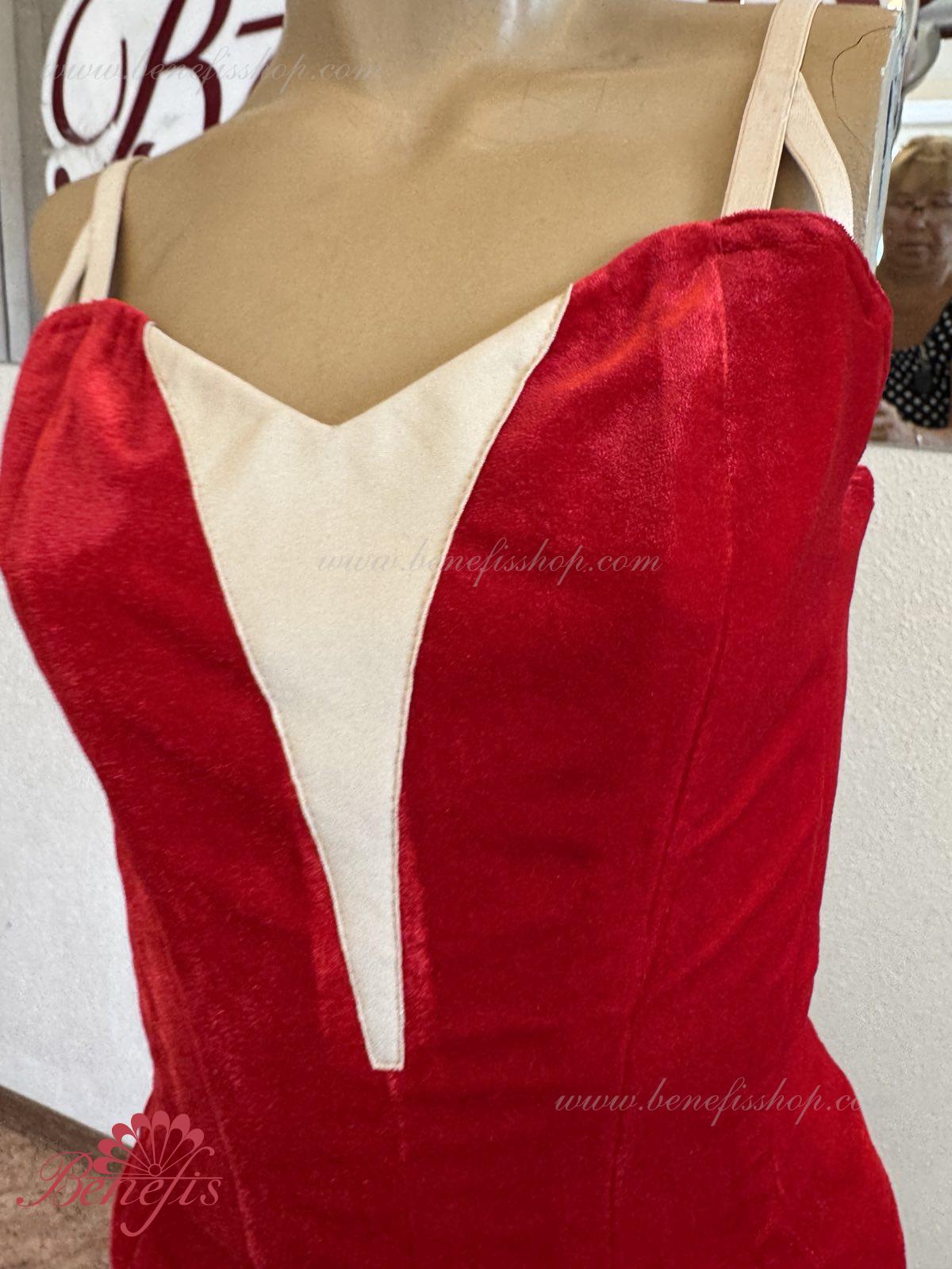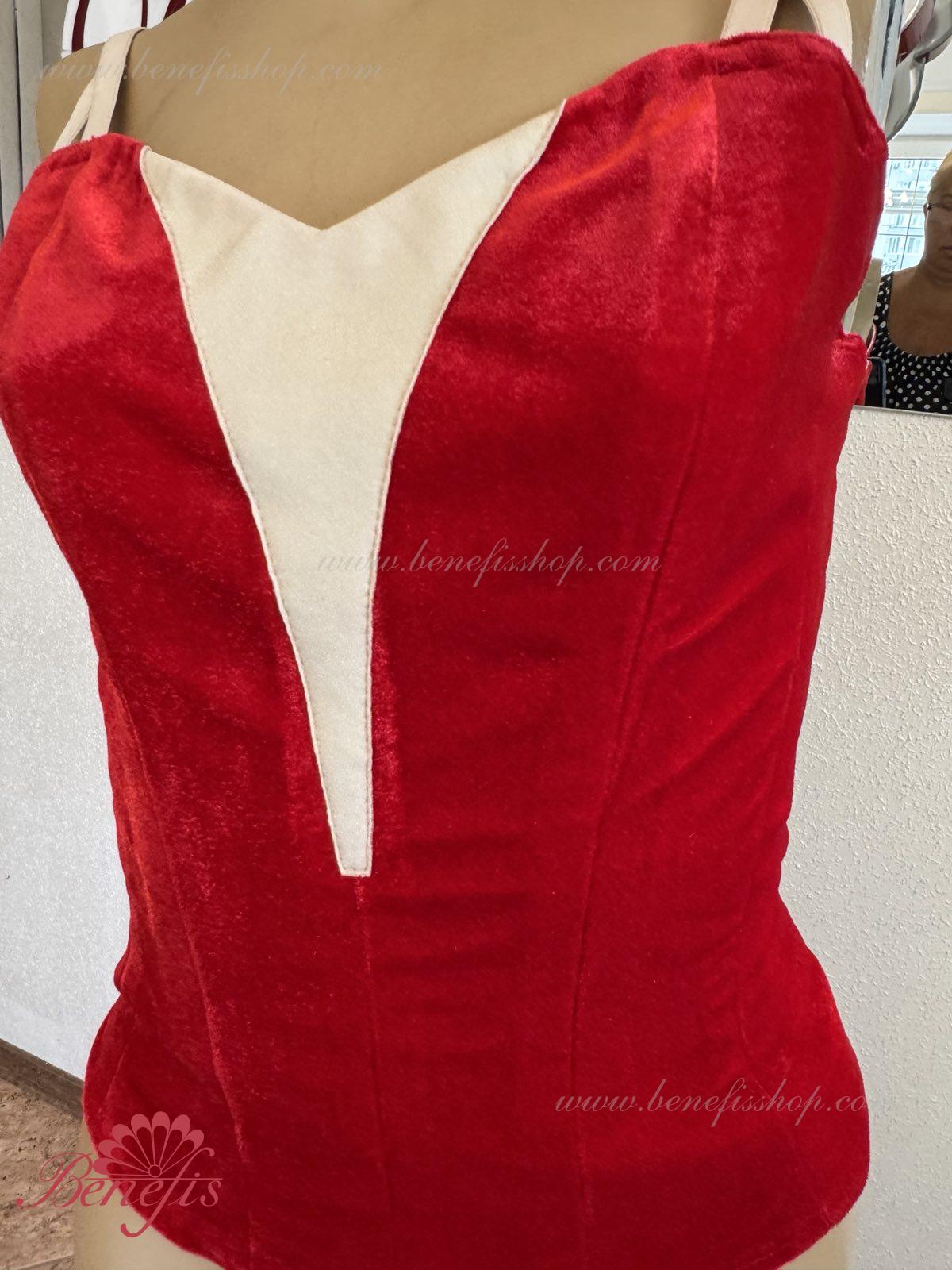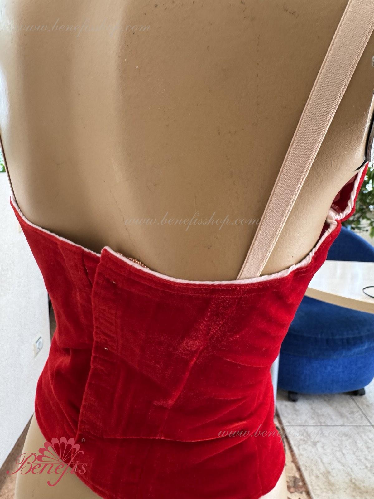 Detalii: Corsetul este confectionat din catifea.. Pe corset sunt prezente doua rinduri de chirlige pentru regularea comoda si un snur intern pentru stringerea corsetului la nivelul pieptului.Pe piept se intrevede o insertie de culoarea pielii. Chingele sunt de culoarea pielii.