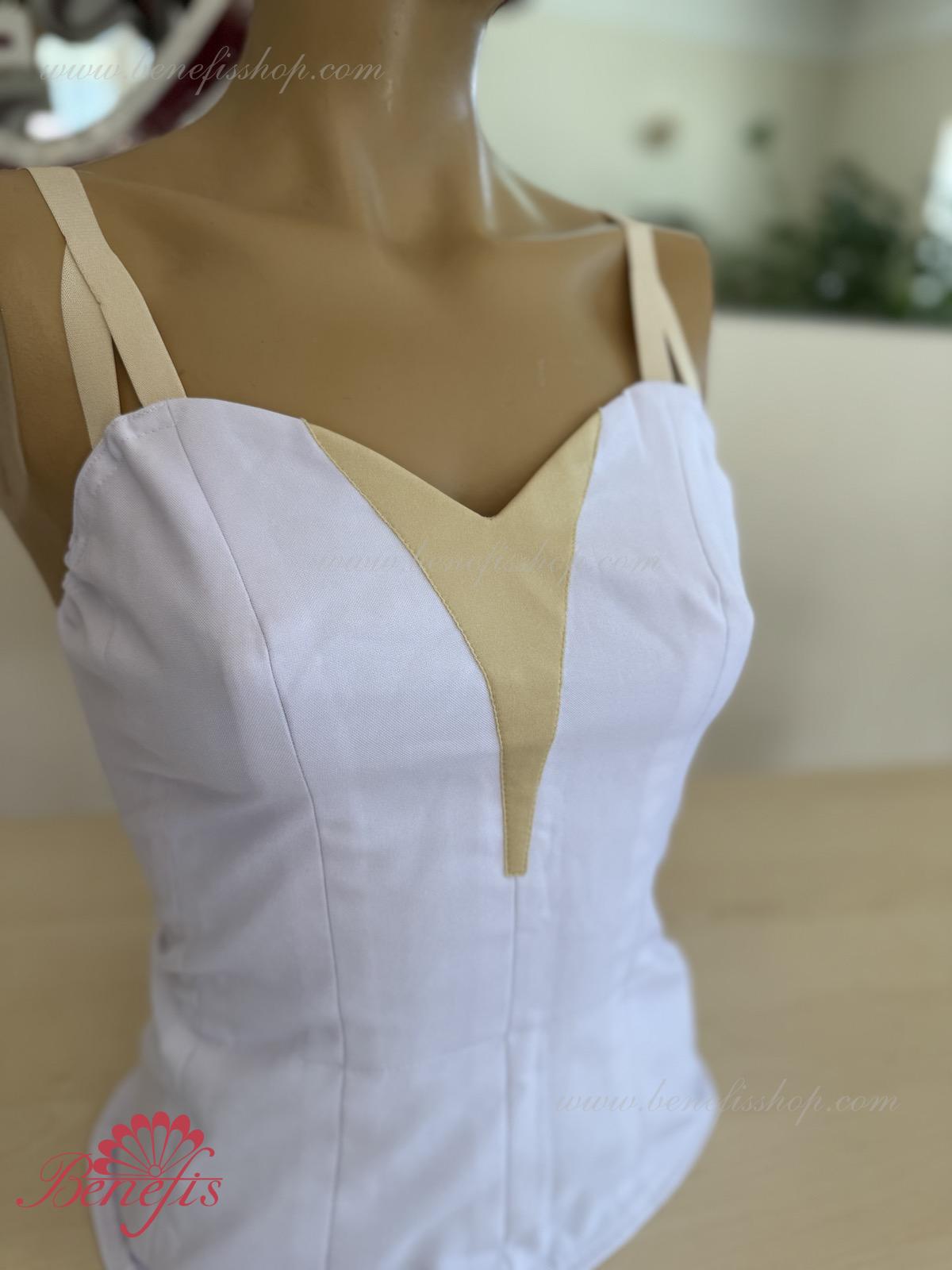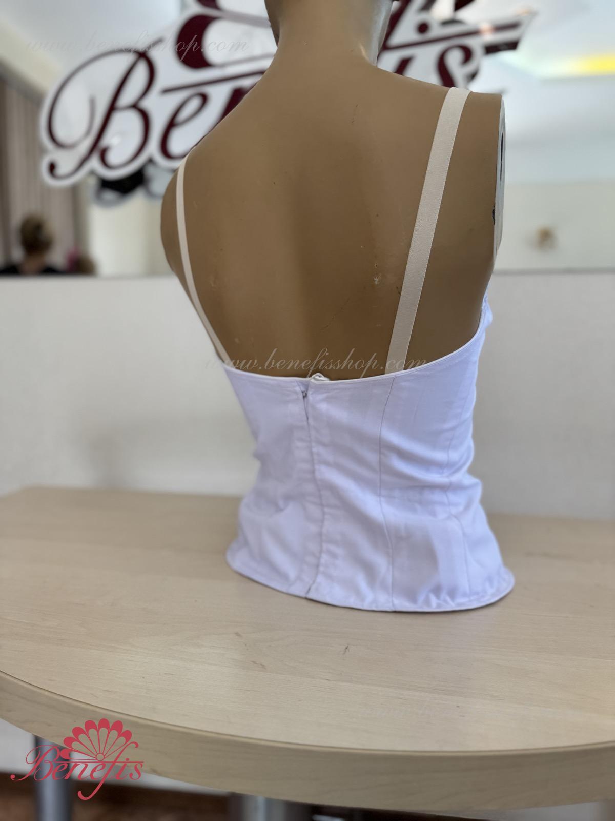 Detalii: Corsetul este confectionat din tesatura densa semi-stretch. Pe corset sunt prezente doua rinduri de chirlige pentru regularea comoda si un snur intern pentru stringerea corsetului la nivelul pieptului.Pe piept se intrevede o insertie de culoarea pielii. Chingele sunt de culoarea pielii.
