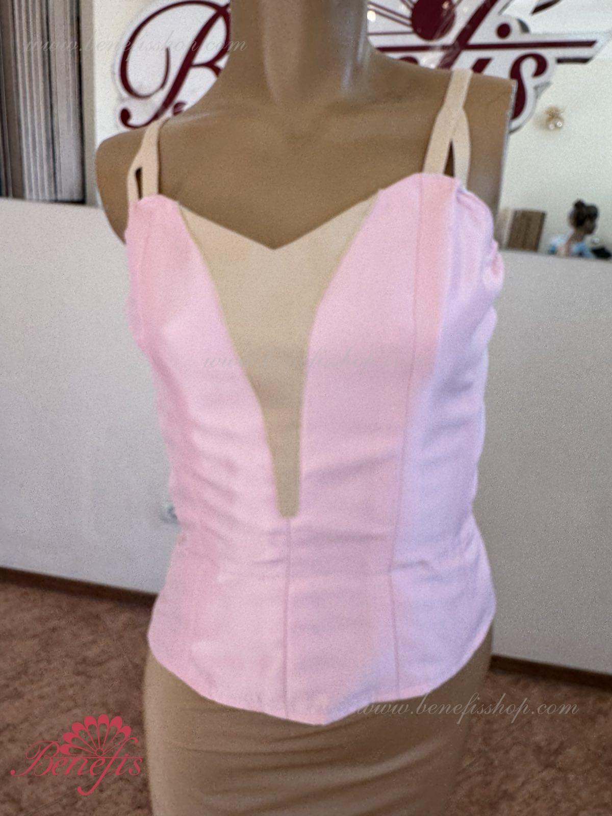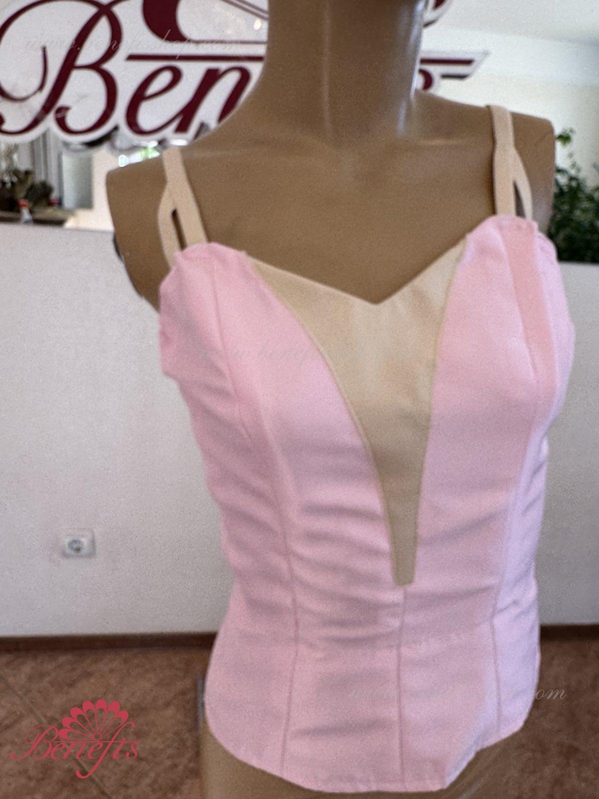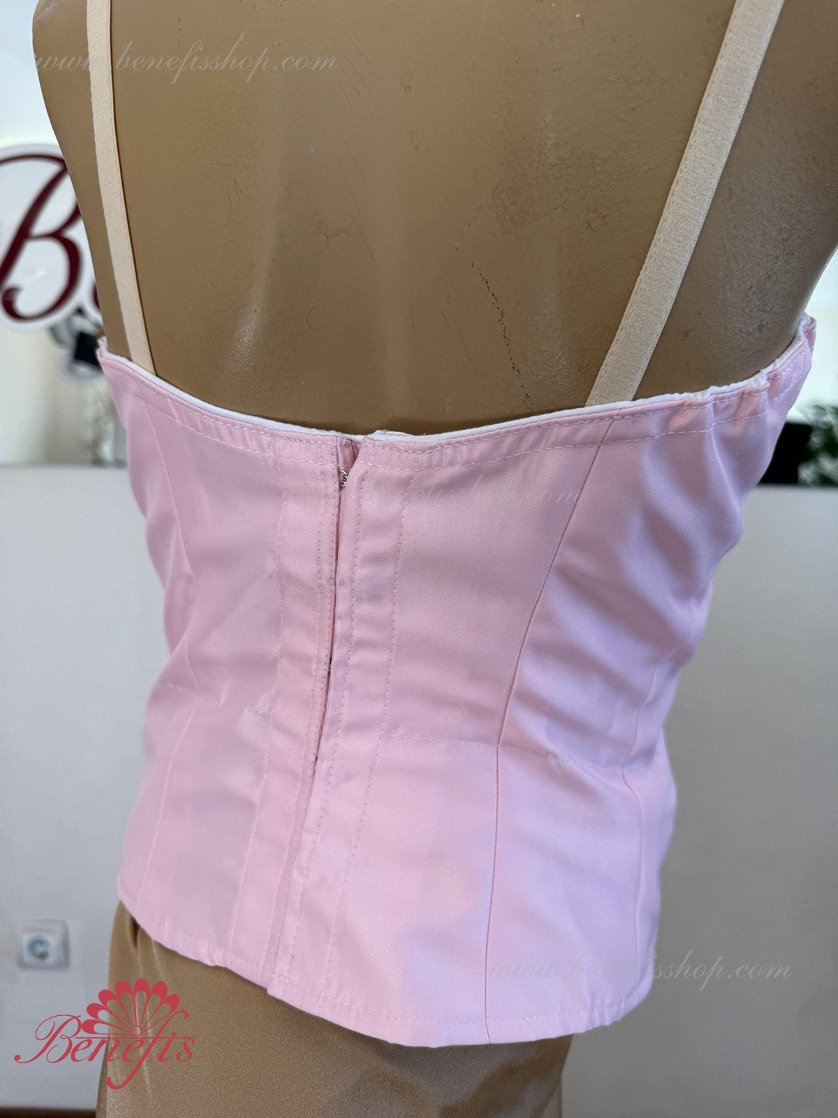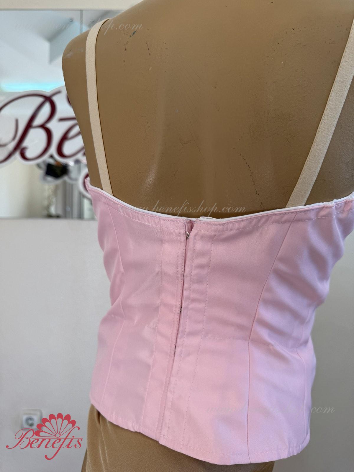 Detalii: Corsetul este confectionat din tesatura densa semi-stretch. Pe corset sunt prezente doua rinduri de chirlige pentru regularea comoda si un snur intern pentru stringerea corsetului la nivelul pieptului.Pe piept se intrevede o insertie de culoarea pielii. Chingele sunt de culoarea pielii.