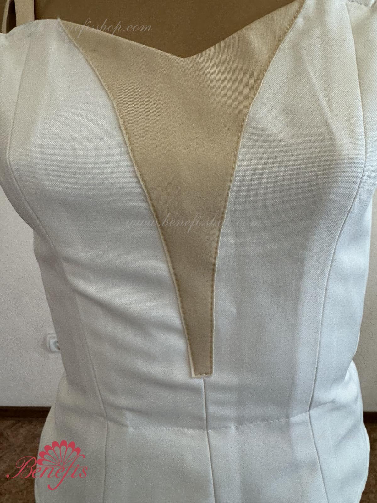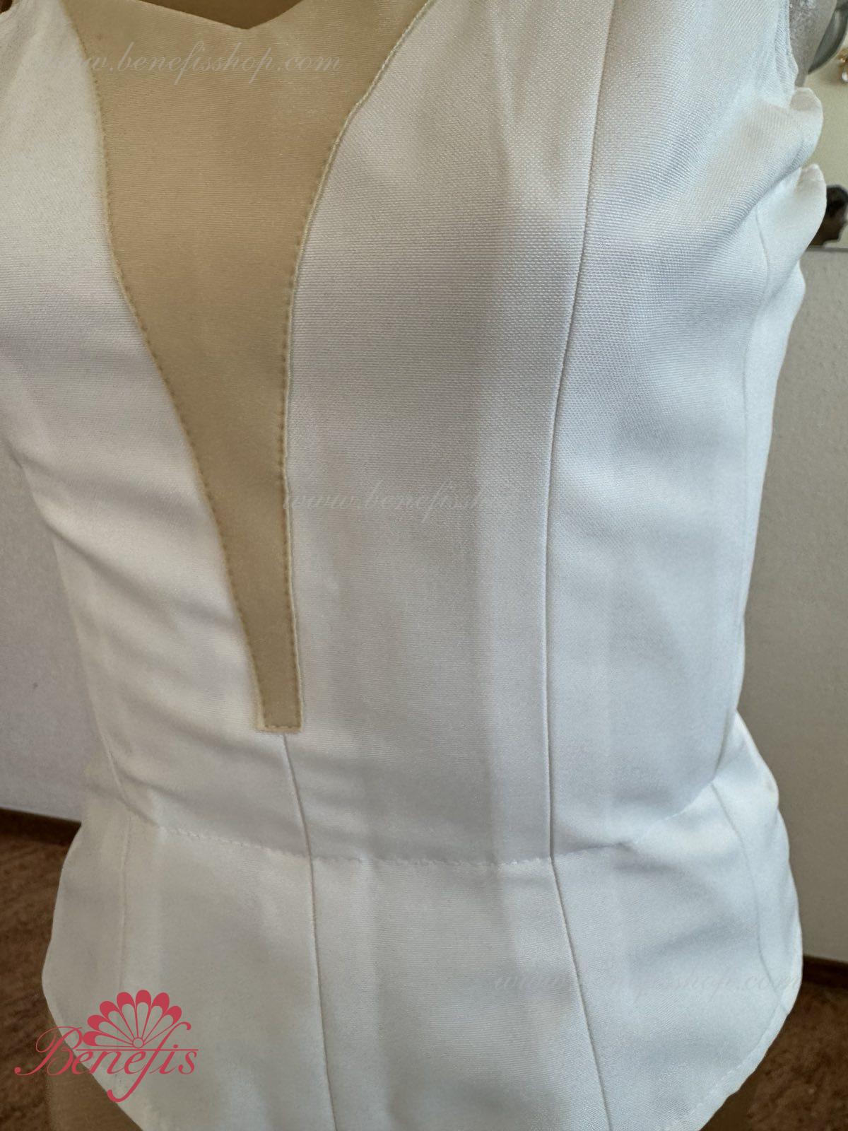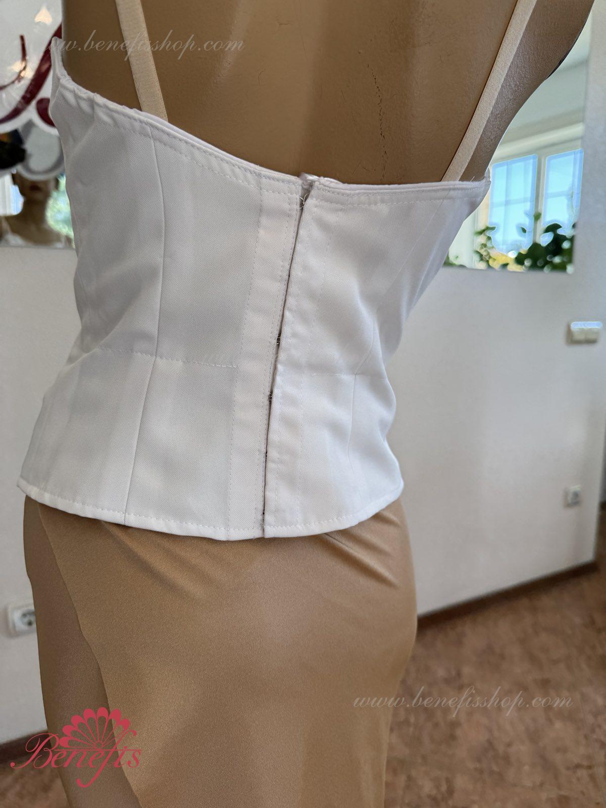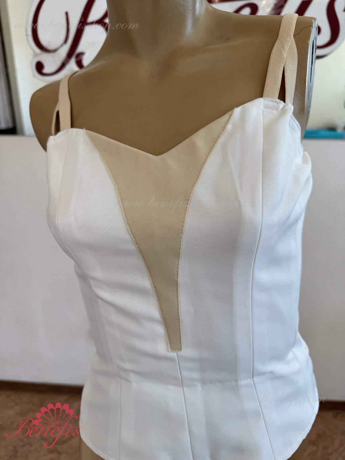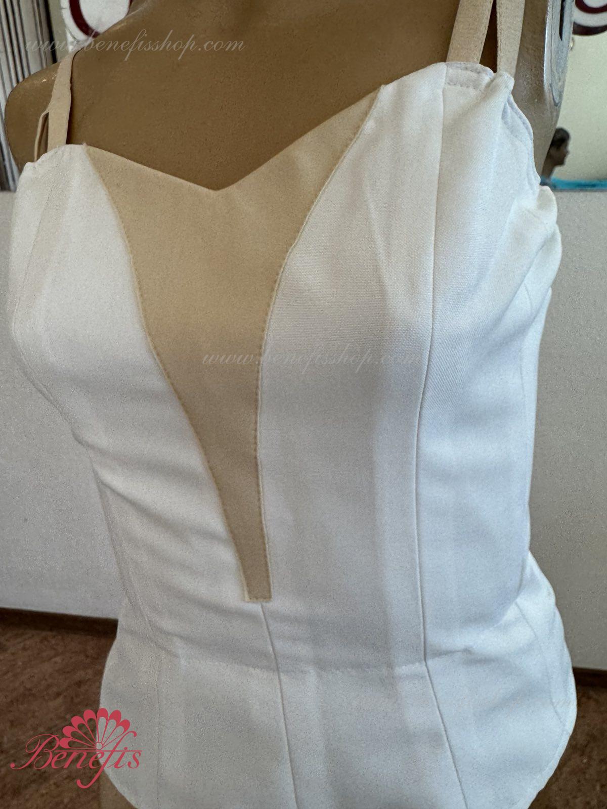 Detalii: Corsetul este confectionat din tesatura densa semi-stretch. Pe corset sunt prezente doua rinduri de chirlige pentru regularea comoda si un snur intern pentru stringerea corsetului la nivelul pieptului.Pe piept se intrevede o insertie de culoarea pielii. Chingele sunt de culoarea pielii.