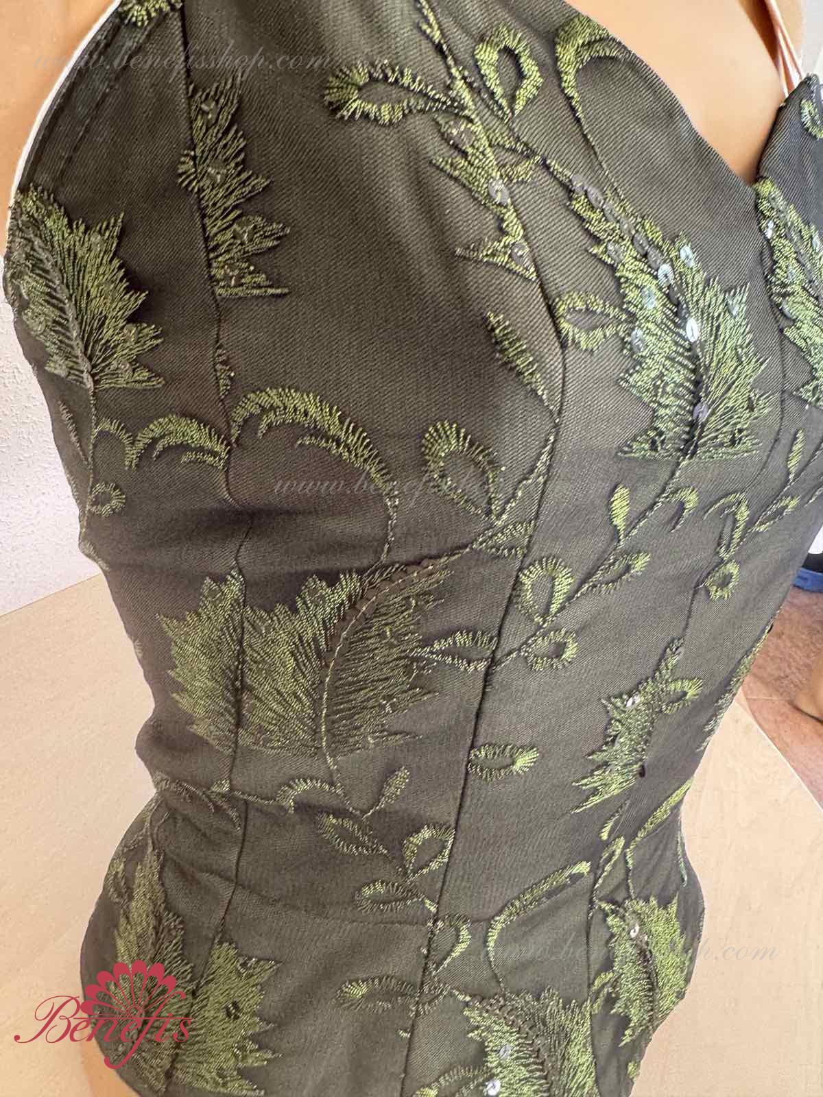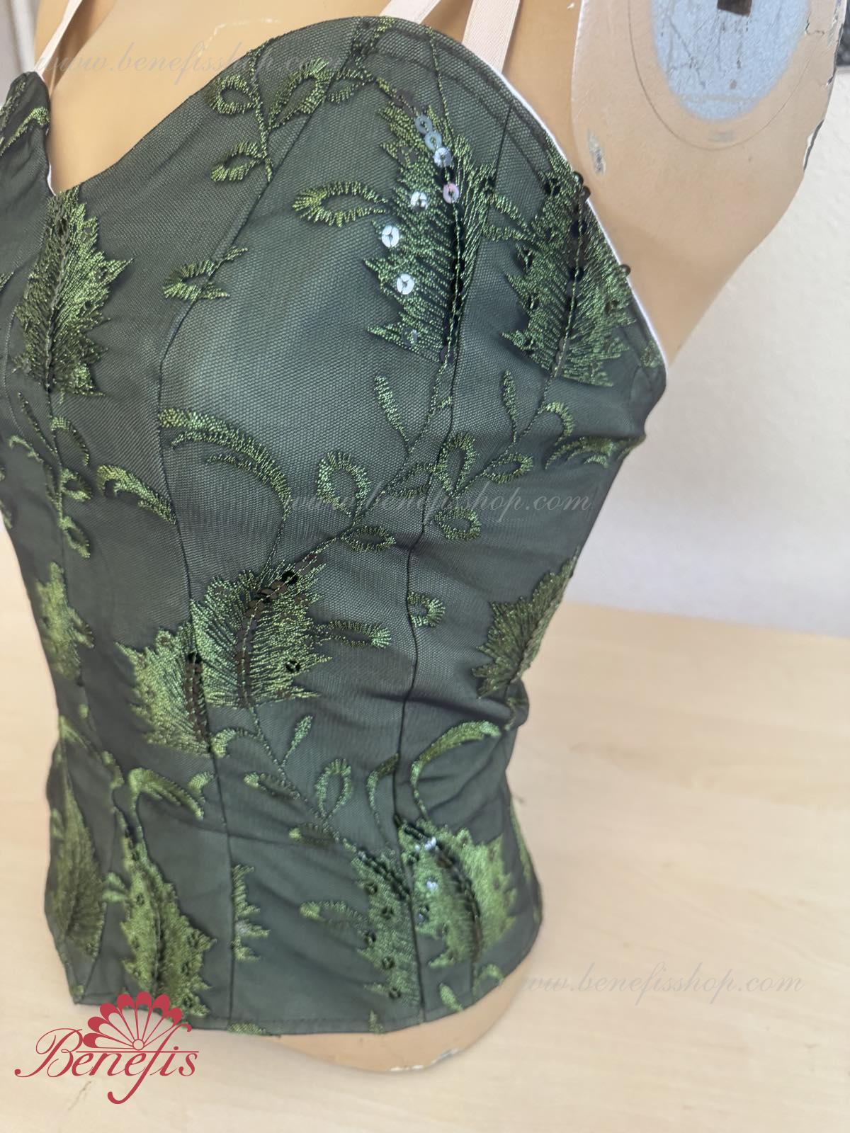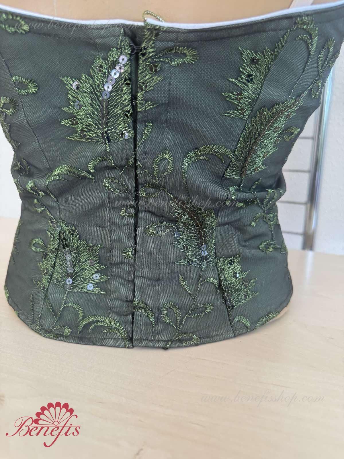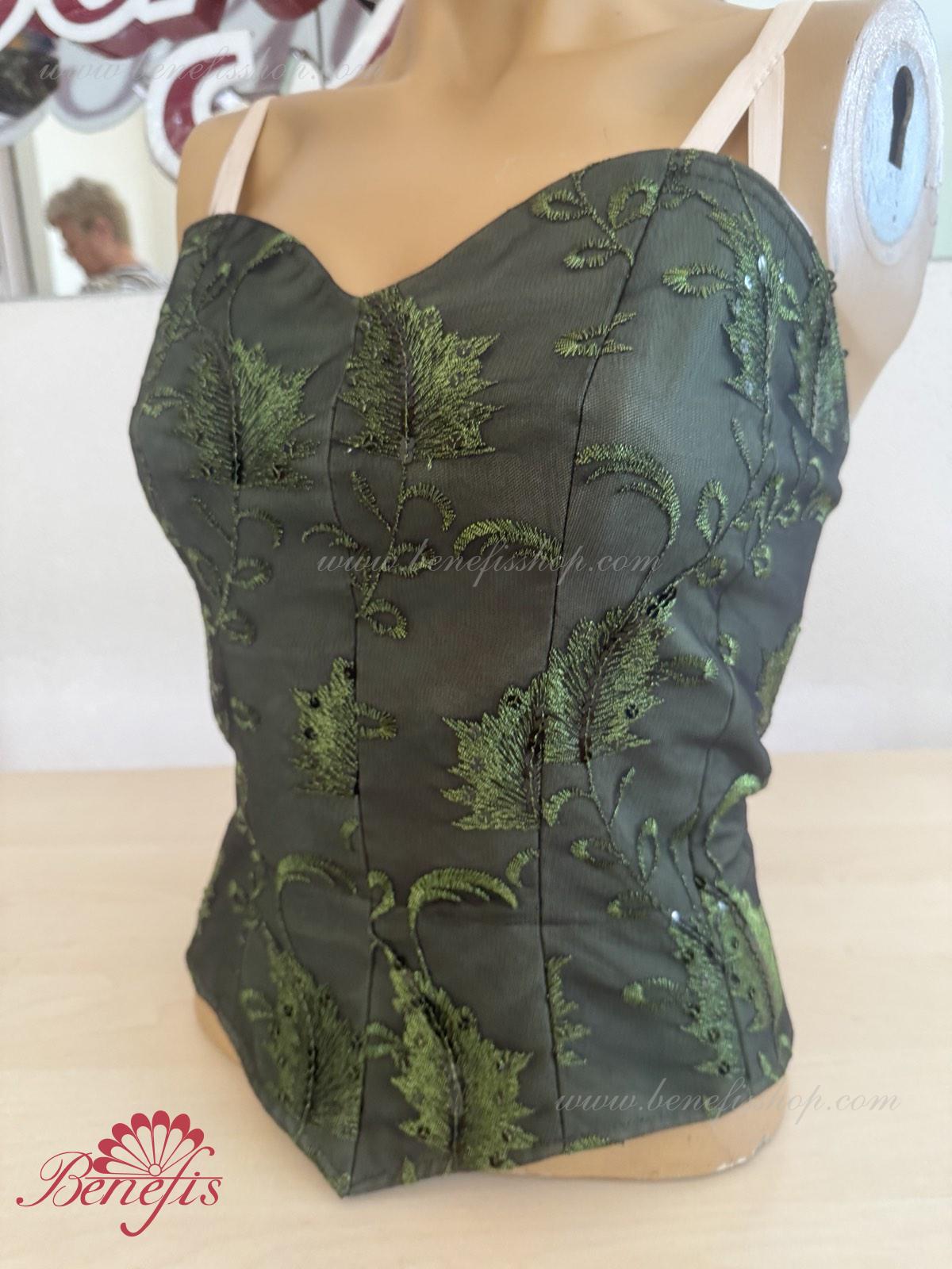 Detalii: Corsetul, cu bretele elastice, este confectionat din tesatura densa semi-elastica. Corsetul este fixat cu cârlige în două rânduri pentru o reglare ușoară, cordonul interior este folosit pentru a strânge corsetul în zona pieptului. Decor: paiete.