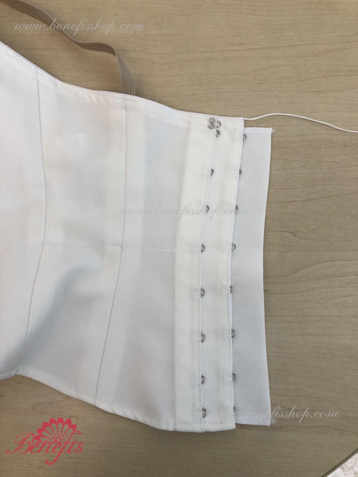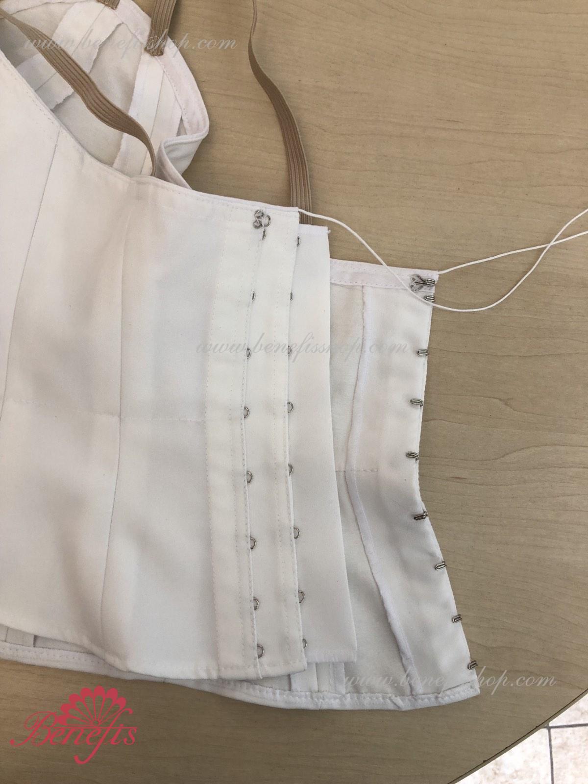 Detalii: Corsetul este confectionat din tesatura densa semi-stretch. Pe corset sunt prezente doua rinduri de chirlige pentru regularea comoda si un snur intern pentru imbaierarea corsetului la nivelul pieptului.Pe piept se intrevede o insertie de culoarea pielii. Chingele sunt de culoarea pielii.