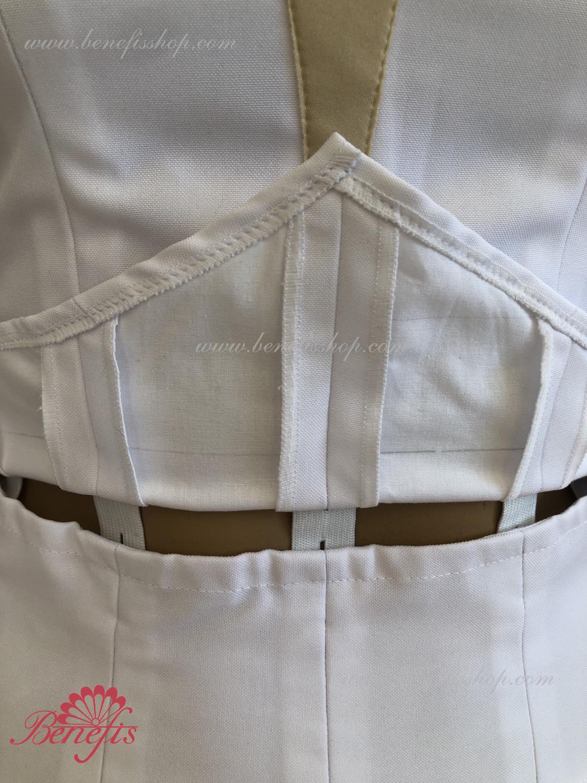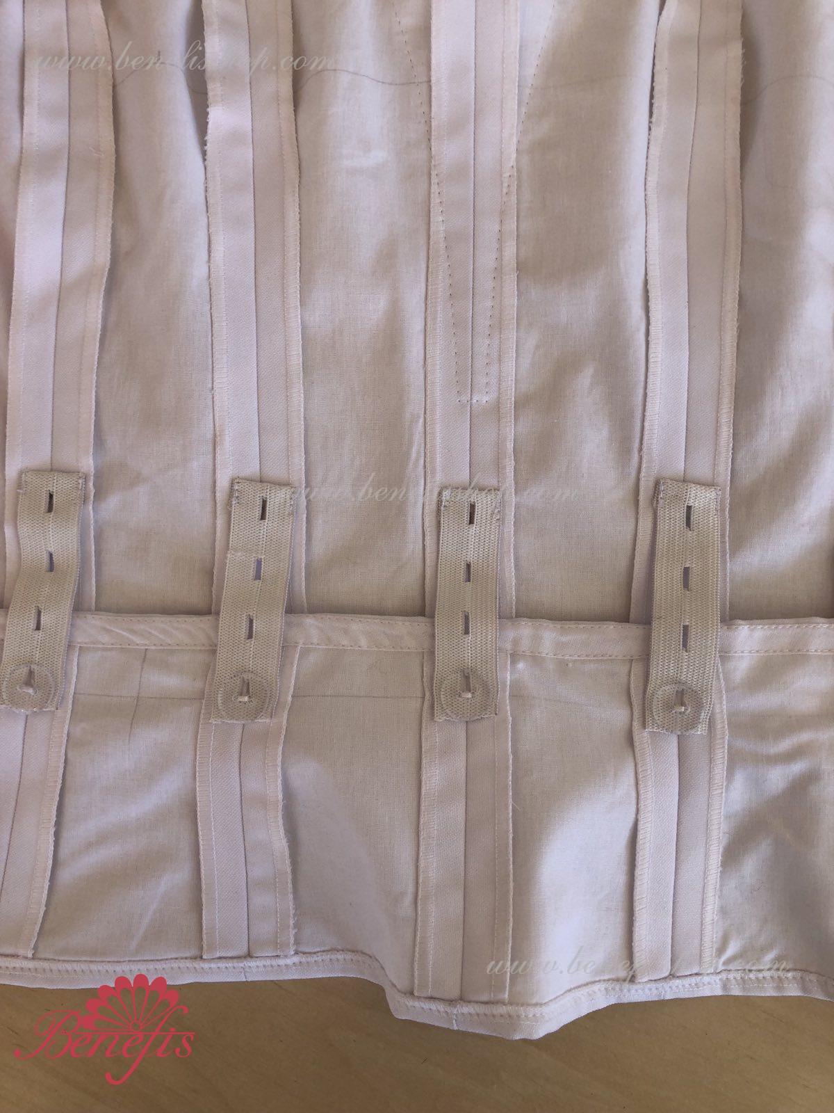 Corsetul se prinde cu ajutorul cîrligelor în doua rînduri pentru reglare comodă, iar cordonul intern permite tragerea corsetului în zona pieptului.