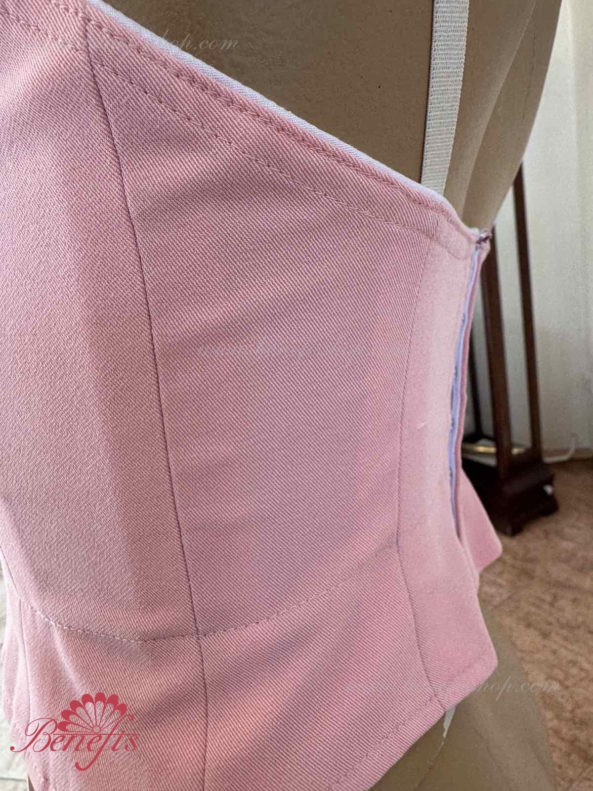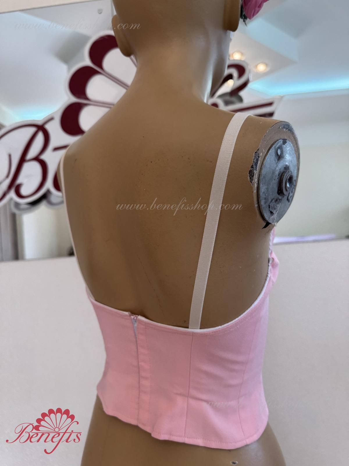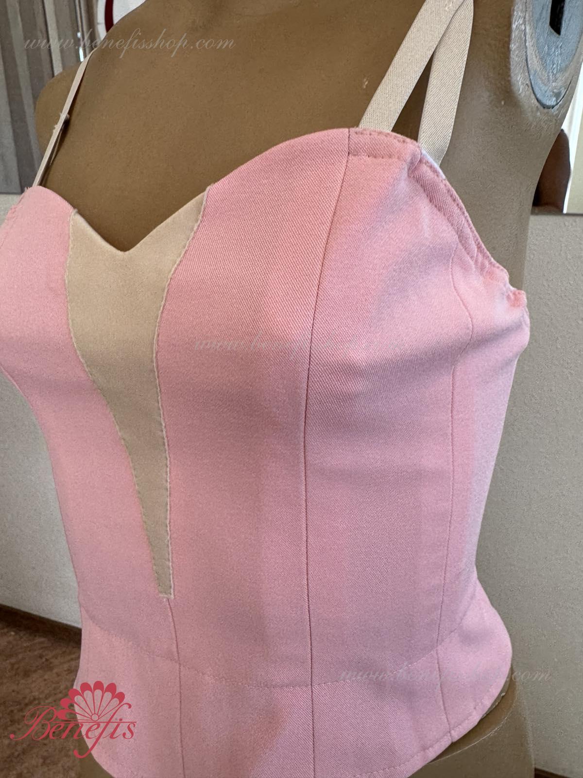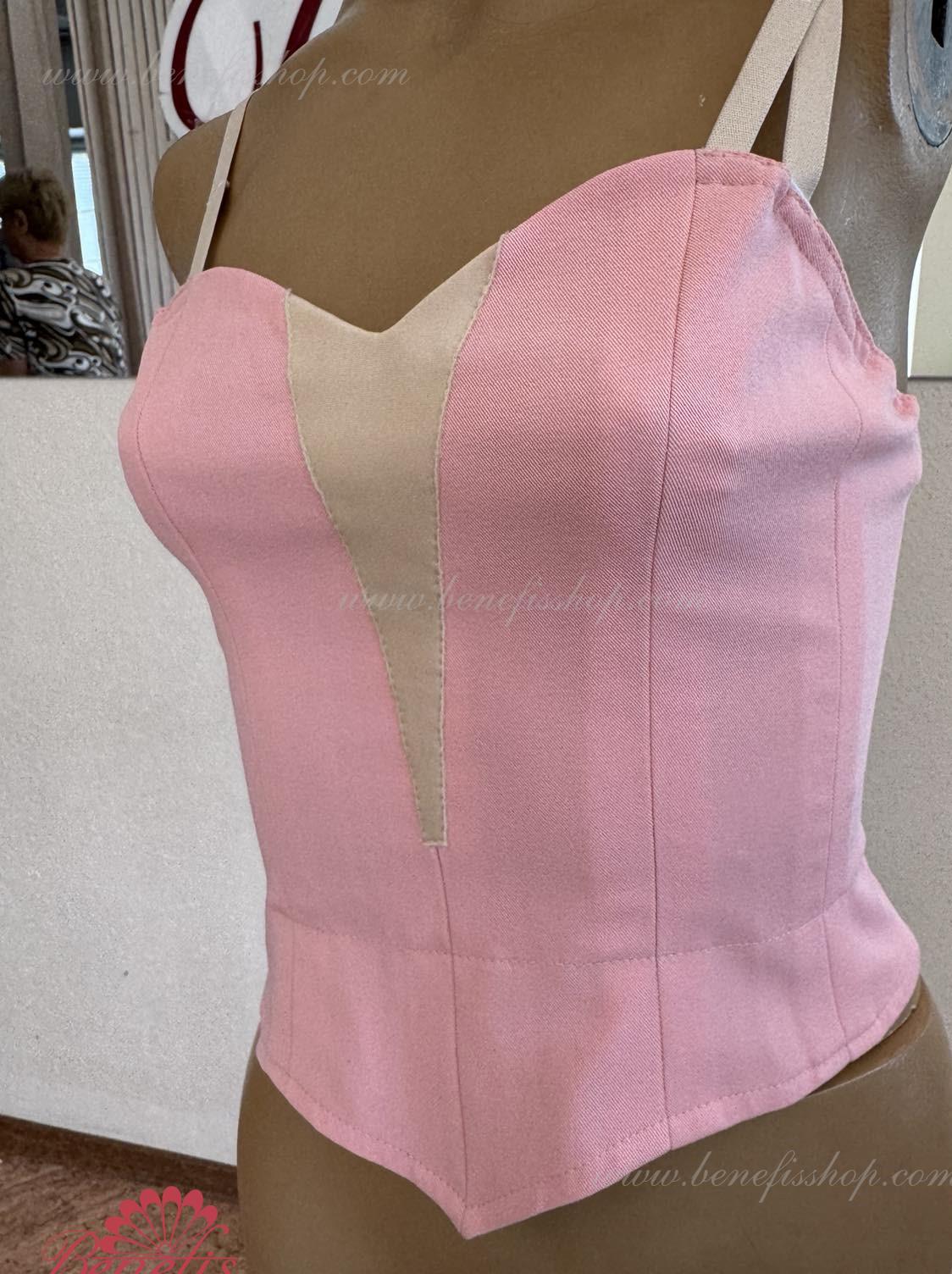 Corsajul de balet este confecționat din material suplex, cusut din 8 părți, pe spate corsajul este prins cu o împletitură cu cârlige și bucle. În față se află o inserție de culoarea pielii pe piept.