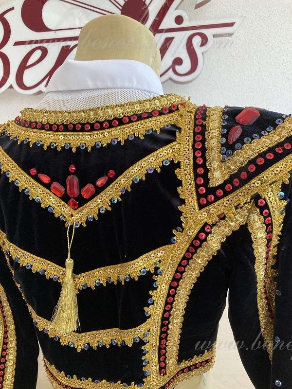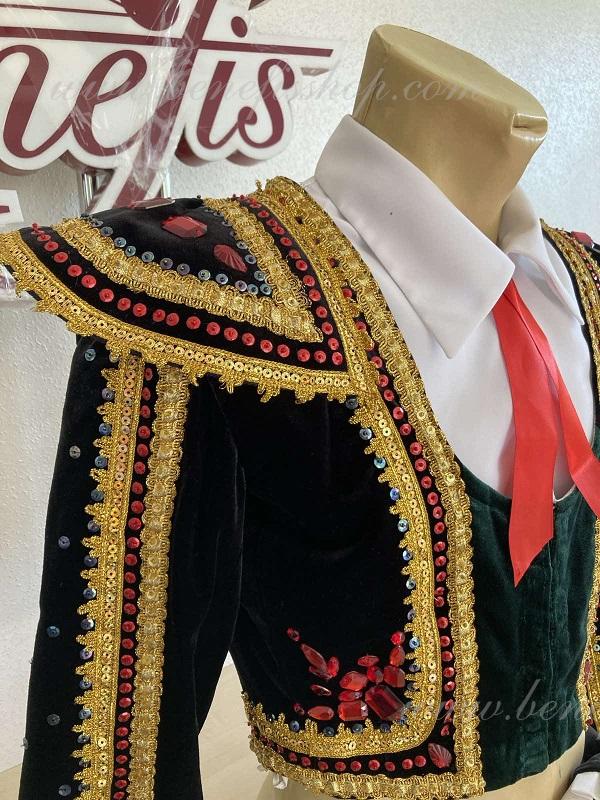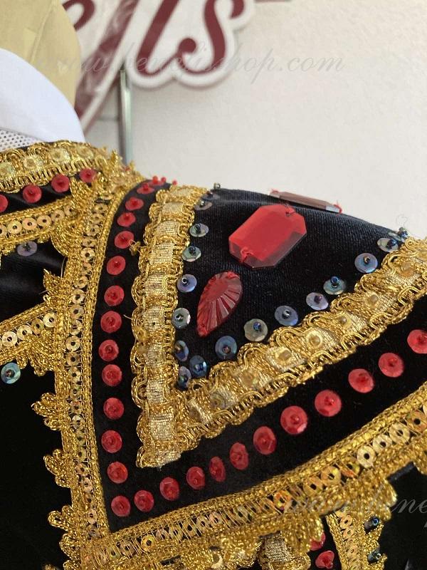 Epoletii sunt inramati cu franjuri aurii. Pe spate este prezent un ciucure auriu in stil spaniol.