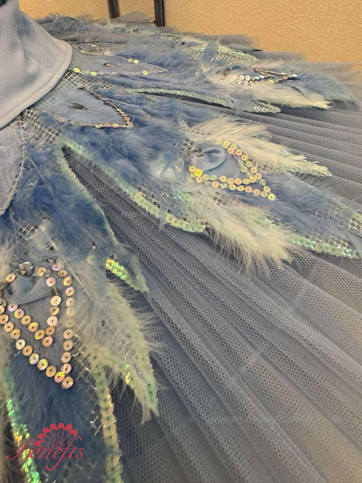 Întregul costum este decorat cu pene naturale care imită perfect penajul unei păsări.
