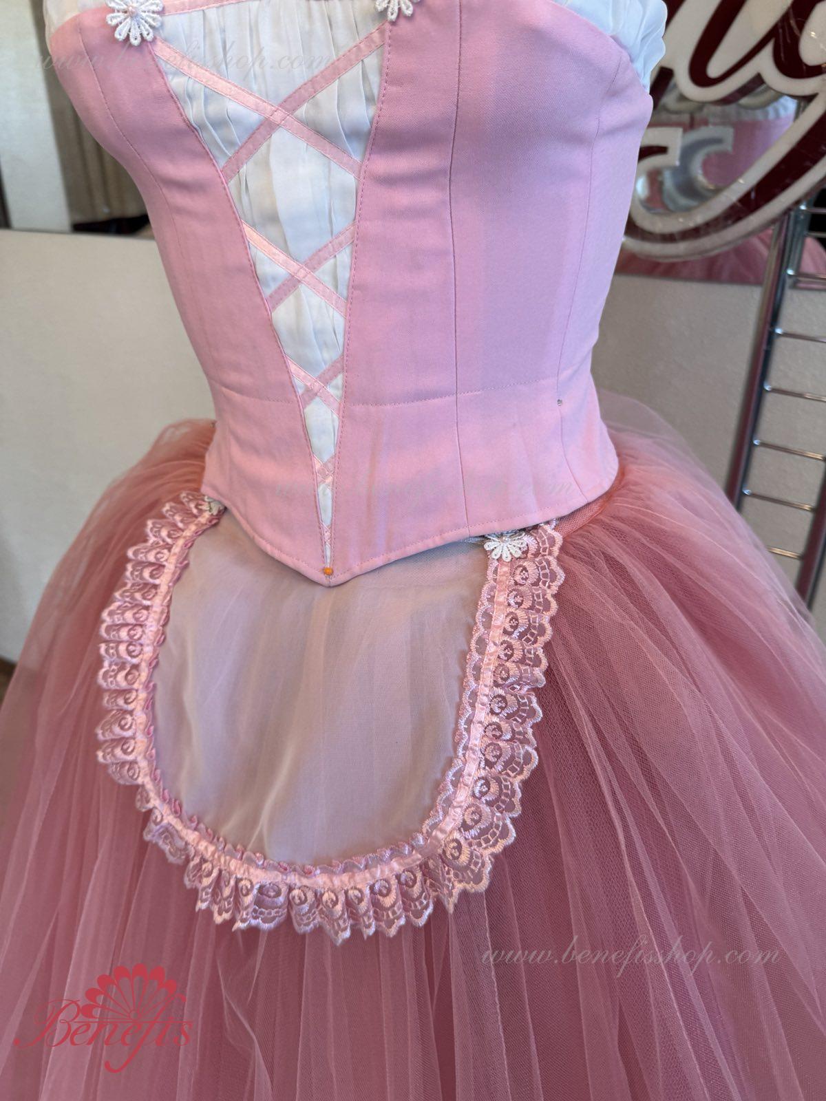 Costumul este realizat în stil țărănesc, cu un șorț mic în față și trei rânduri de împletitură de satin de-a lungul fundului stratului superior al fustei.