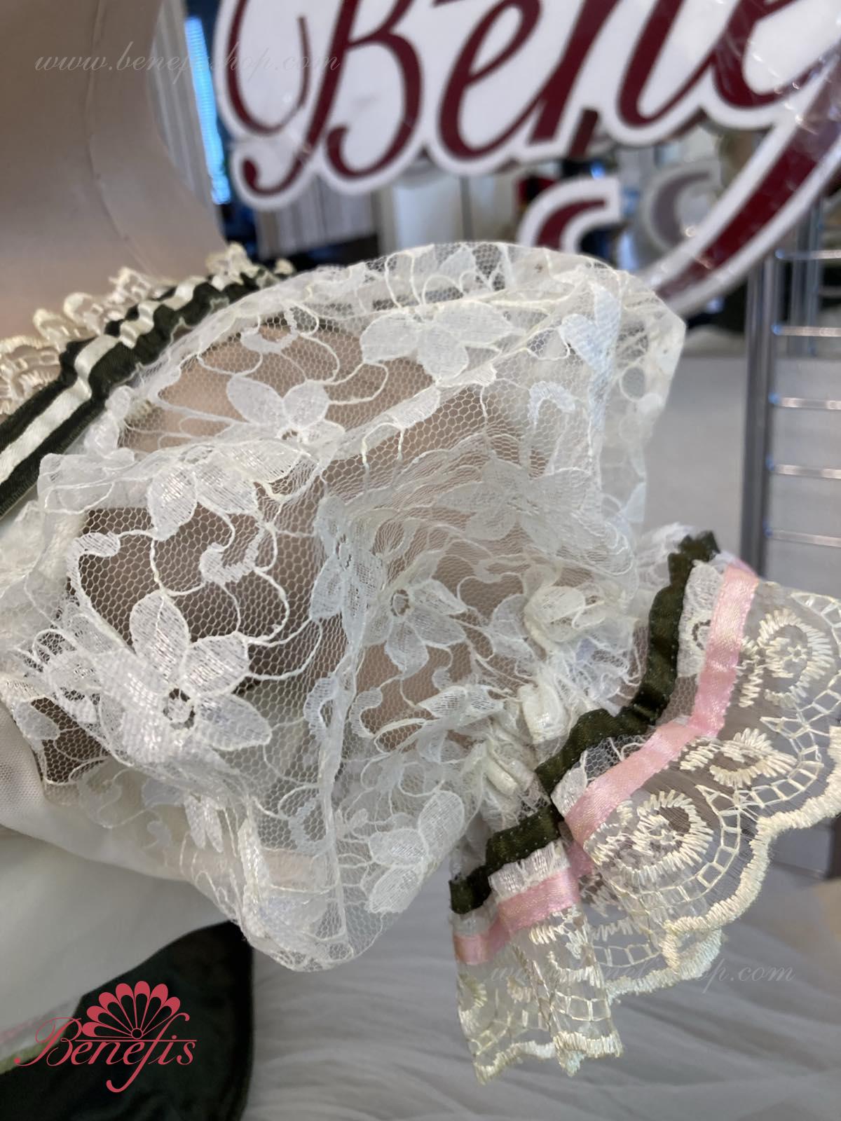 Stratul superior de tul al fustei este mai scurt decat celelalte straturi ale ei. Costumul este cusut in