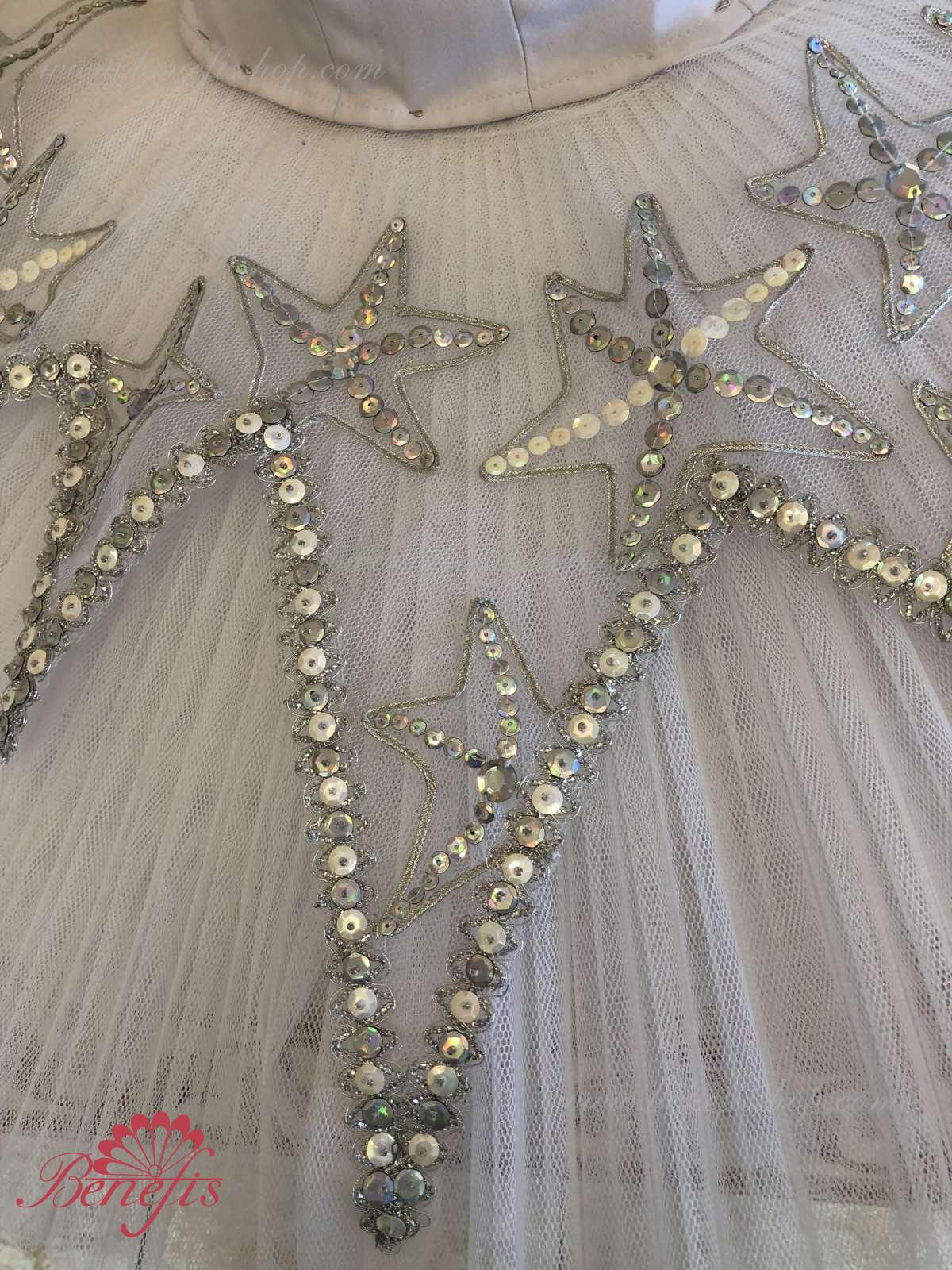 Pe stratul superior al fustei sunt cusute aplicatii in forma de stele de marimi diferite. Sunt utilizate strase de diferite marimi, margele de sticla, panglici stralucitoare, margele marunte de culoare alba si argintie.