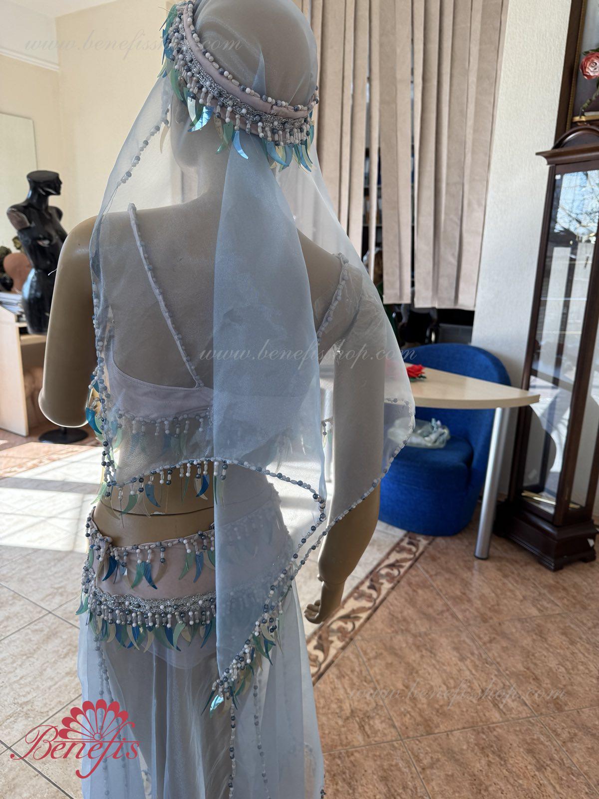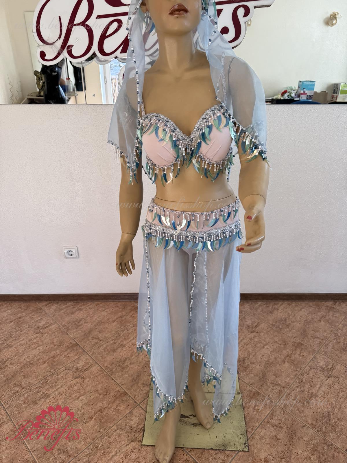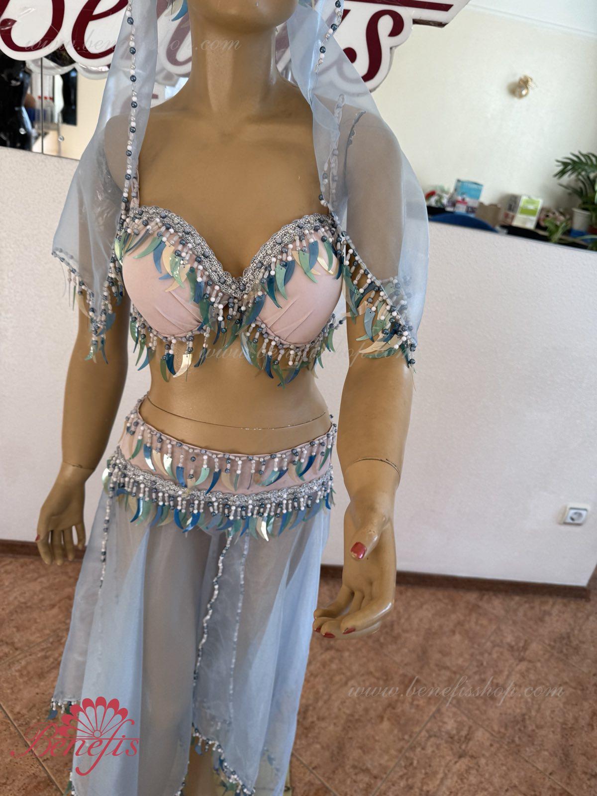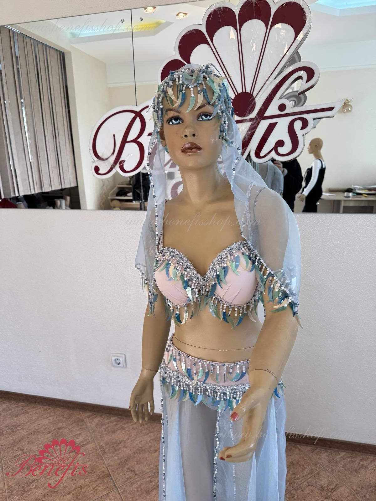 Detalii: fusta chiloti, maiou, articol decorativ pentru cap, Bratari. Costumul este realizat în motive orientale pe baza unui corset și chiloți din țesătură elastică. Fusta din nailon este realizată sub formă de 4 pene și cusută la jugul chiloților. Decorul foarte bogat sub forma unei multitudini de paiete agățate – sulițe, moniste, mărgele, mărgele și mărgele de sticlă este realizat în tradițiile bijuteriilor orientale. Lucrul in decor exclusiv manoper da costumului coloritul oriental special.
