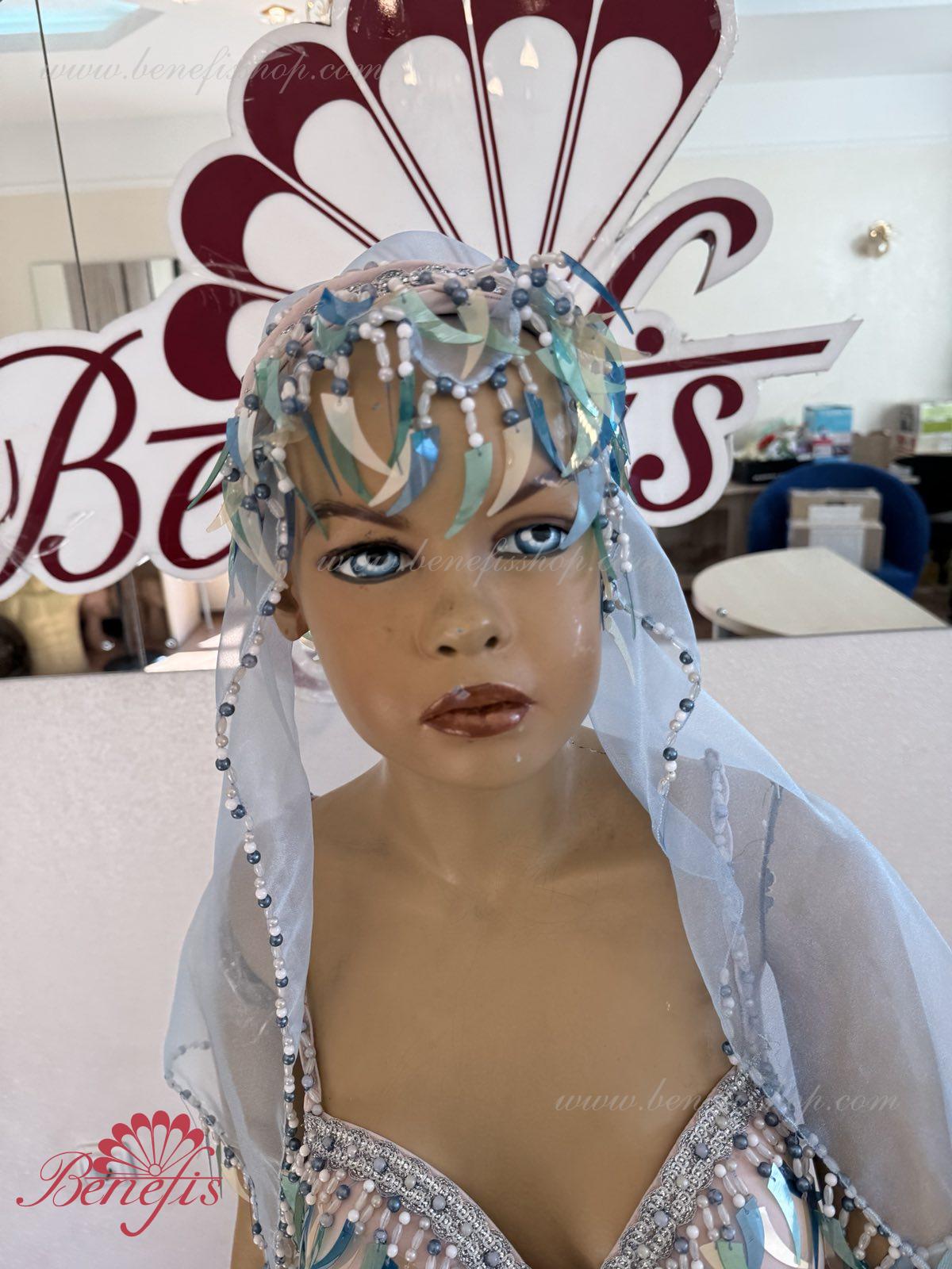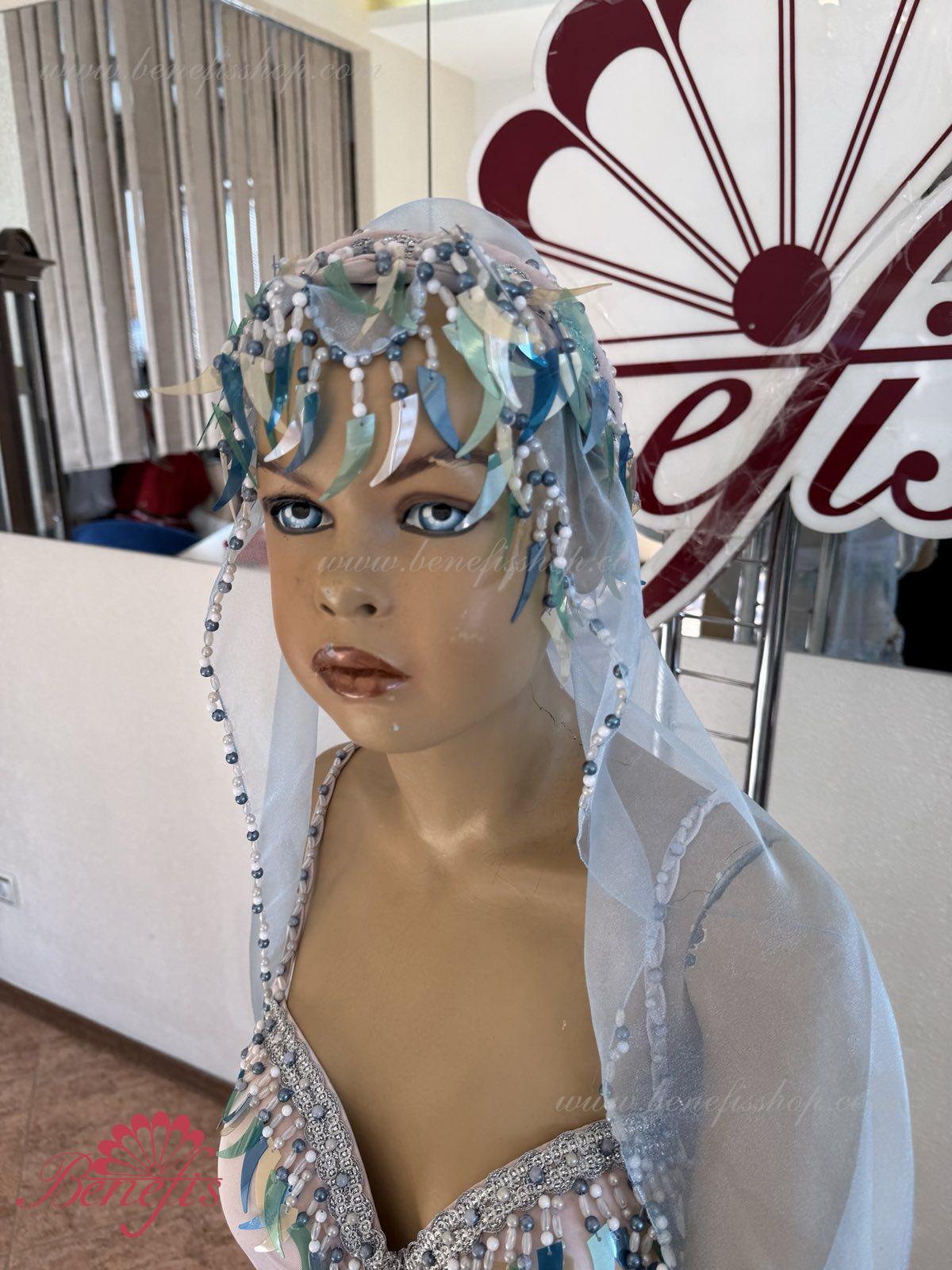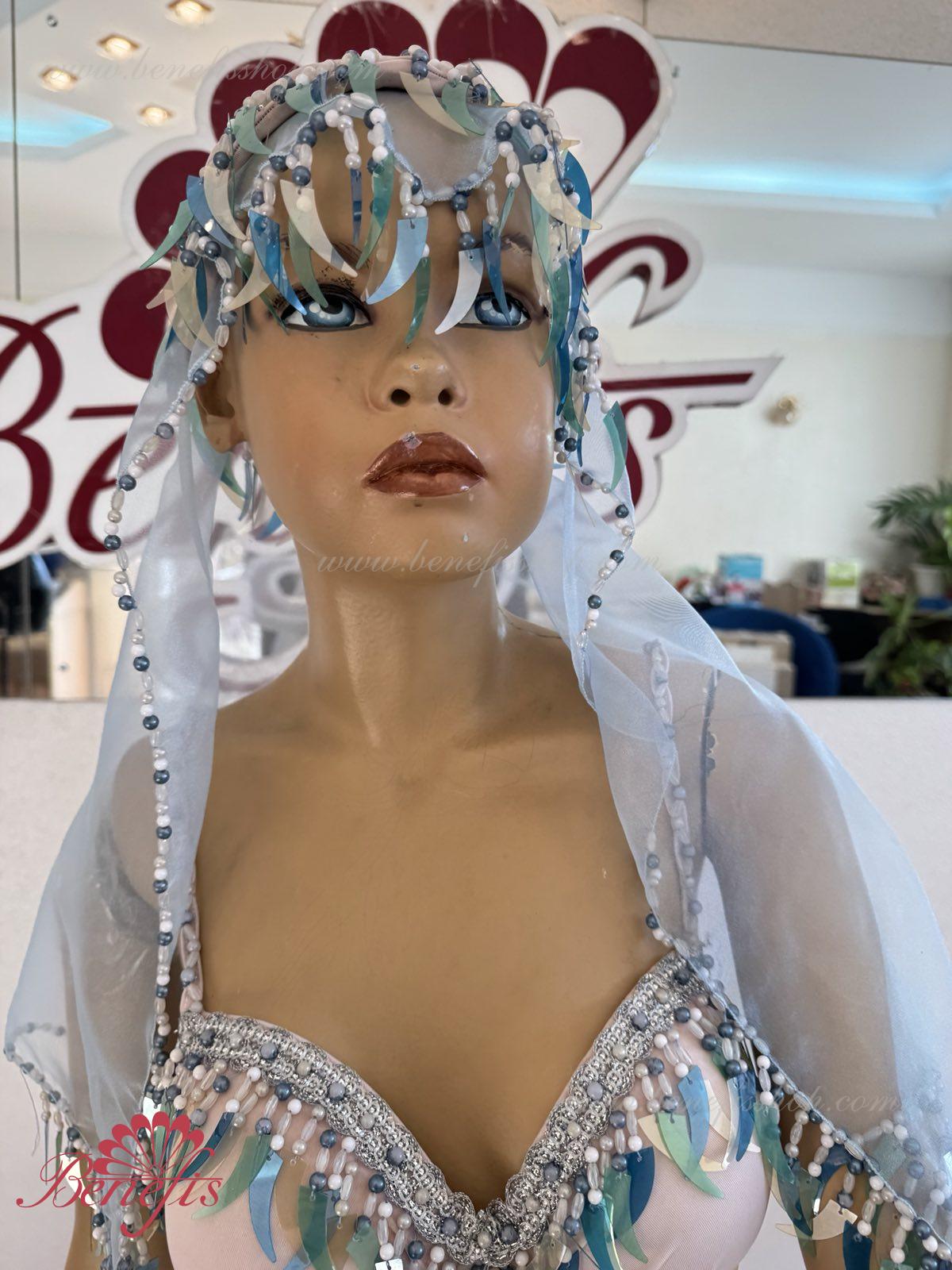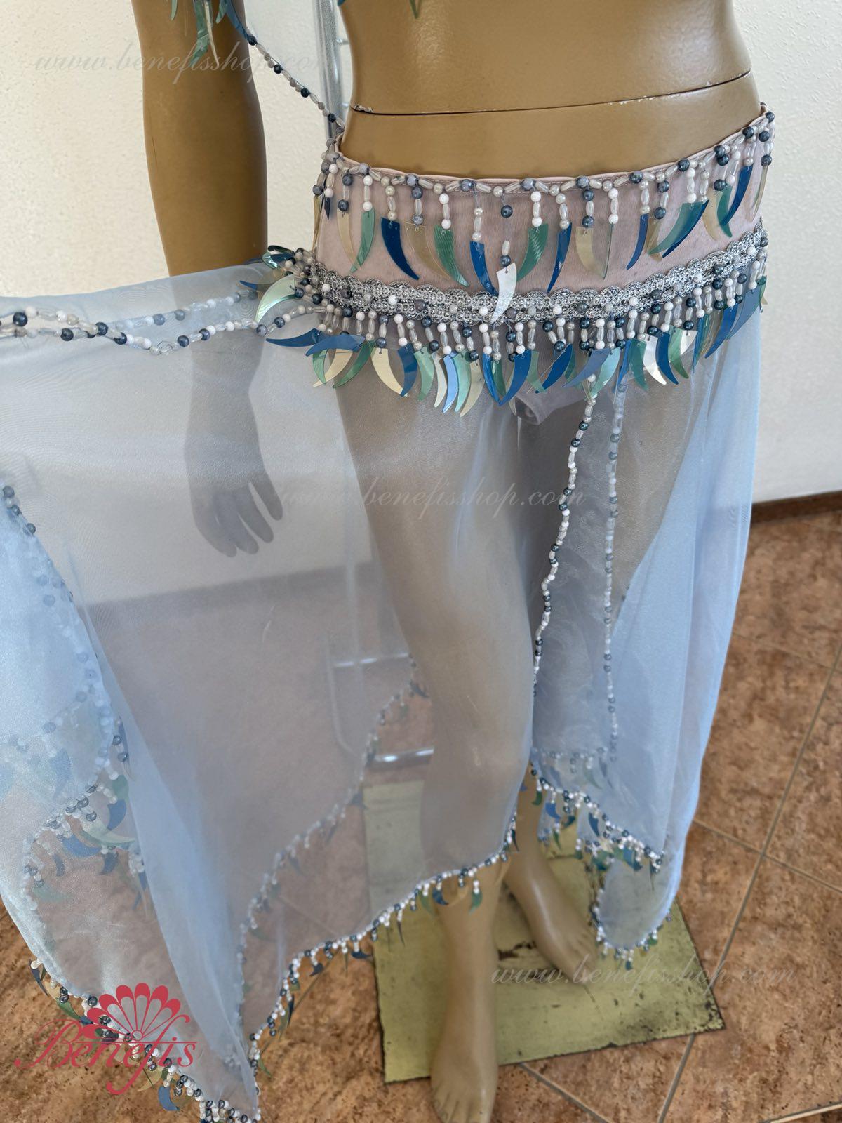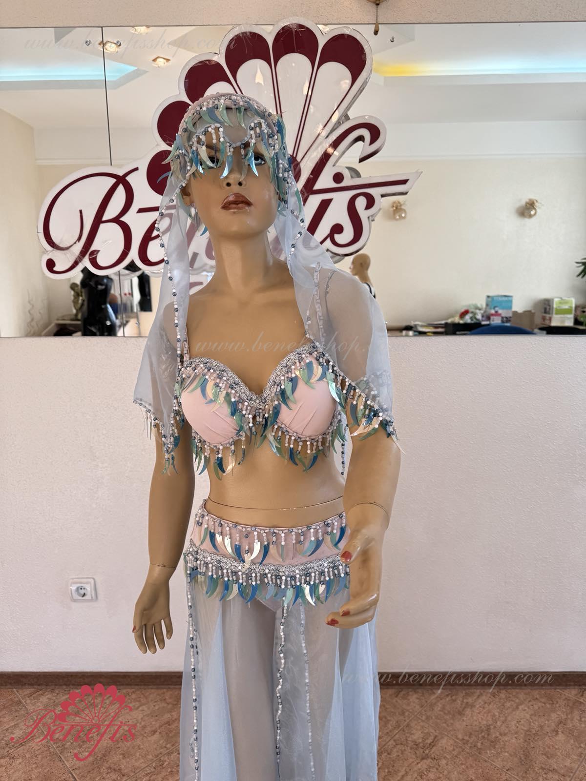 Detalii: fusta chiloti, maiou, articol decorativ pentru cap, Bratari. Costumul este realizat în motive orientale pe baza unui corset și chiloți din țesătură elastică. Fusta din nailon este realizată sub formă de 4 pene și cusută la jugul chiloților. Decorul foarte bogat sub forma unei multitudini de paiete agățate – sulițe, moniste, mărgele, mărgele și mărgele de sticlă este realizat în tradițiile bijuteriilor orientale. Lucrul in decor exclusiv manoper da costumului coloritul oriental special.
