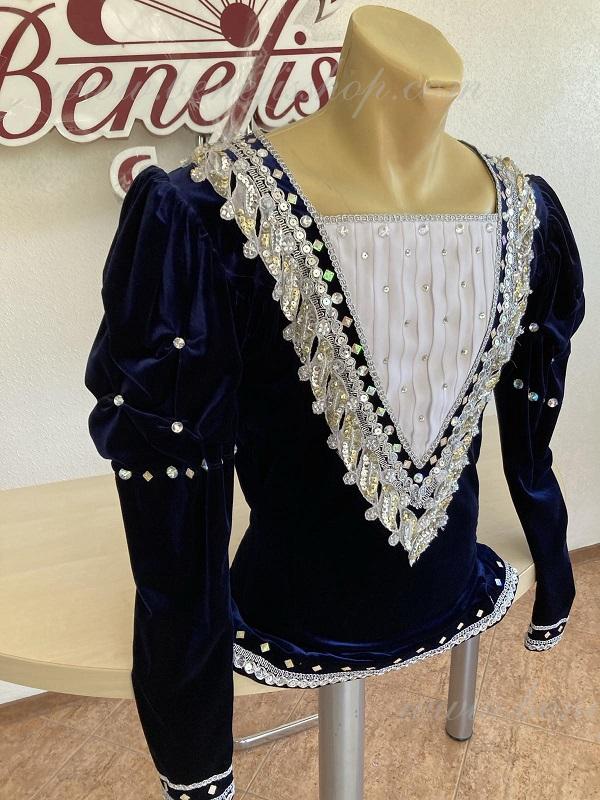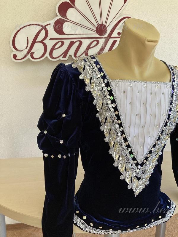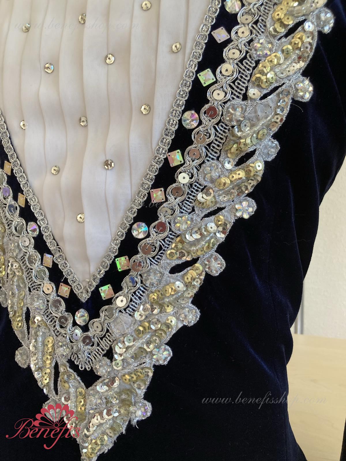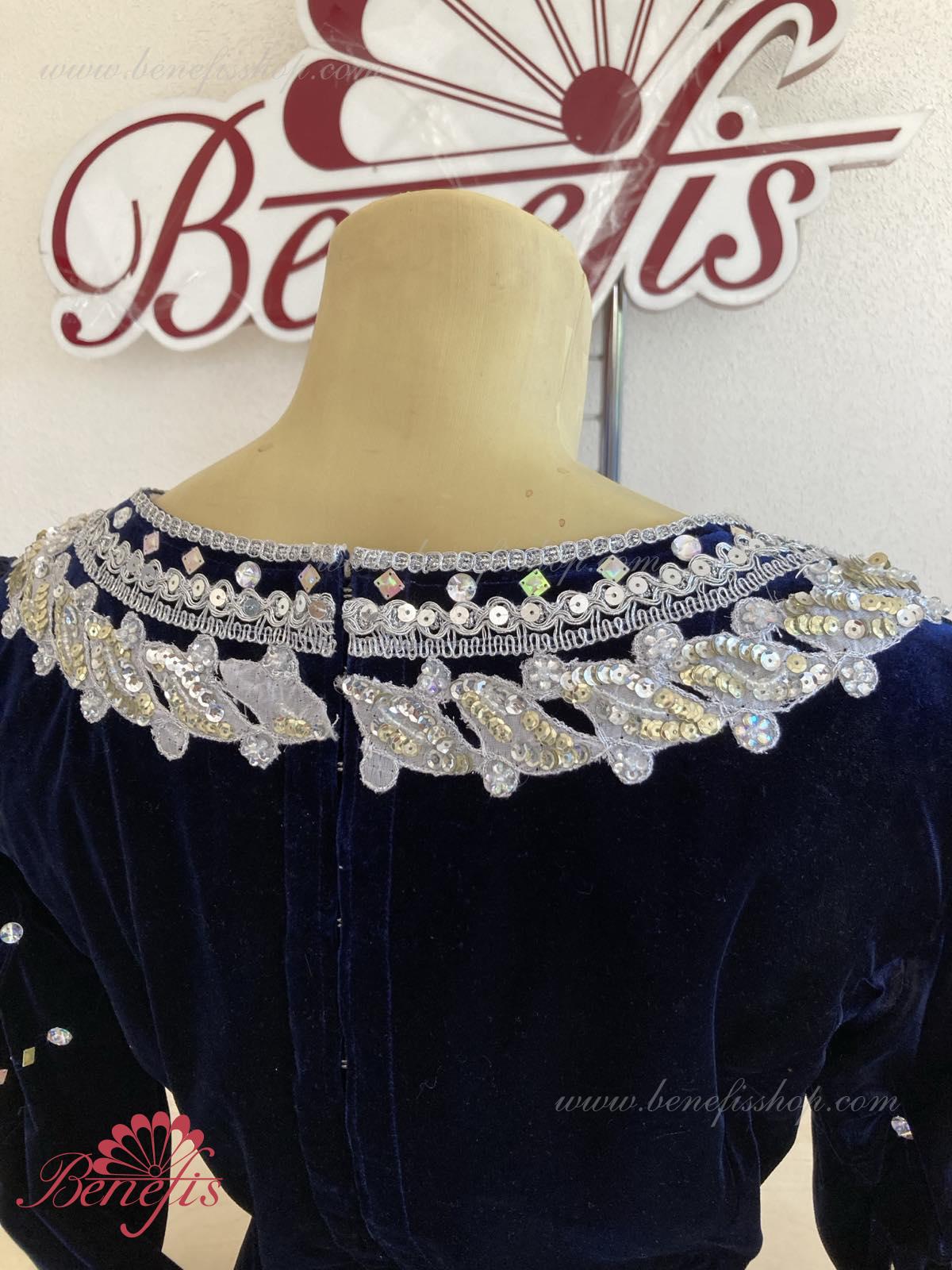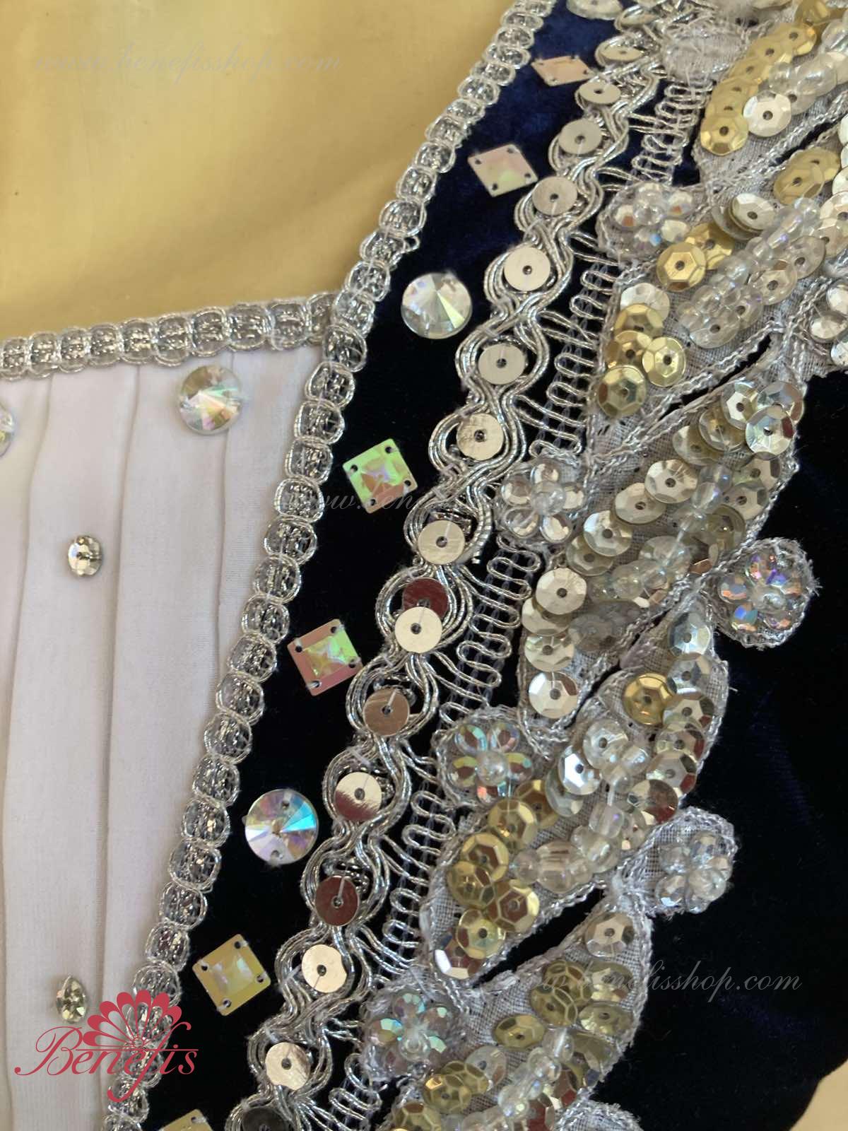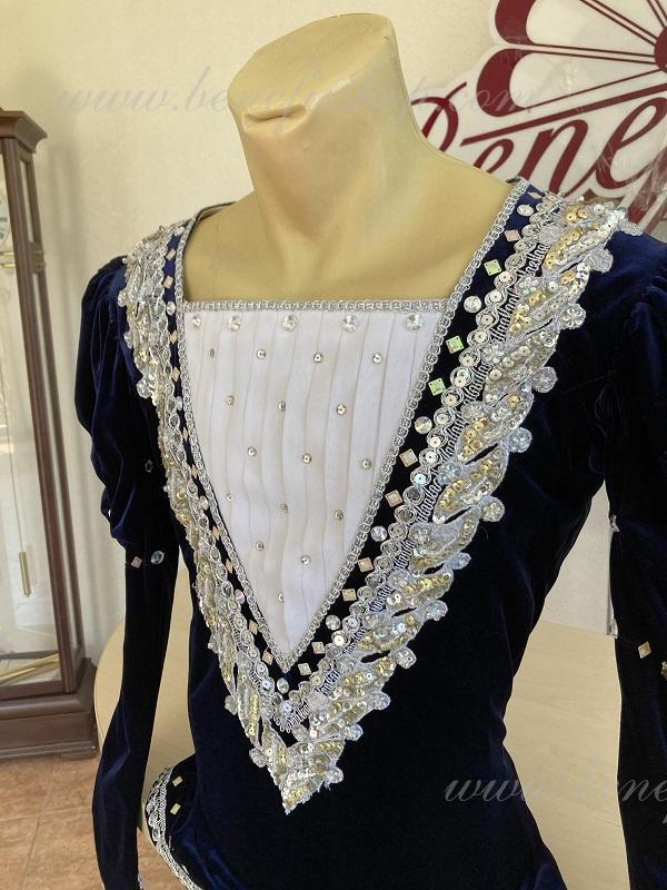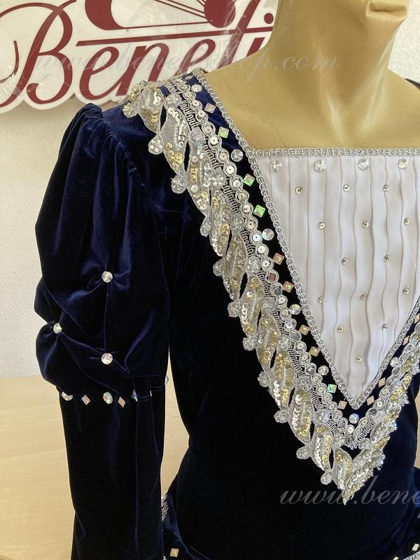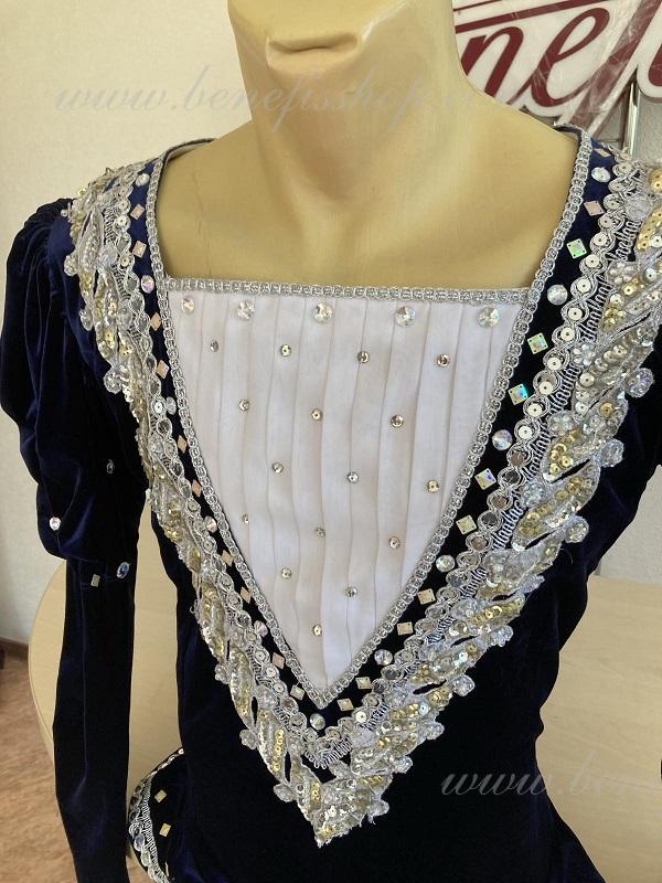 Costumul este decorat cu strase, paiete mari si mici de culoarea cristalului de roca, brodat cu margele de culoarea metalic. Minecile sunt bufate, astfel corespunzind epocii.