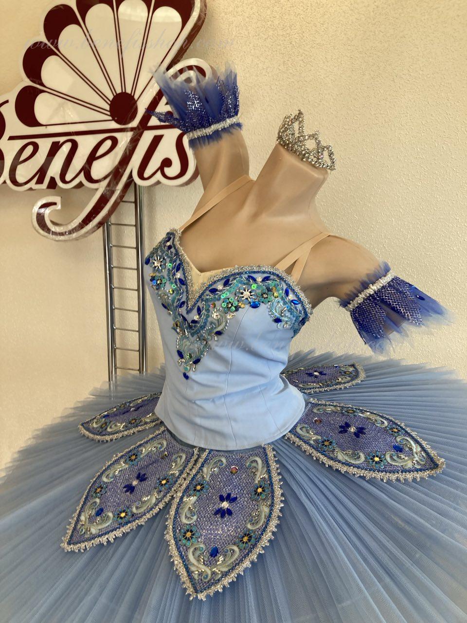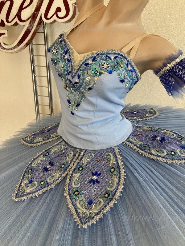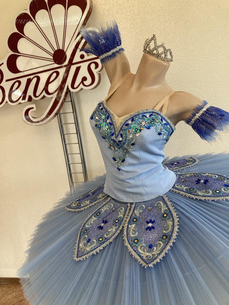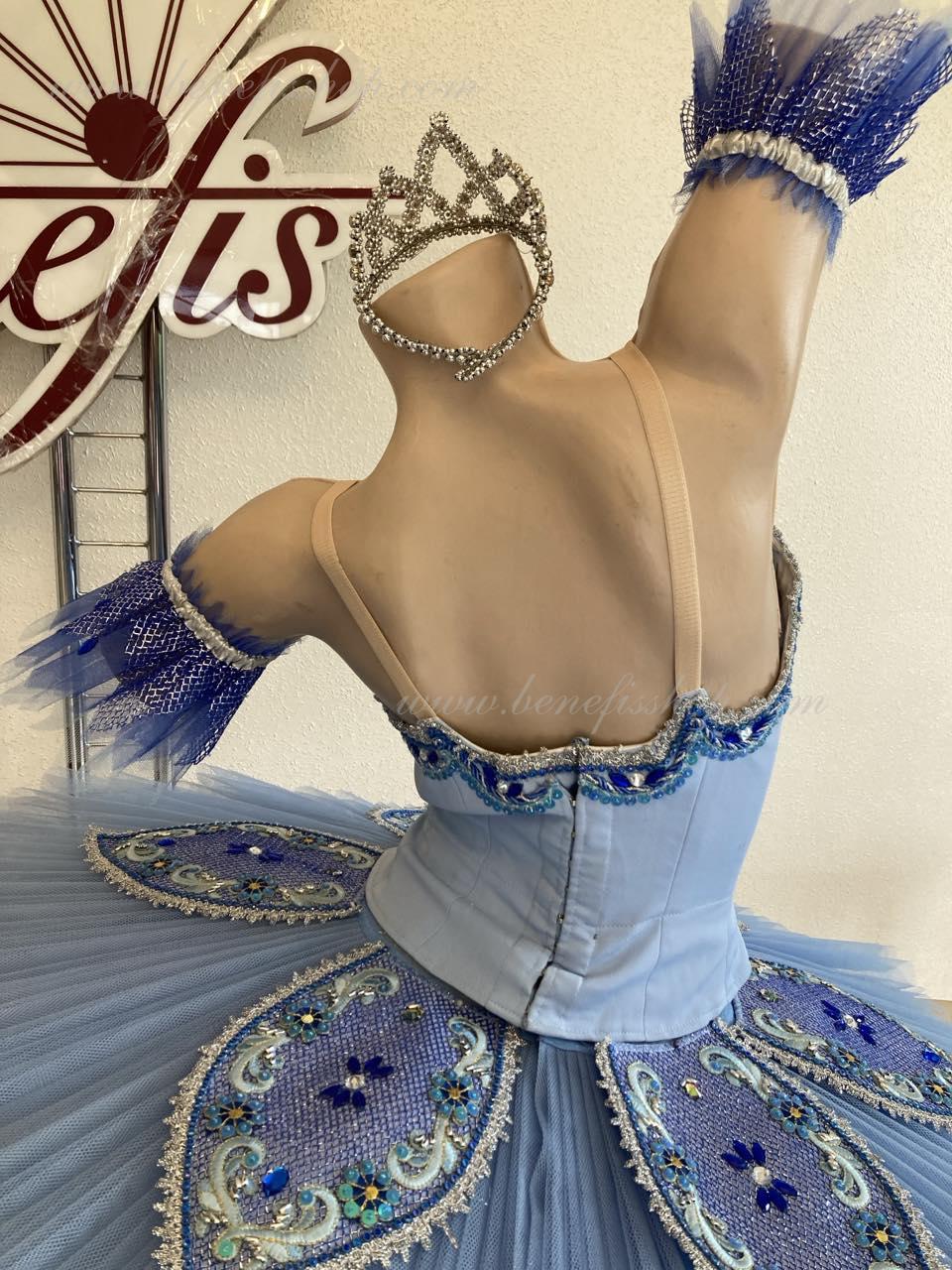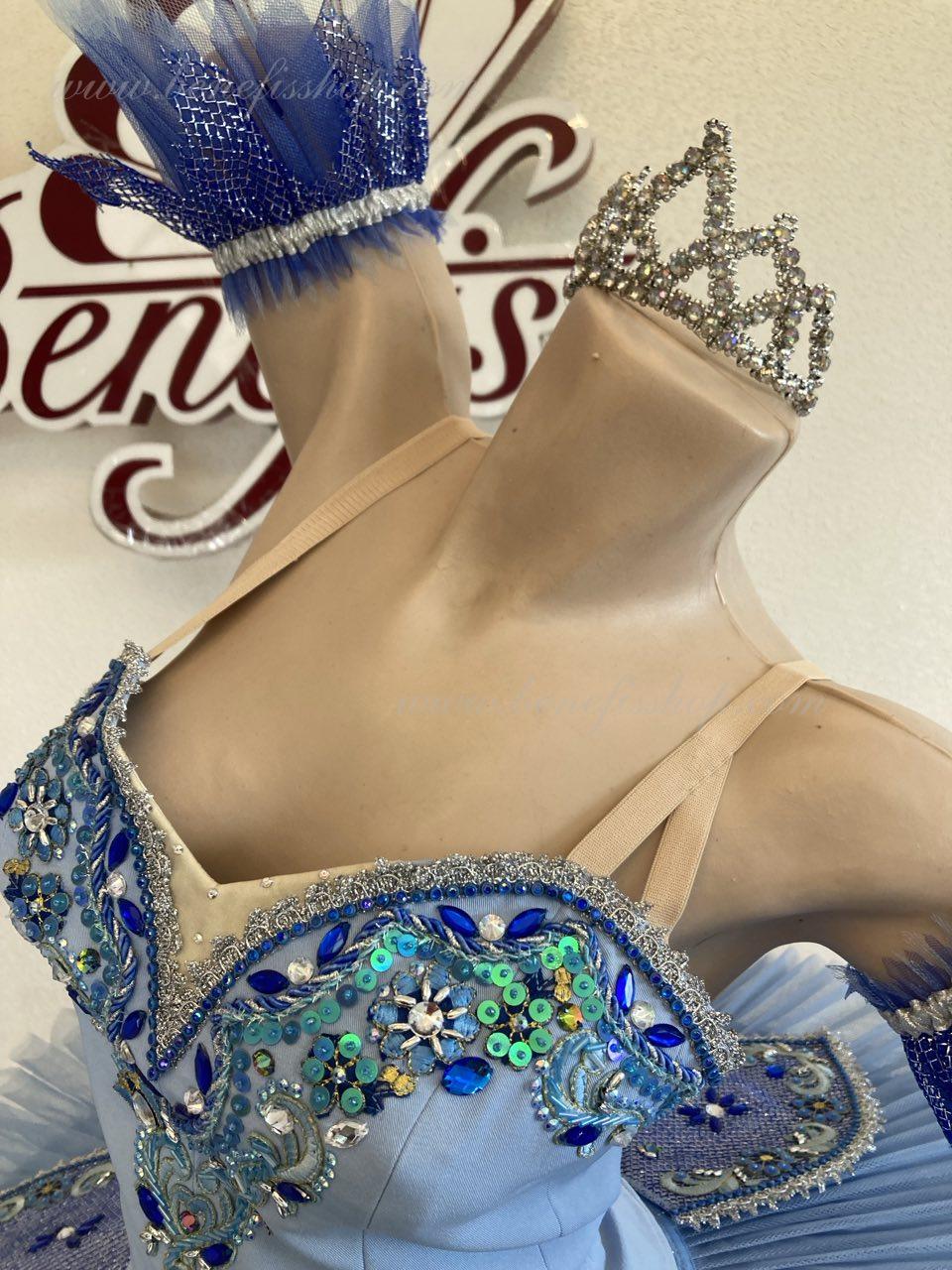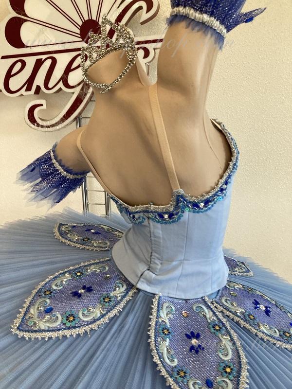 Costumul de balet este perfect potrivit pentru rolul păsării albastre (Prințesa Florina) în baletul "Frumoasa adormită", dar poate fi folosit și ca costum de concert.