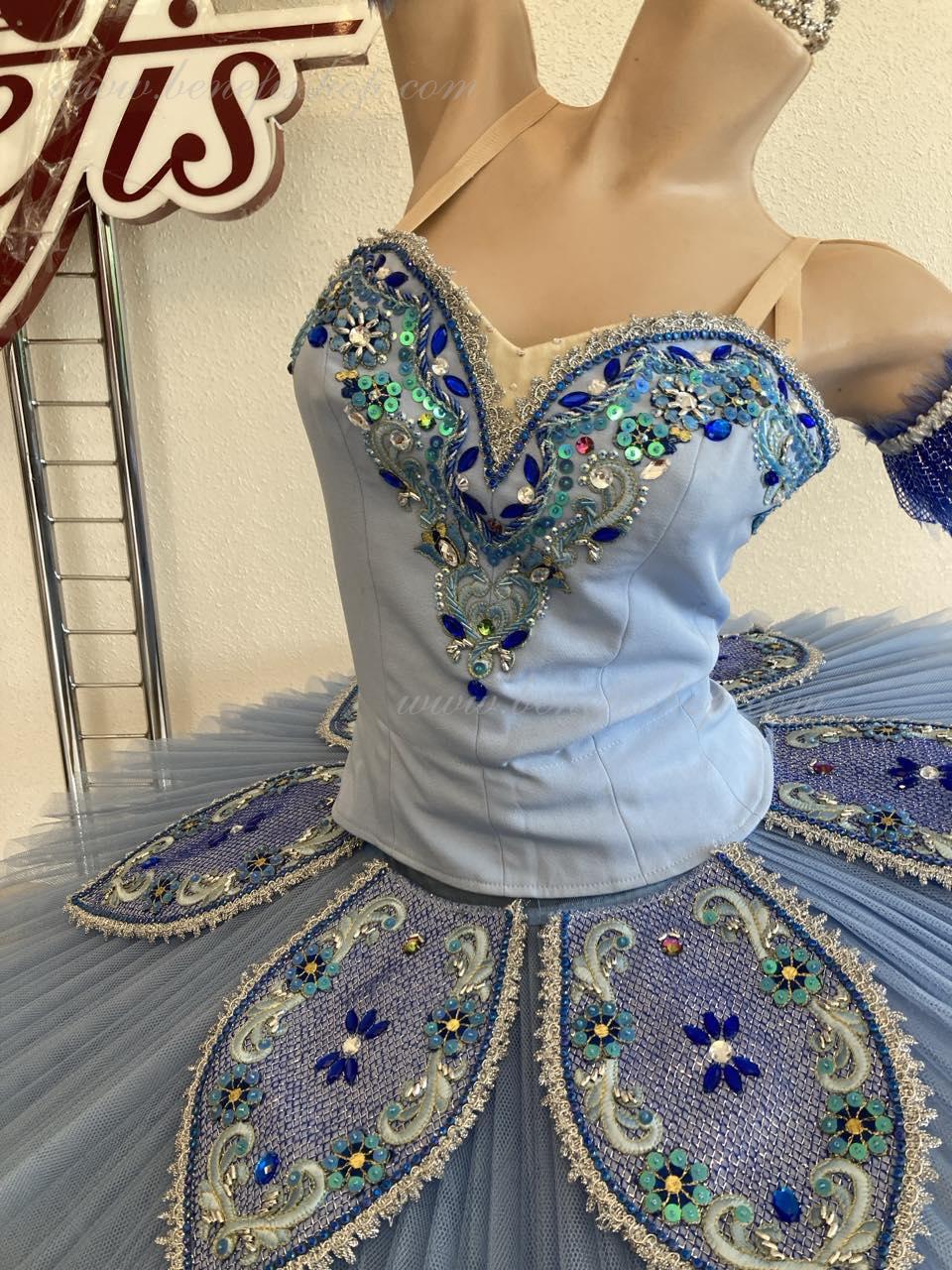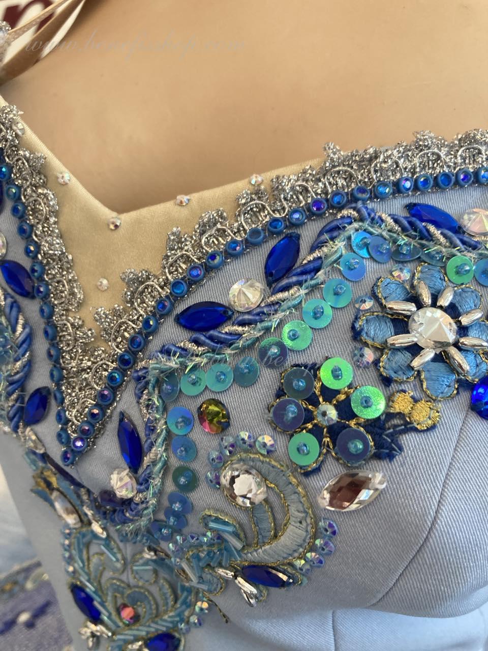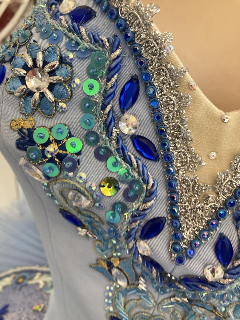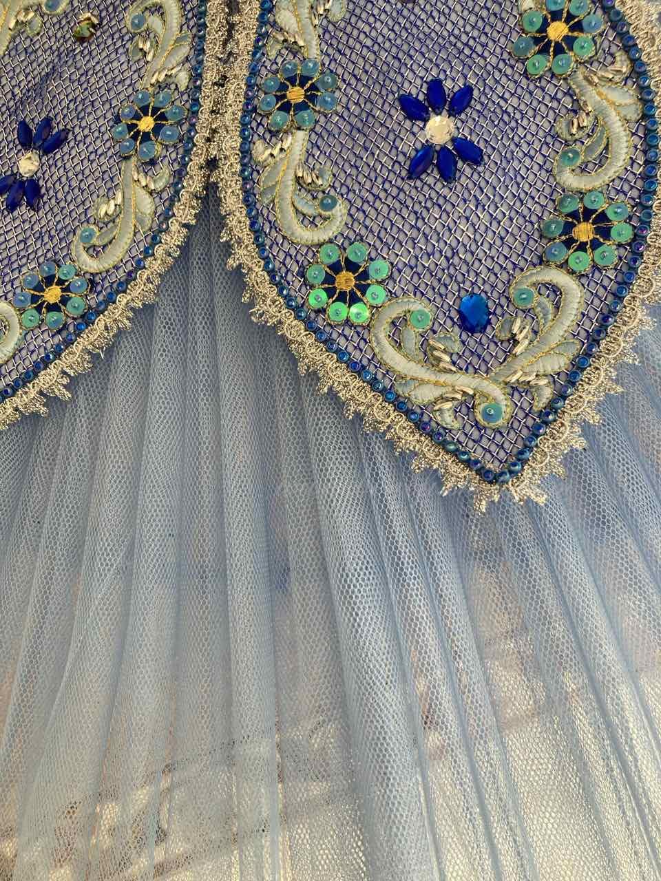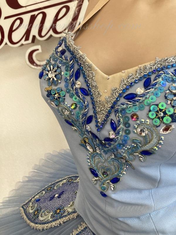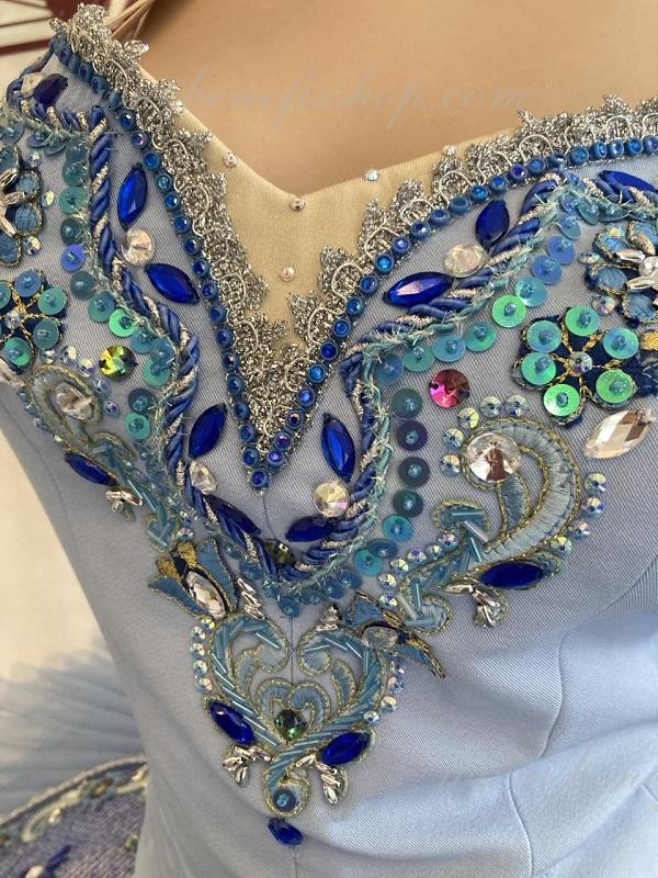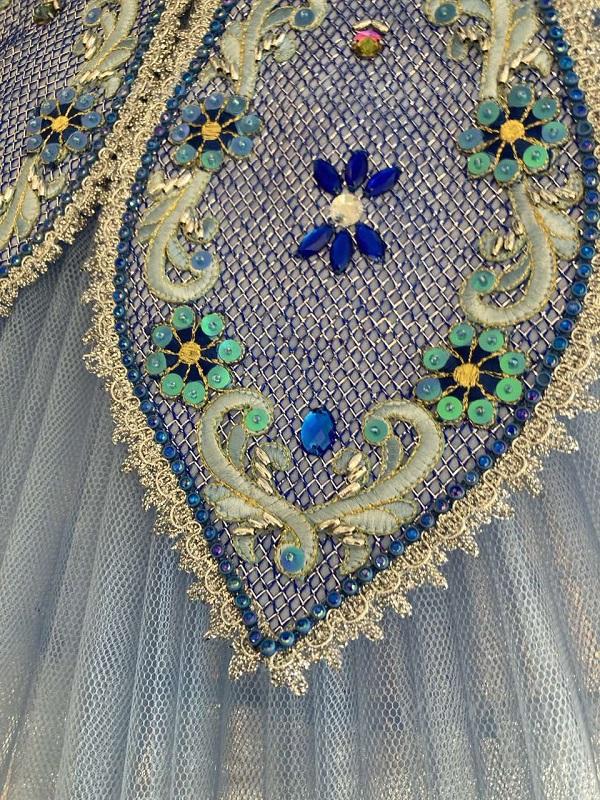 Costumul de balet este perfect potrivit pentru rolul păsării albastre (Prințesa Florina) în baletul "Frumoasa adormită", dar poate fi folosit și ca costum de concert.