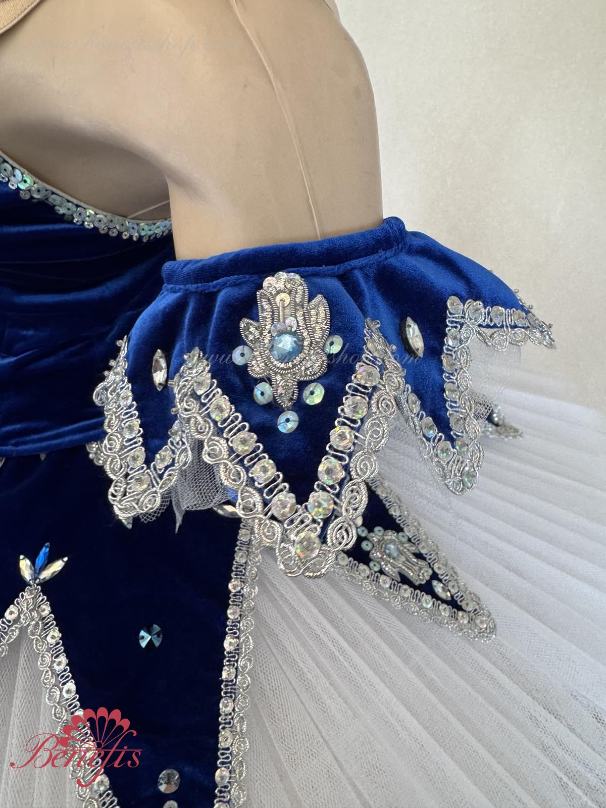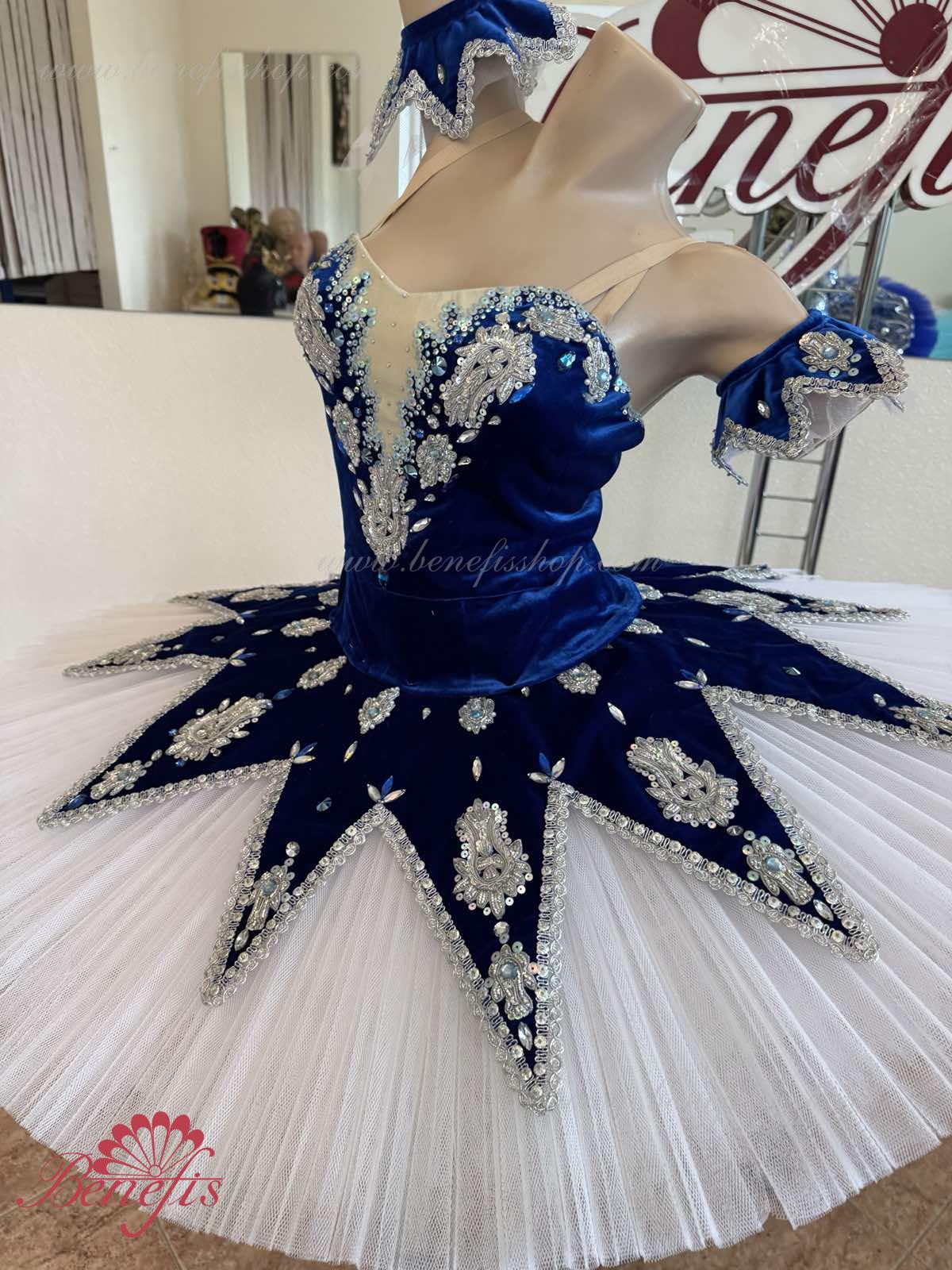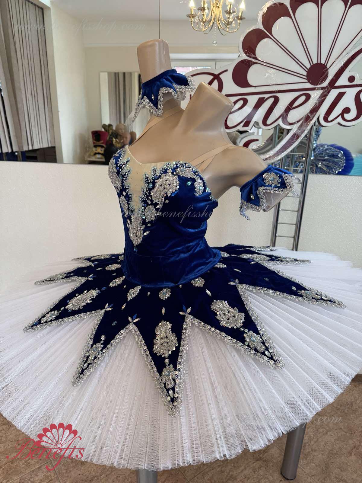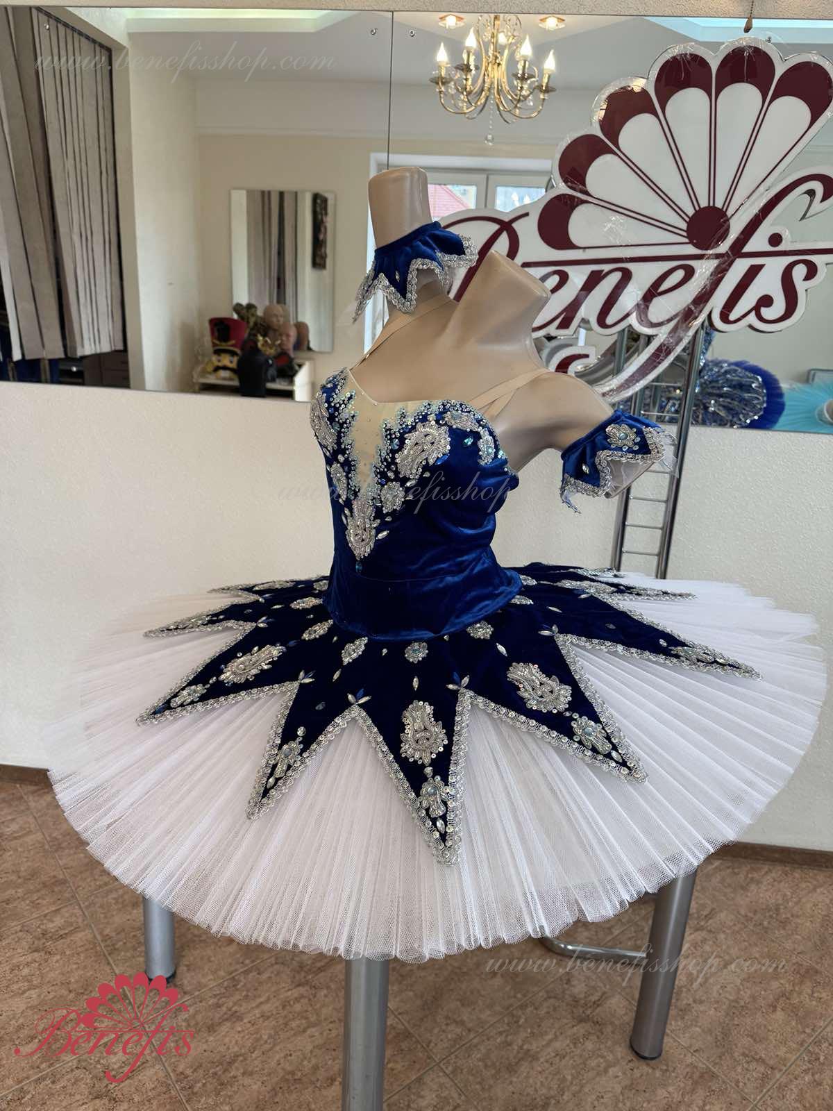 Costum de scena profesionist. Este confectionat in baza fustei de balet profesioniste #T0001B. (vezi compartimentul „Fuste de balet de baza si pentru repetitii”) cu basc cu forme triunghiulare lunge si scurte.