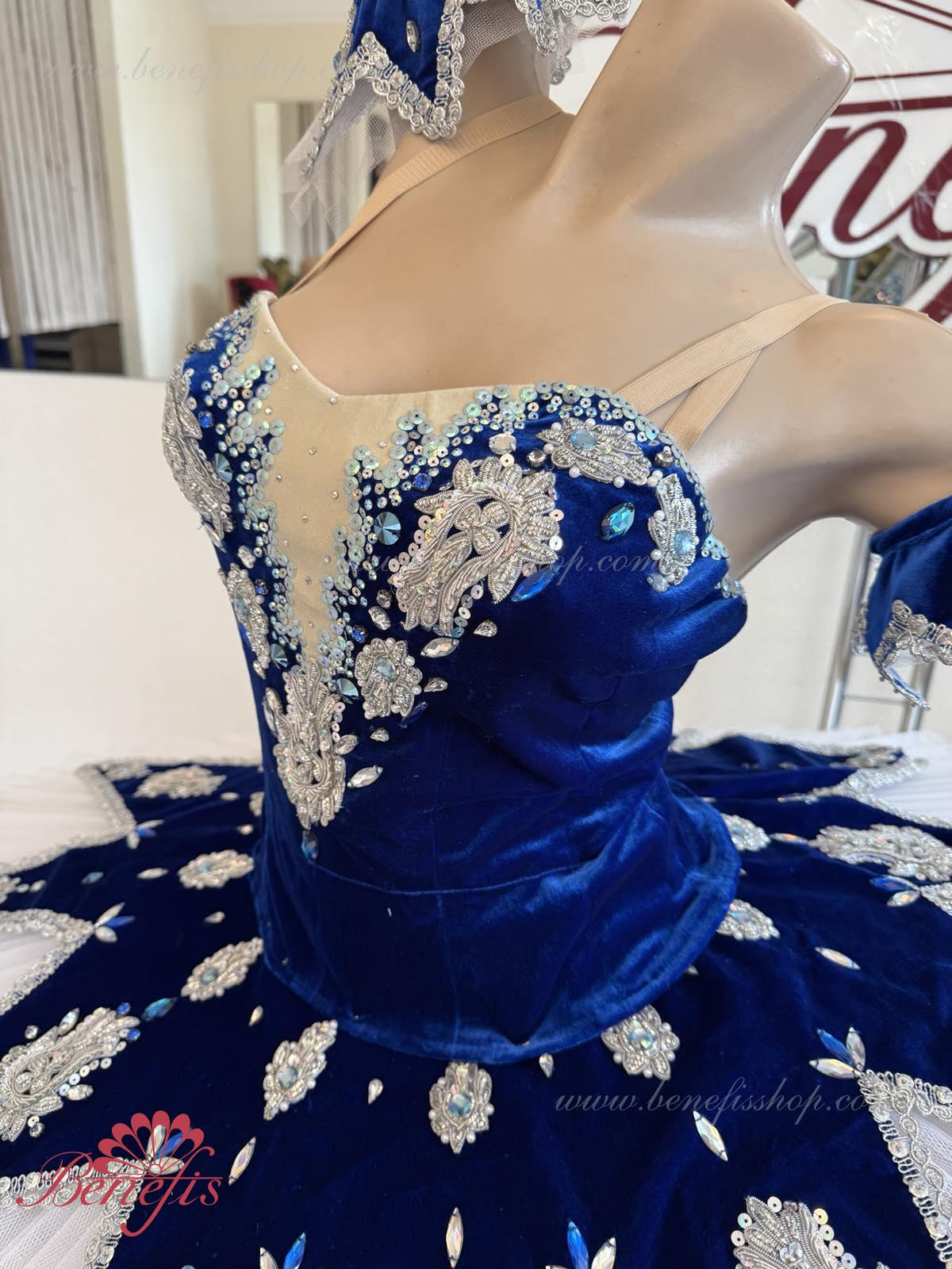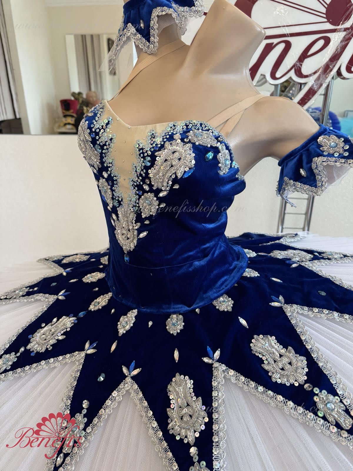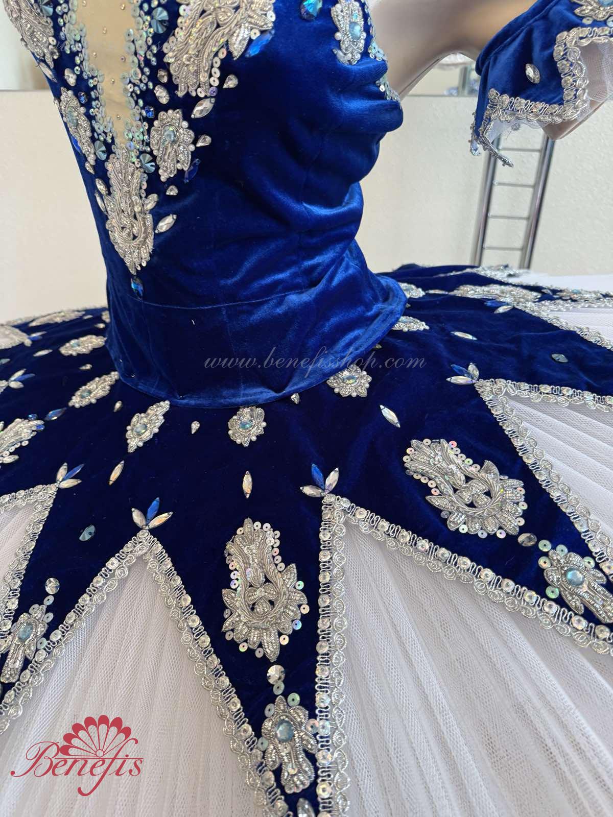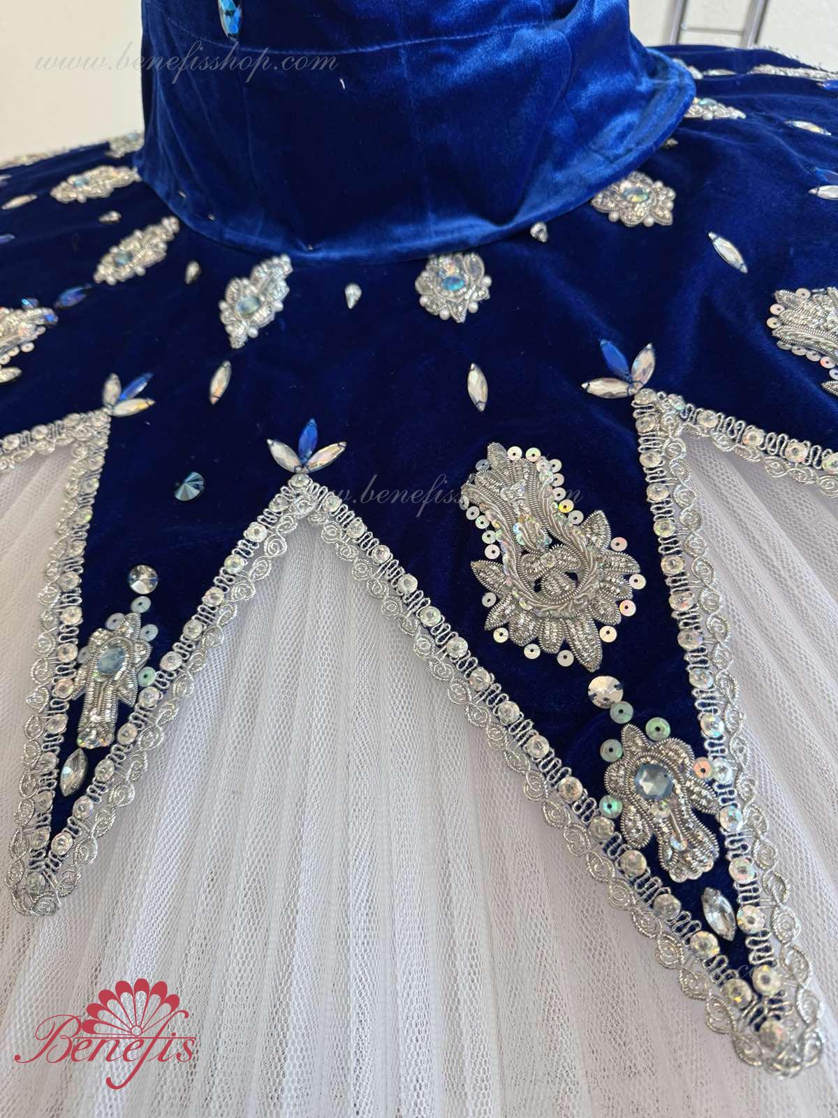 Costum de scena profesionist. Este confectionat in baza fustei de balet profesioniste #T0001B. (vezi compartimentul „Fuste de balet de baza si pentru repetitii”) cu basc cu forme triunghiulare lunge si scurte.