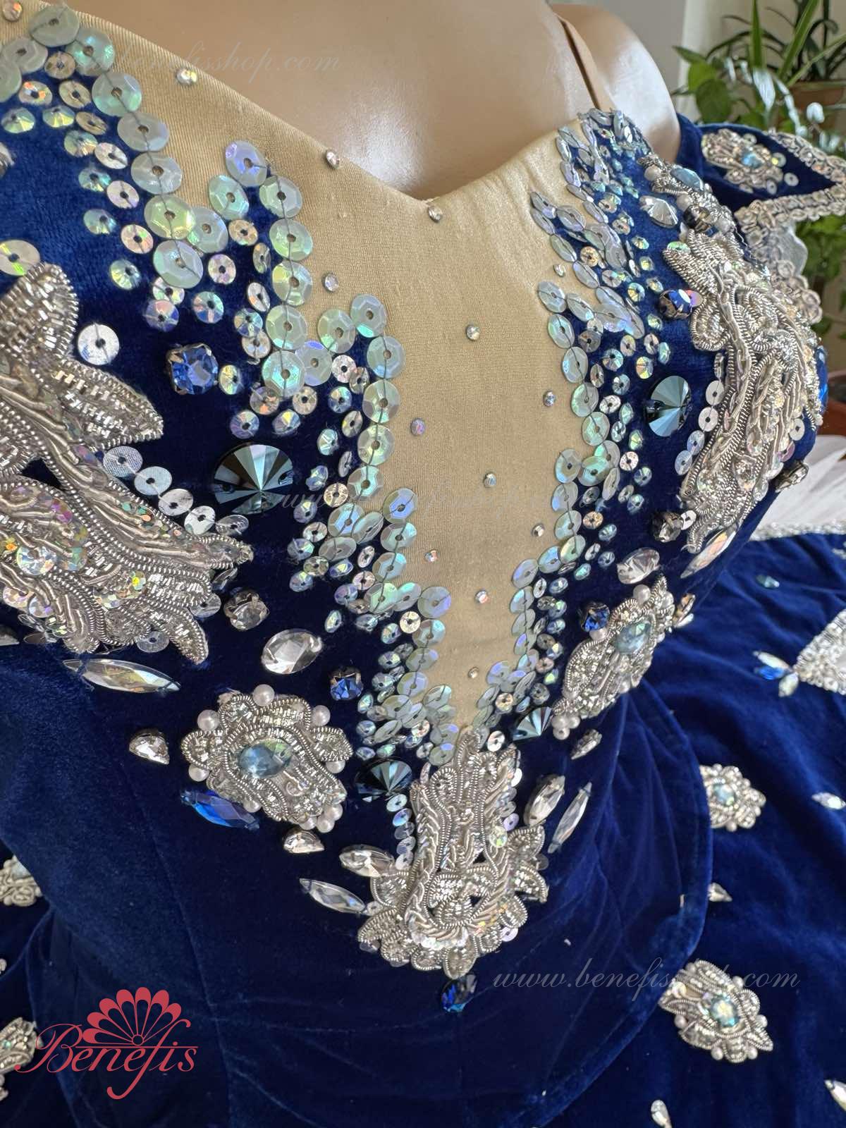 Ca decor al costumului, s-au folosit modele de aplicații, paiete, strasuri alungite de culoarea cristalului de rocă și s-au adăugat câteva perle, care se potrivesc perfect cu culoarea albastru intens, cu toate acestea, costumul poate fi de orice culoare.