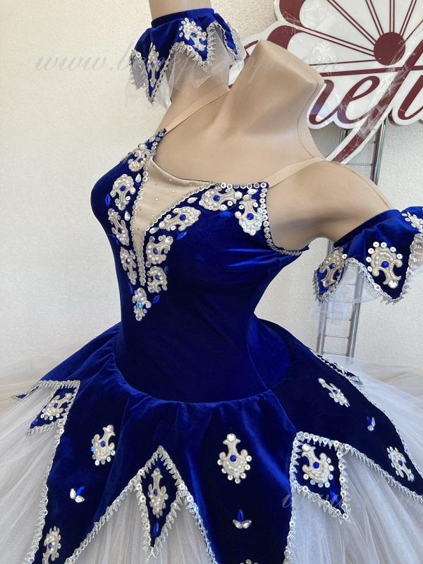 Ca decor al costumului, s-au folosit modele de aplicații, paiete, strasuri alungite de culoarea cristalului de rocă și s-au adăugat câteva perle, care se potrivesc perfect cu culoarea albastru intens, cu toate acestea, costumul poate fi de orice culoare.