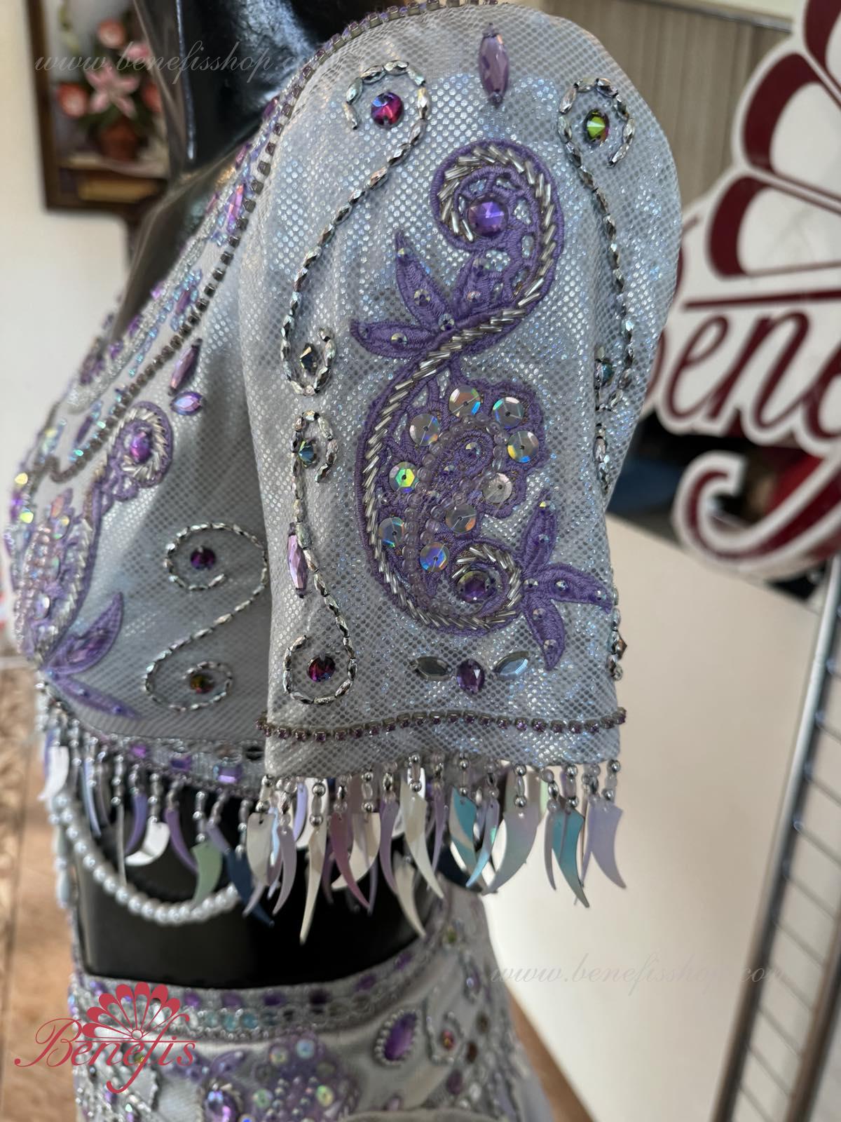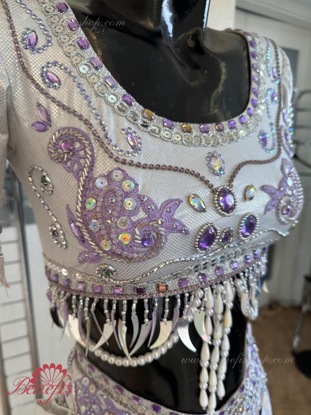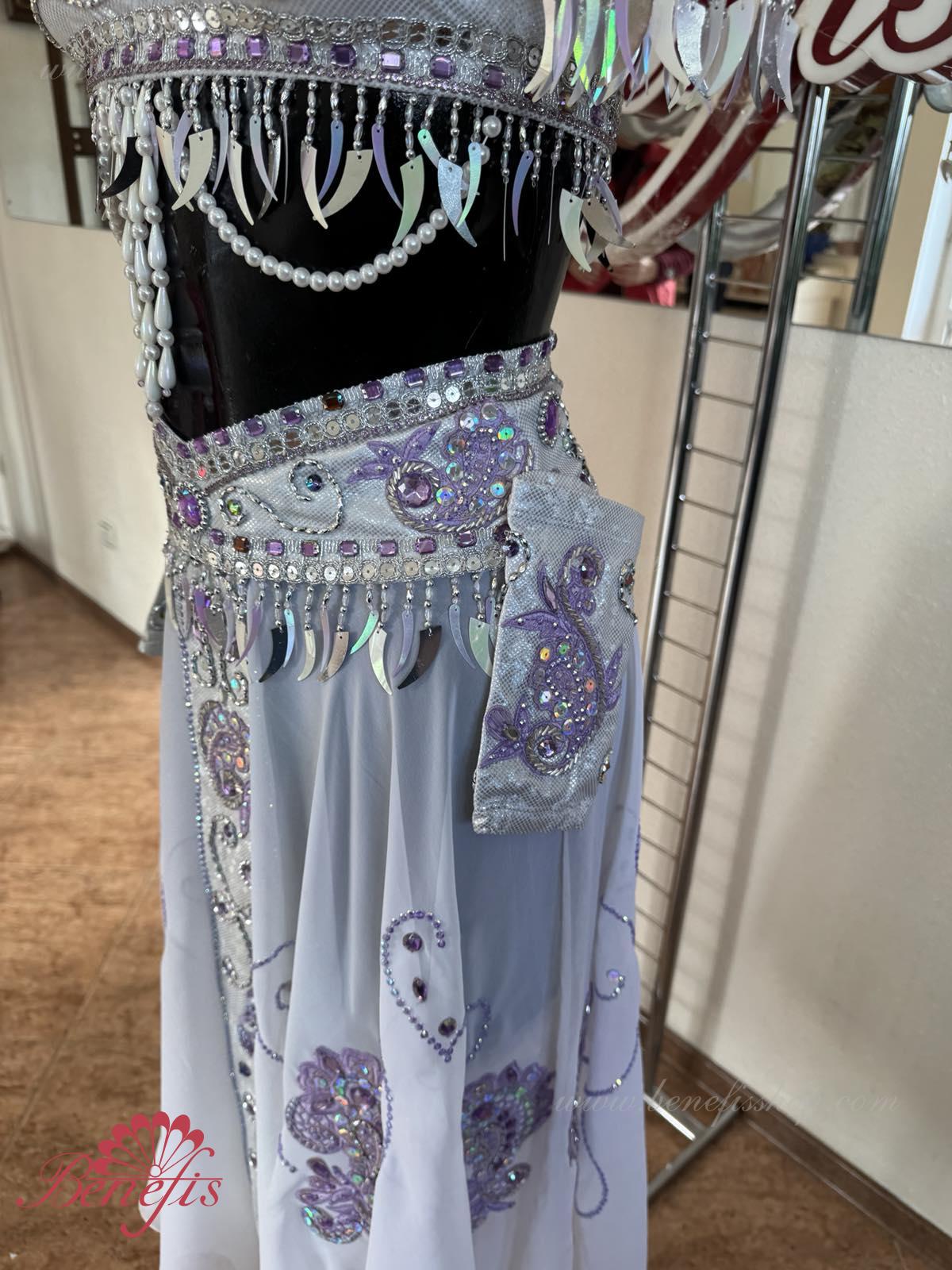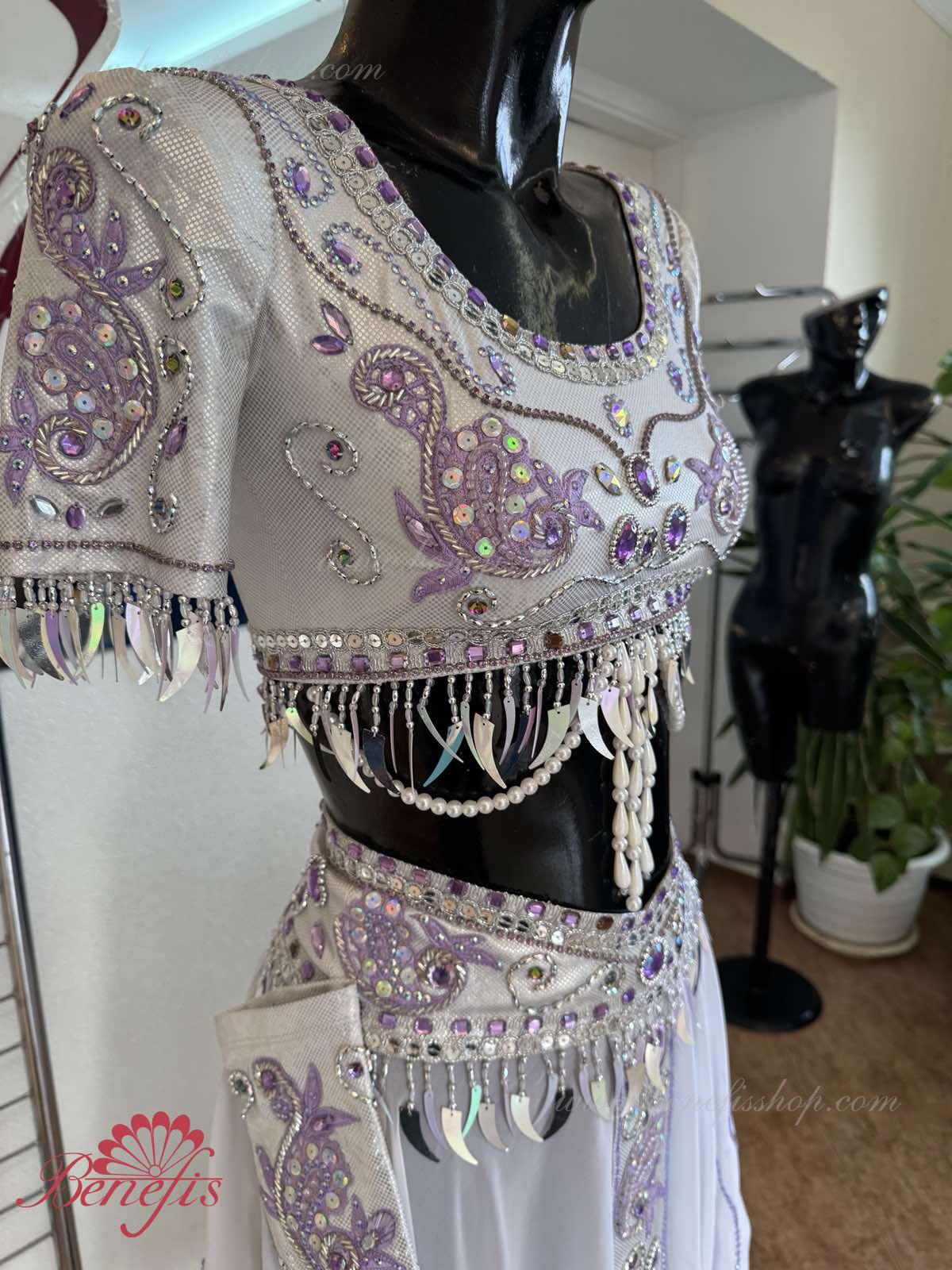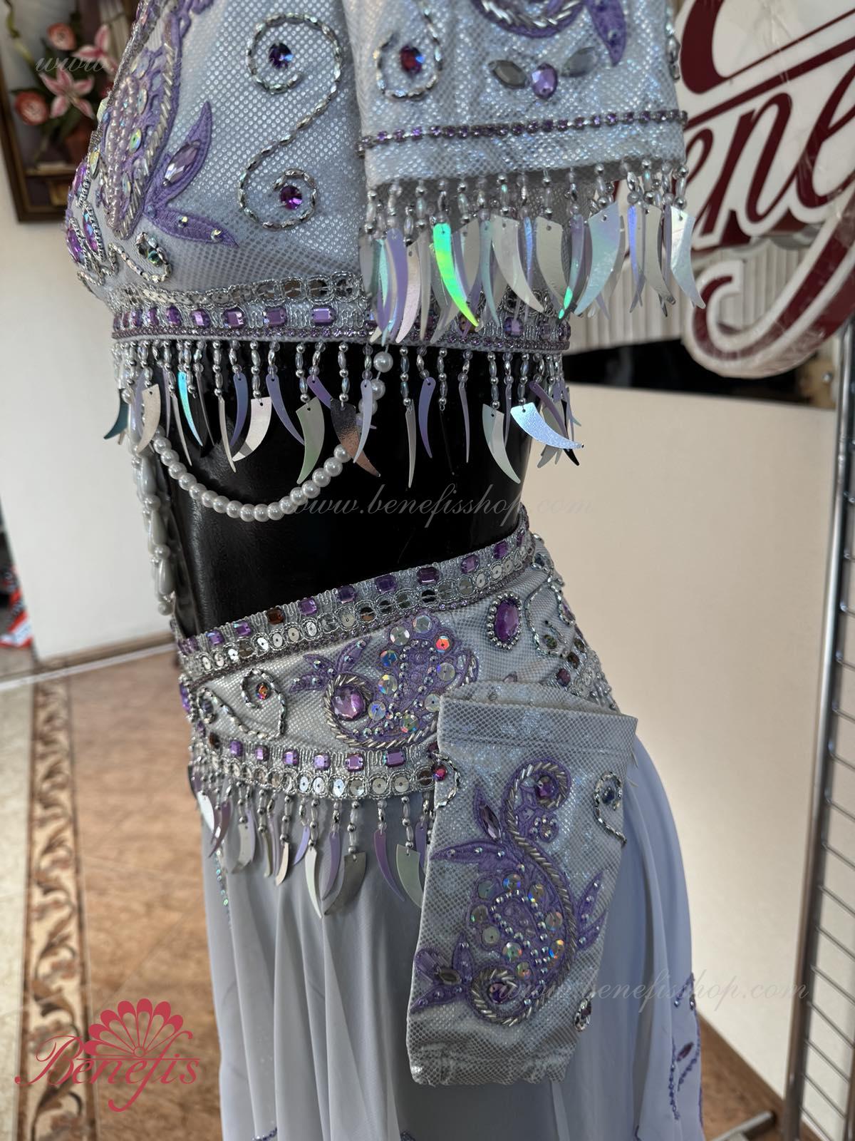 Detalii: corset, fusta, pantaloni elastici stramti, bijuterii pe incheieturi. Costumul este realizat în conformitate cu tradițiile orientale pe baza unui corset, fustă înaltă și pantaloni. Corsetul cu maneci este confectionat din tesatura elastica lucioasa si se termina sub sani. O fustă din țesătură ușoară cu fante pe laterale este realizată sub formă de semicerc și cusută la jugul pantalonilor. Corsetul, centura, fusta și brățările de pe încheieturi sunt decorate cu o compoziție luxoasă modelată sub formă de broderii cu motive etnice de mărgele, strasuri, paiete, mărgele de sticlă și mărgele. De-a lungul părții inferioare a corsetului, de-a lungul marginii mânecilor și de-a lungul liniei centurii, decorul este realizat sub formă de ornamente suspendate precum moniste, mărgele, mărgele și mărgele de sticlă. Originalitatea costumului constă în munca manuală pricepută, care transmite foarte subtil aroma orientală exotică. Costumul poate fi folosit în baletul La Bayadere.