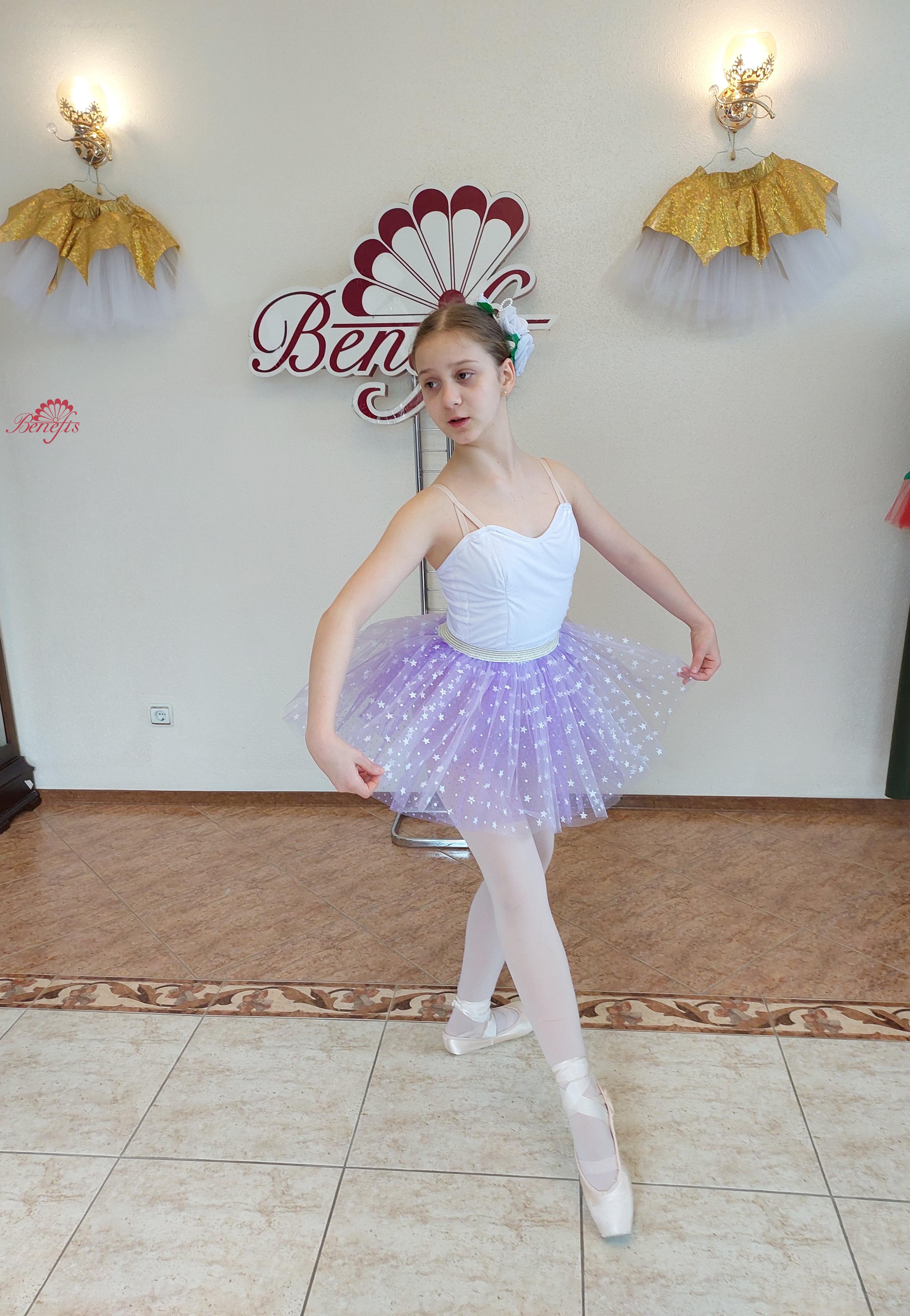 Fusta este indeplinita din 3 straturi de tul cu desen. Fusta este cu banda elastica.