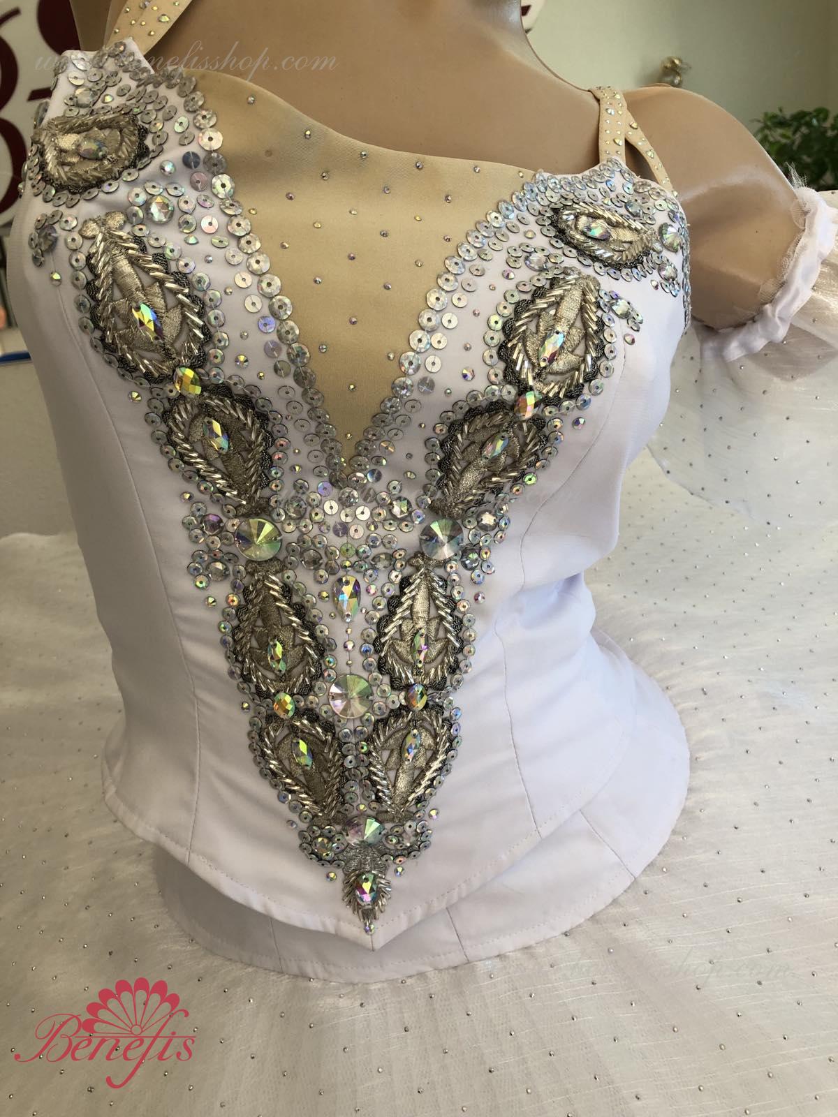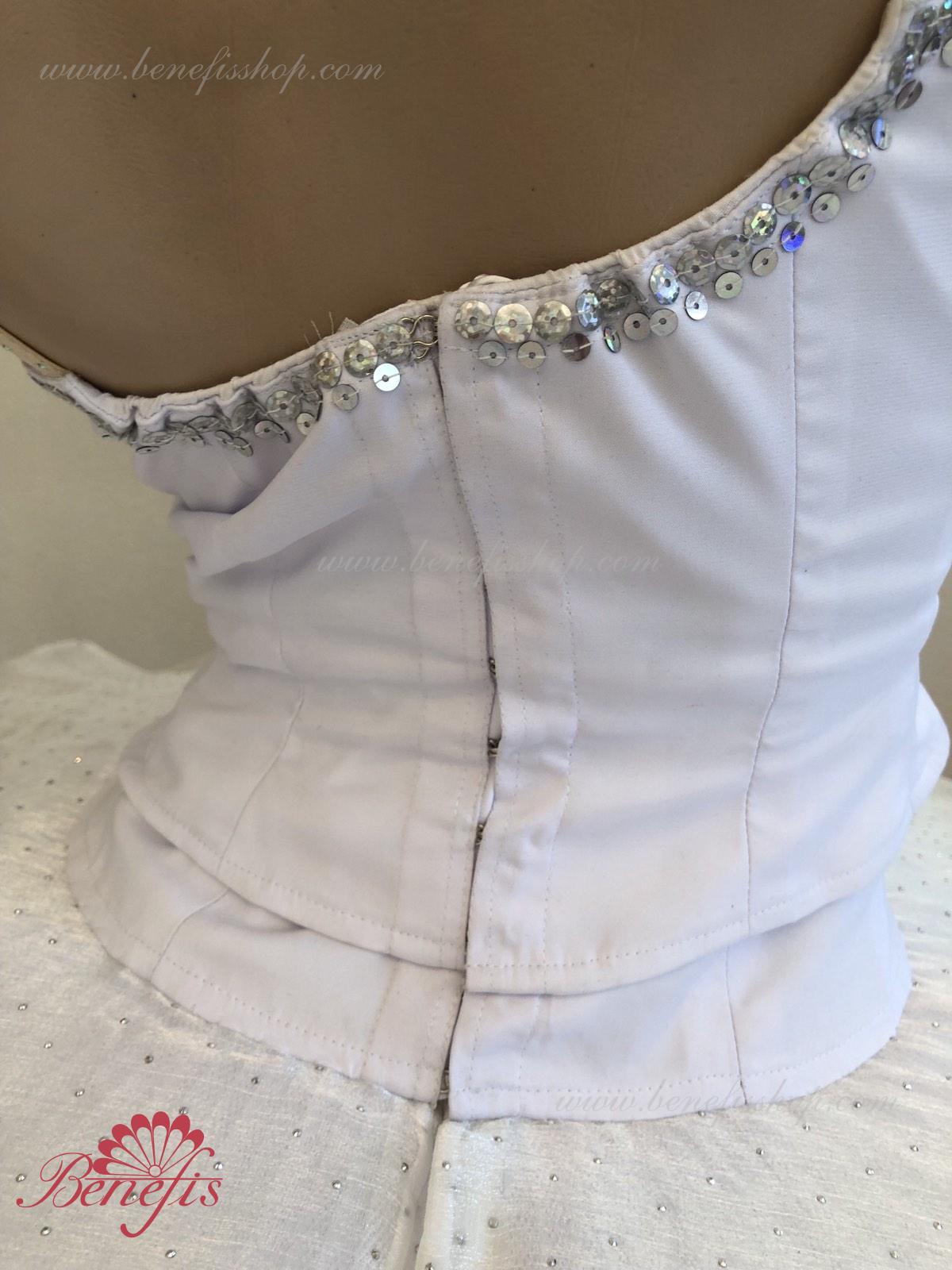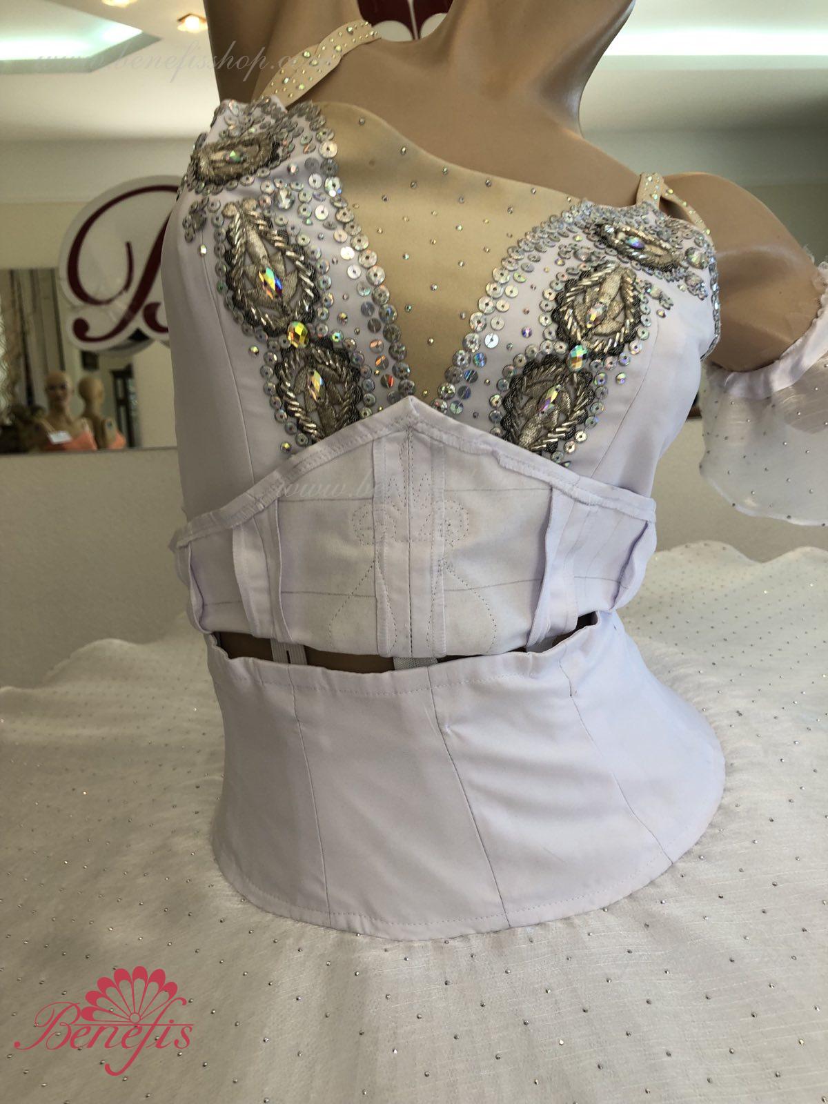 Detalii: costum.Corsetul cu curele elastice, poate fi fabricat din tesatură semi-stretch, precum şi din catifea sau tafta. Acest model este realizat din două părţi, care sunt fixate împreună cu benzi din elastic în zona taliei. Partea de jos este cusută la fusta de balet. Partea superioară este suprapusă părții de jos, care vă permite să reglaţi lungimea de corset, în funcţie de înălțimea balerinei, corsetul oferind astfel o mai mare flexibilitate.