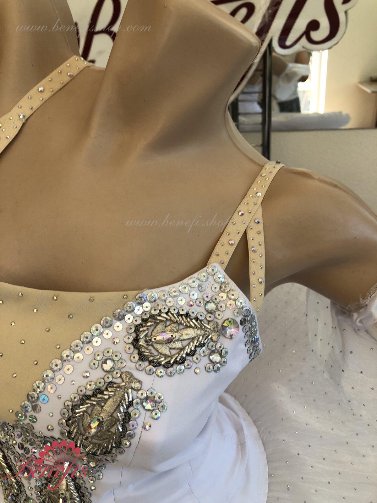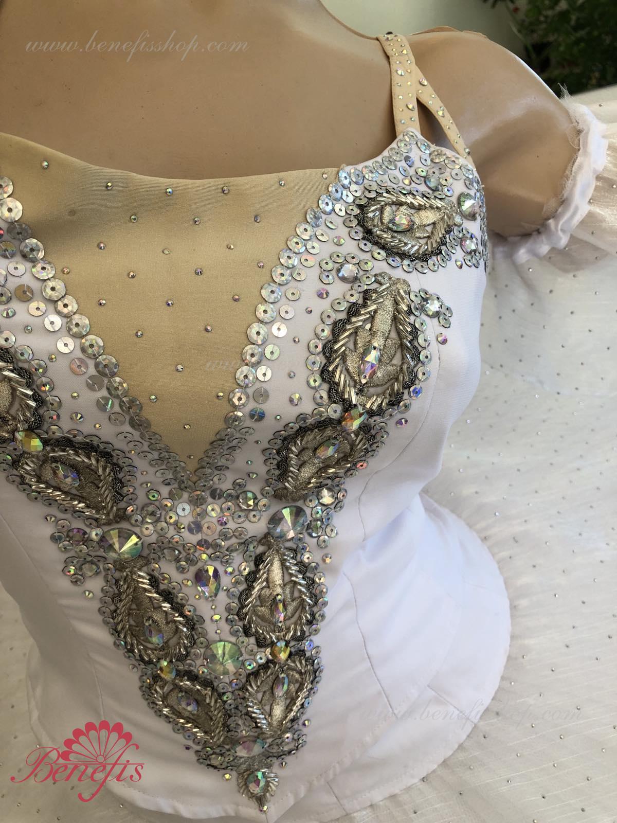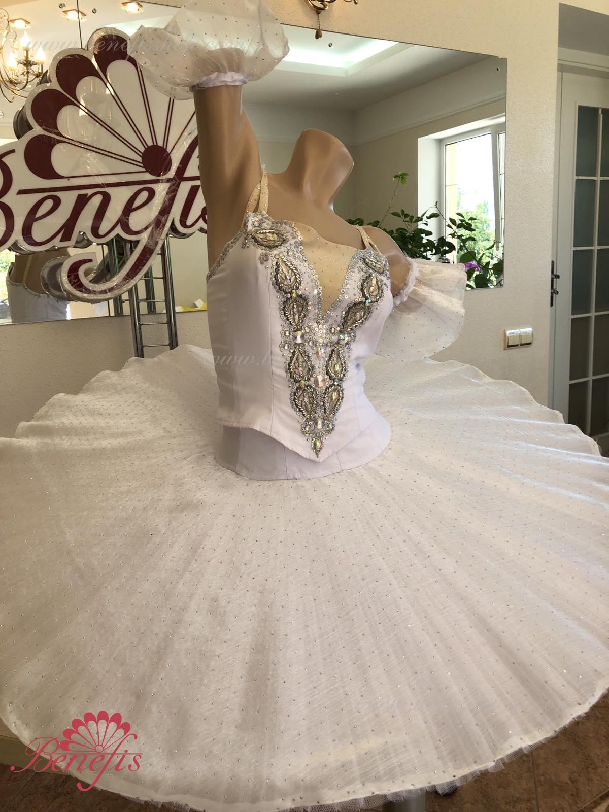 Detalii: costum.Corsetul cu curele elastice, poate fi fabricat din tesatură semi-stretch, precum şi din catifea sau tafta. Acest model este realizat din două părţi, care sunt fixate împreună cu benzi din elastic în zona taliei. Partea de jos este cusută la fusta de balet. Partea superioară este suprapusă părții de jos, care vă permite să reglaţi lungimea de corset, în funcţie de înălțimea balerinei, corsetul oferind astfel o mai mare flexibilitate.