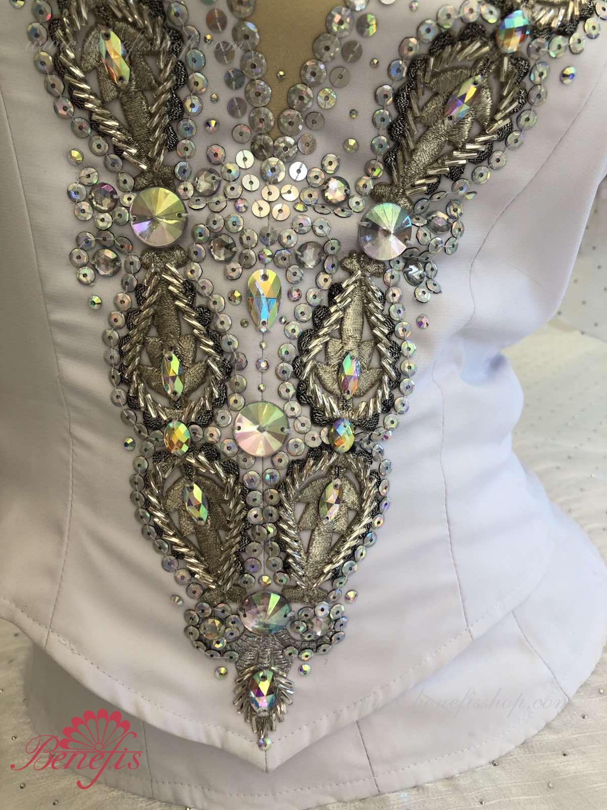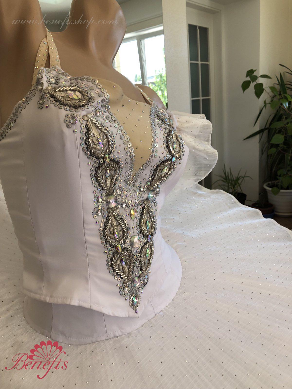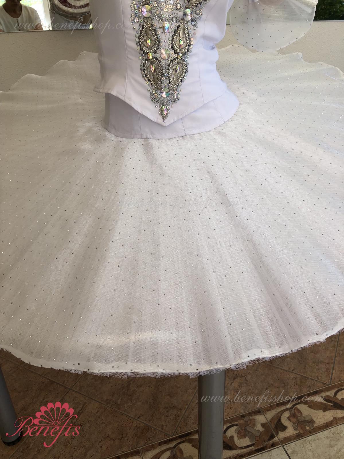 Tutu are șapte perechi de cârlige și bucle pe partea din spate. Decor: strasuri, aplicații, paiete, organza cu imitație strasuri.