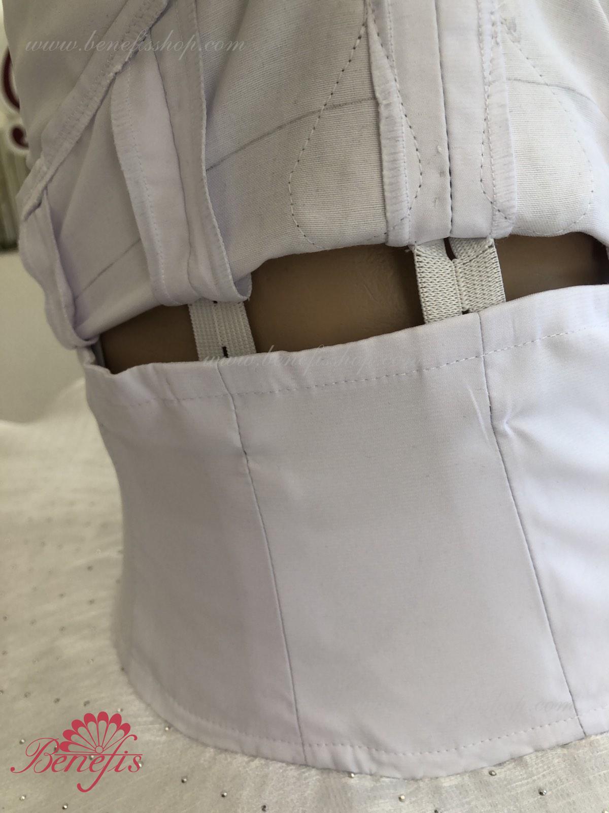 Corsetul se prinde cu ajutorul cîrligelor în doua rînduri pentru reglare comodă, iar cordonul intern permite tragerea corsetului în zona pieptului.Zece straturi gradate plisate de tul rigid-nouă lungi și unul scurt pe chiloți din tul cu un jug de 8 cm atașat la o centură elastică.