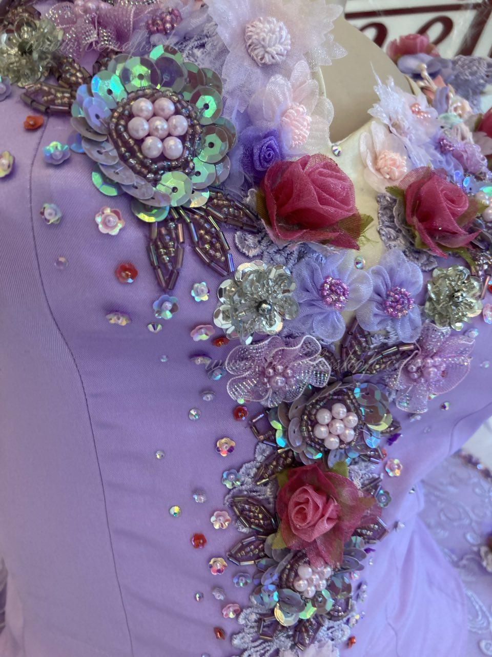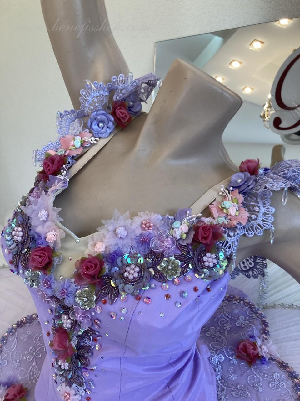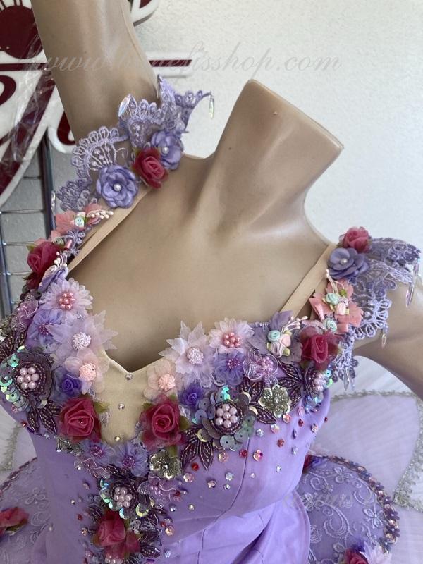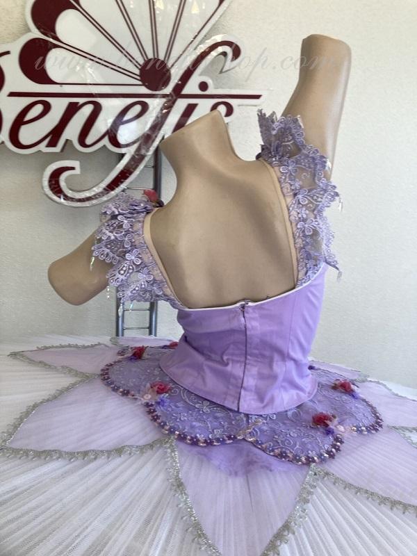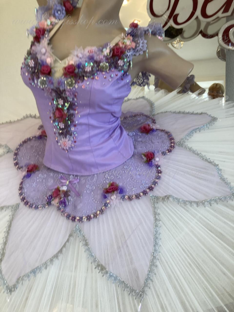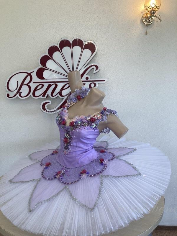 Detalii: costum, anvelopă, mâneci și peplum.Corsetul este confectionat din tesatura densa semi-stretch. Pe corset sunt prezente doua rinduri de chirlige pentru regularea comoda si un snur intern pentru stringerea corsetului la nivelul pieptului.Pe piept se intrevede o insertie de culoarea pielii. Chingele sunt de culoarea pielii.Opt straturi plisate gradate de tul semi-moale - sapte lungi si un scurt, aseazate pe chilotei din tul cu platca de 10 cm fixata pe centura elastica.