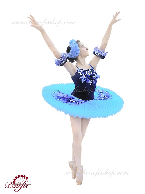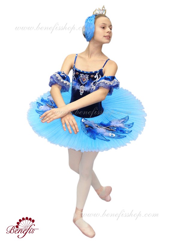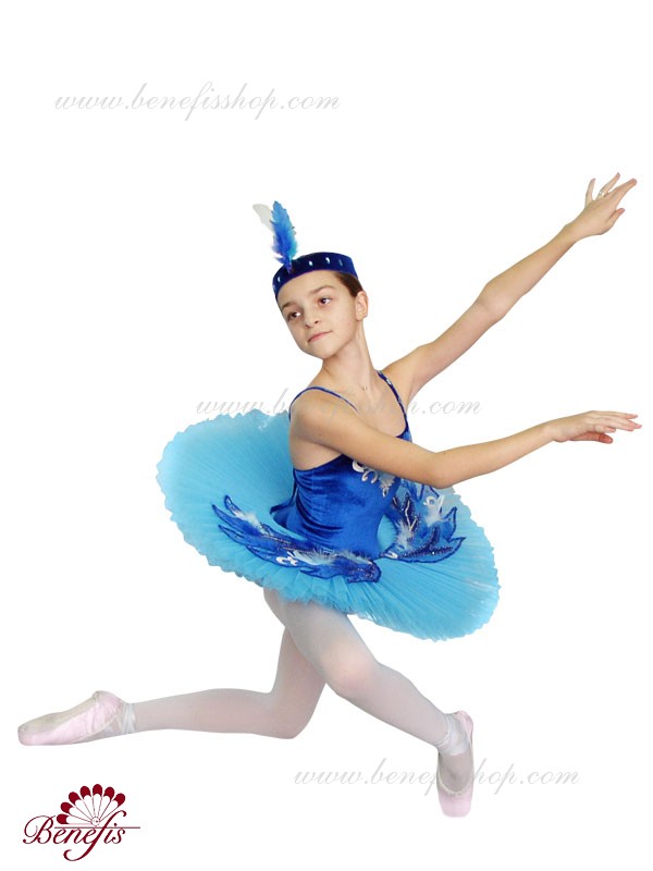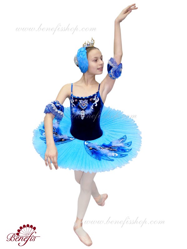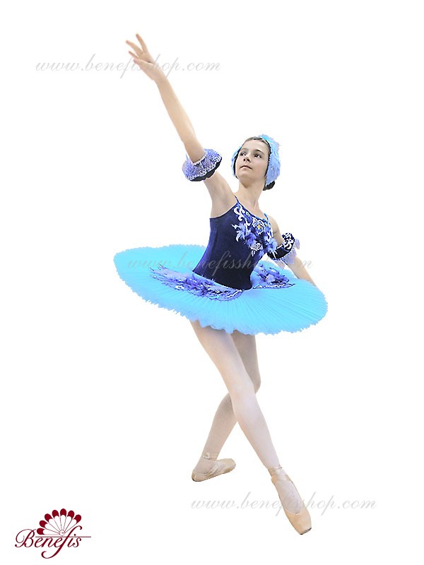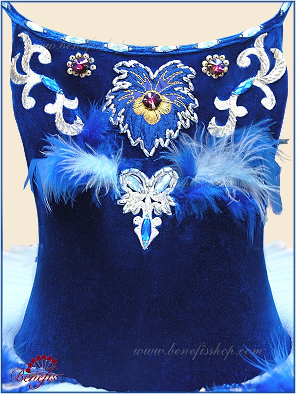Costumul este indeplinit in baza tricoului elastic si fustei cu cercuri, cu un decor bogat in forma de aripi ca la Principesa Florina ( baletul “Frumoasa Adormita”, variatia Pasarii Albastre). Pe corset sunt prezente aplicatii, brodate cu strase si paiete. Obada nu este inclusa in pretul costumului. Va puteti procura obada pentru plata suplimentara. Vedeti “Accesorii”.