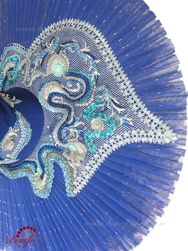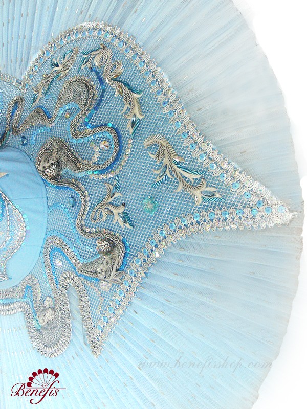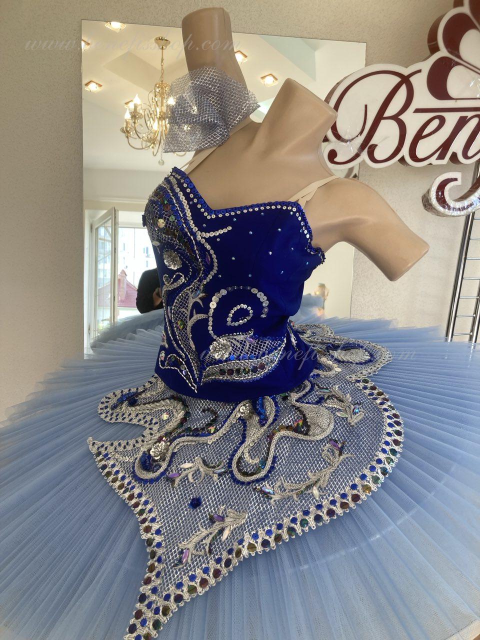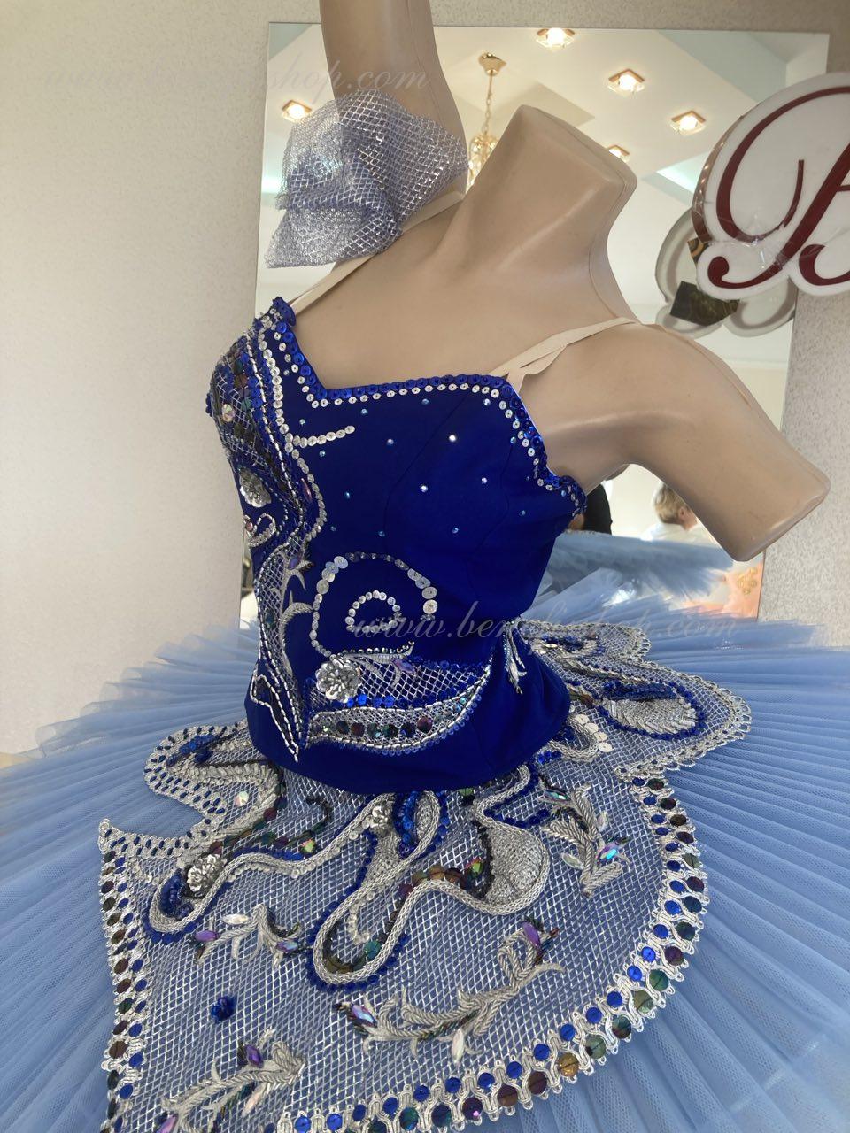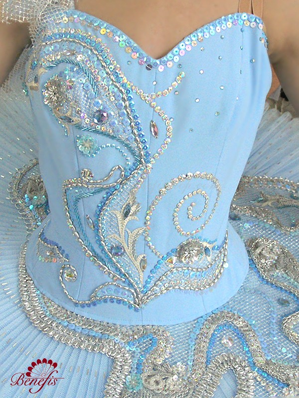 Costum de scena profesionist. Este confectionat in baza fustei de balet profesioniste #T0001B (vezi compartimentul „Fuste de balet de baza”).Corsetul din țesătură densă semi-elastică este realizat pe curele de culoarea pielii.