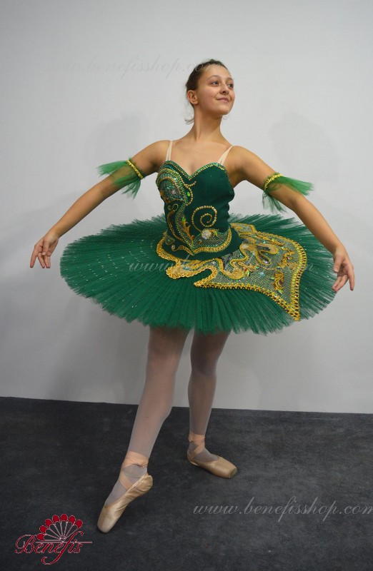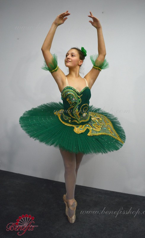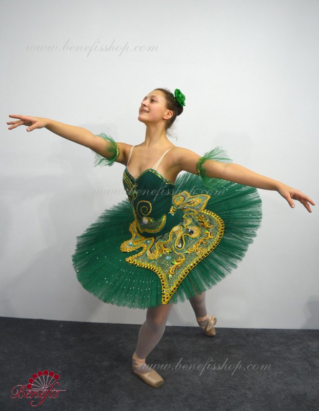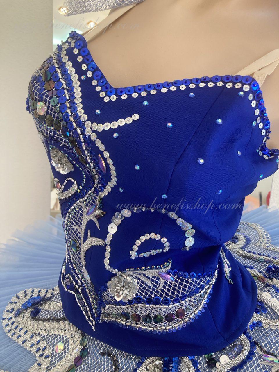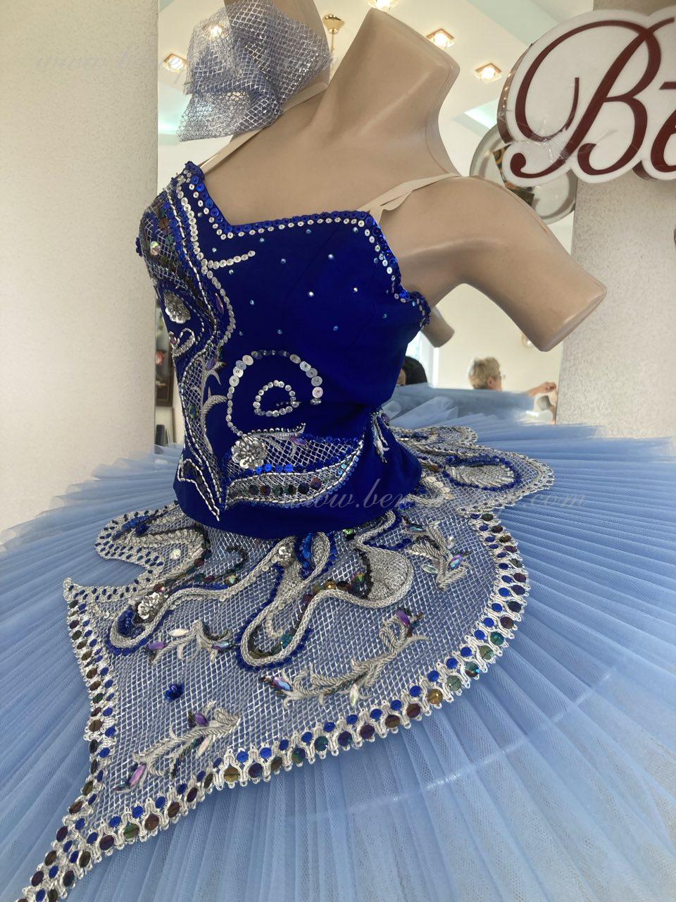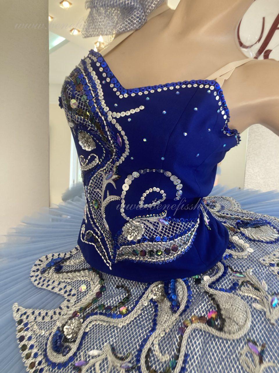 Costum de scena profesionist. Este confectionat in baza fustei de balet profesioniste #T0001B (vezi compartimentul „Fuste de balet de baza”).Corsetul din țesătură densă semi-elastică este realizat pe curele de culoarea pielii.