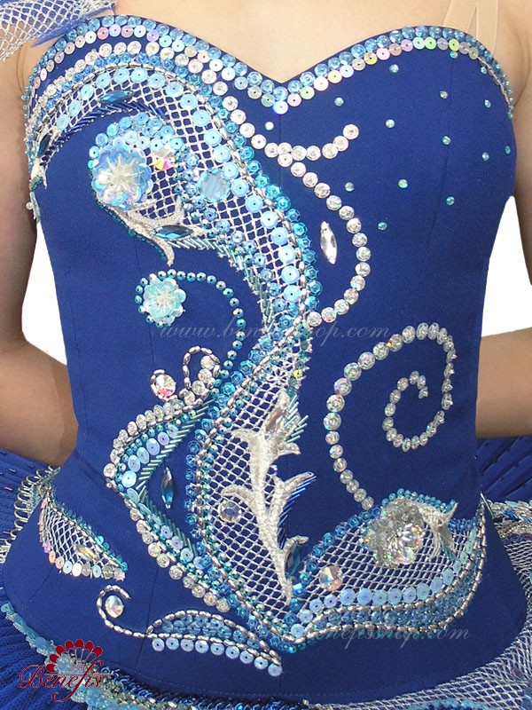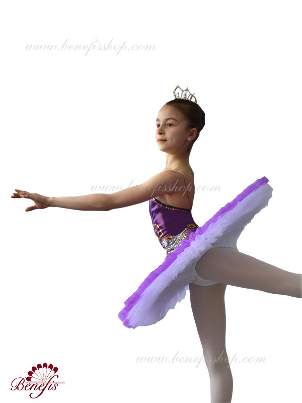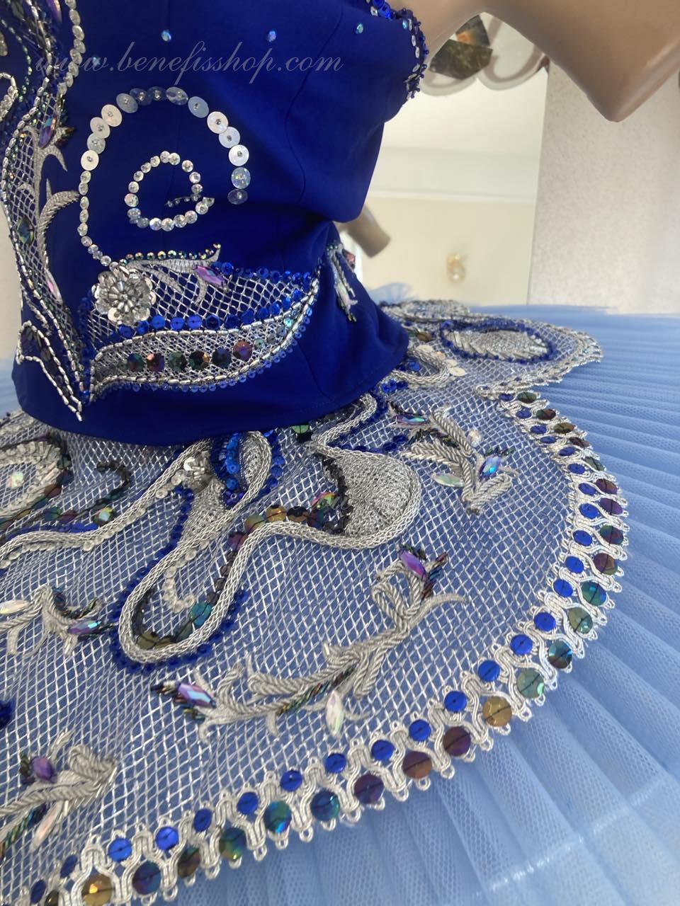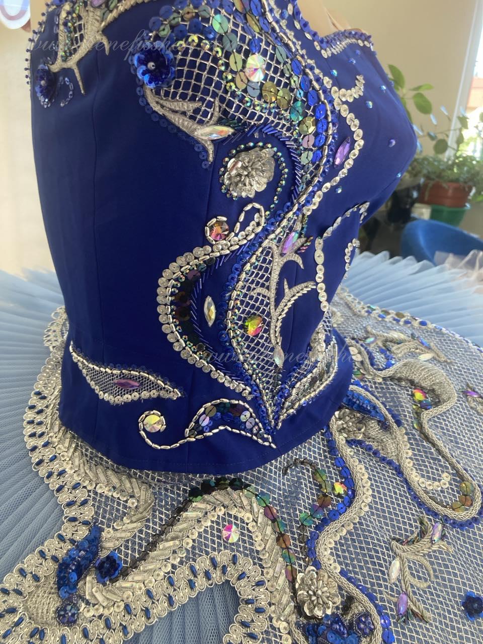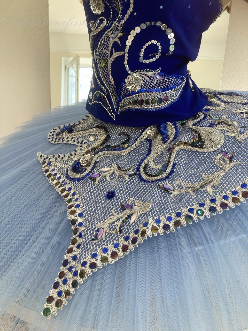 Costum de scena profesionist. Este confectionat in baza fustei de balet profesioniste #T0001B (vezi compartimentul „Fuste de balet de baza”).Corsetul din țesătură densă semi-elastică este realizat pe curele de culoarea pielii.