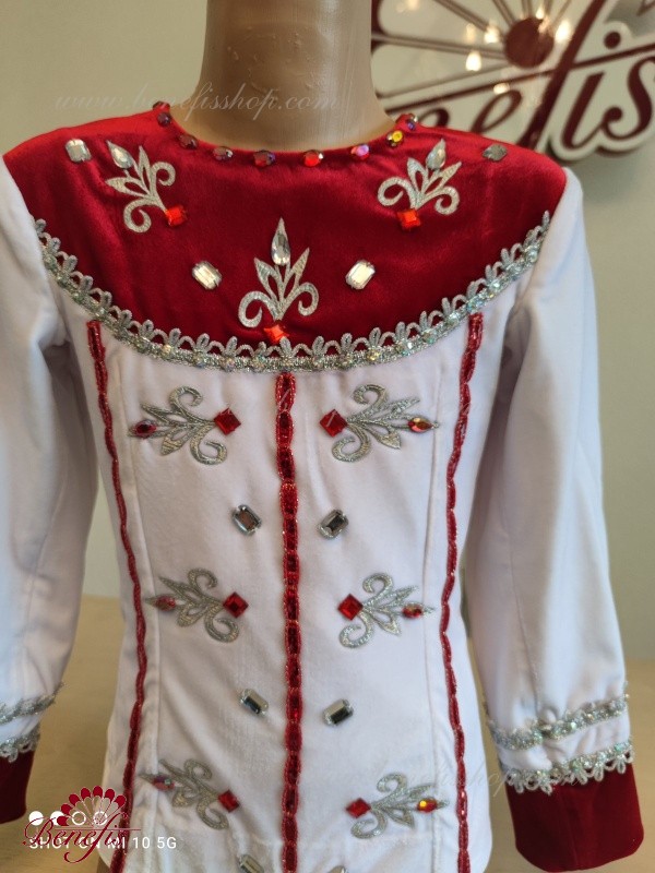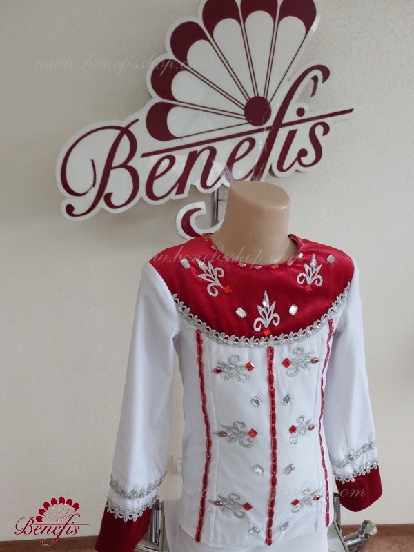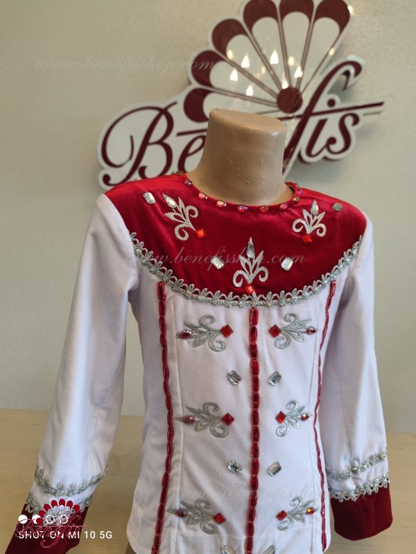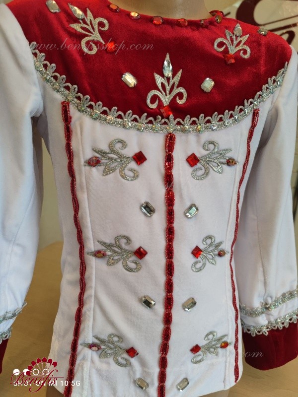 Detalii: tunica. Acest costum profesional de scenă este realizat din catifea elastică pe o bază densă. Pietre multicolore, margele, margele de sticla si paiete, panglica sunt folosite pentru a crea o compozitie elaborata pe partea din fata a coletului.