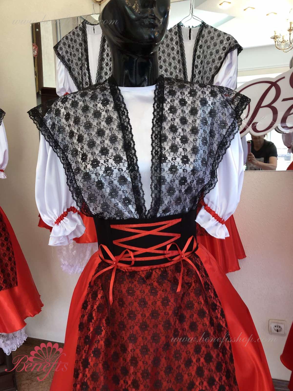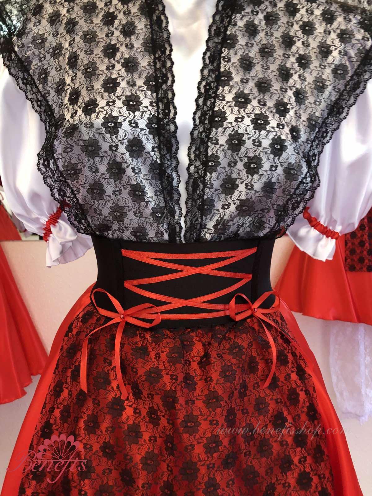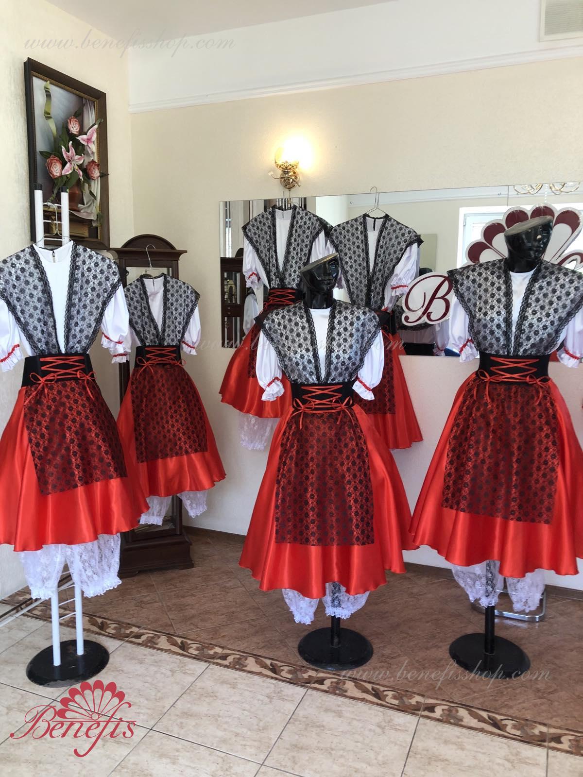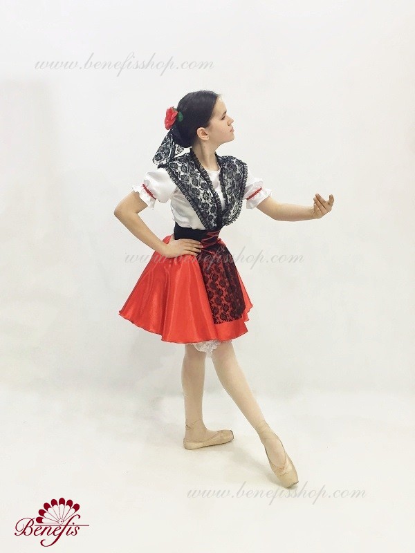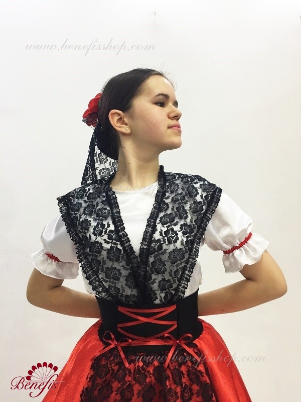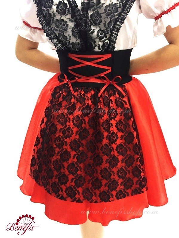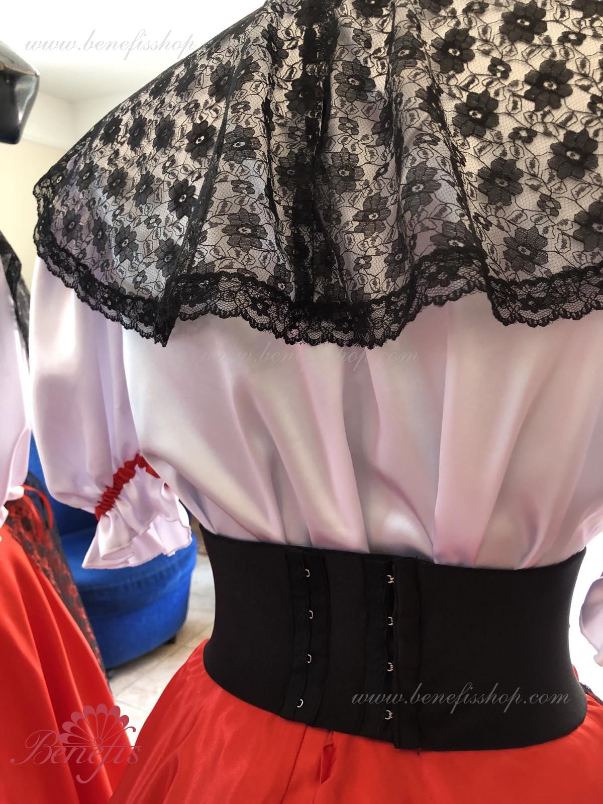 Detalii: bluză, fustă, curea, pantaloni. Acest costum de scenă de balet se bazează pe o bluză ușoară din sifon cu guler gipur. Fusta din satin are volane delicate din tul ușor și este acoperită cu un șorț de guipură deasupra. Centura elastică este fixată în spate cu cârlige pe panglică de sub partea inferioară a fustei se prevad pantalonii din ghipură.