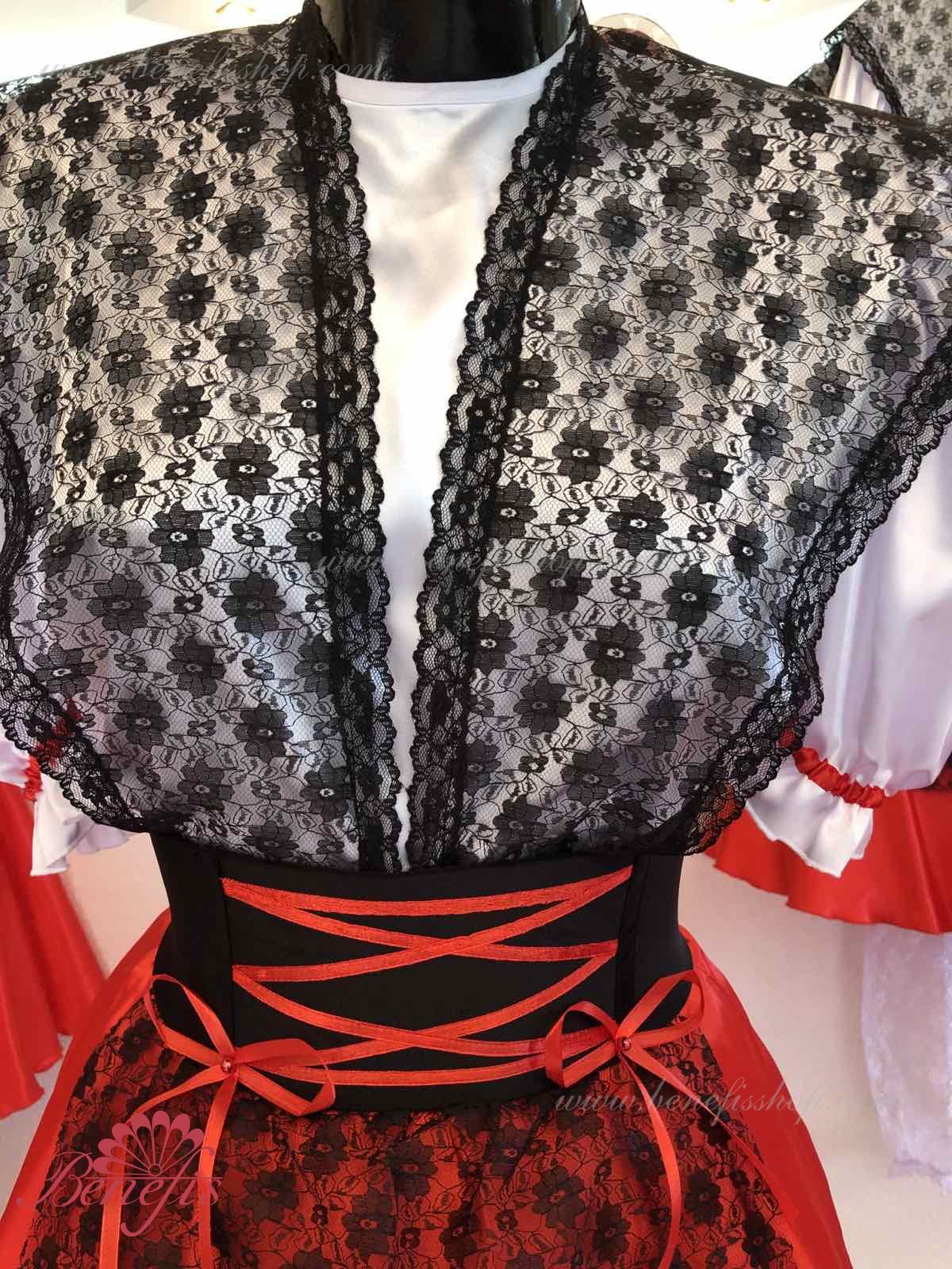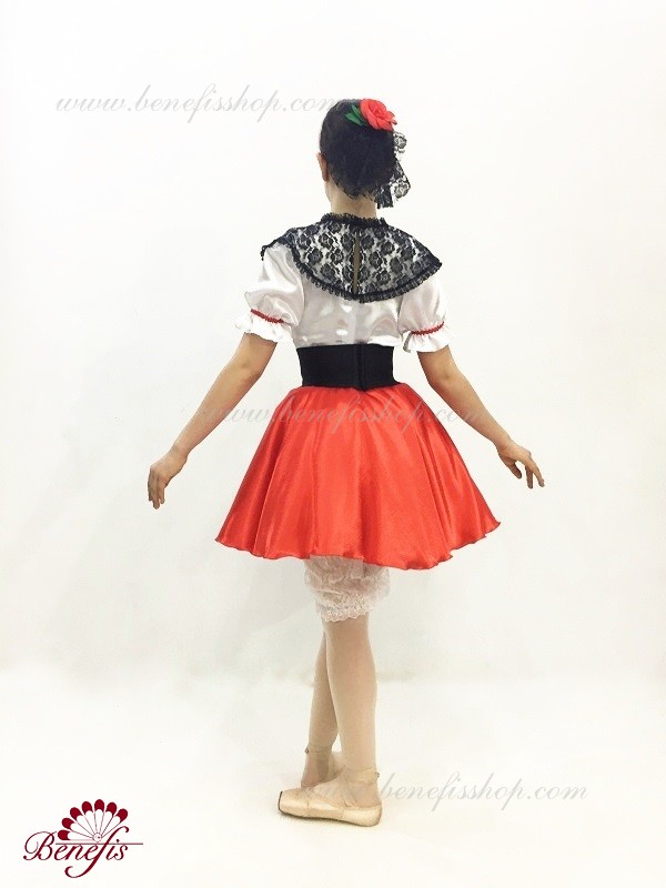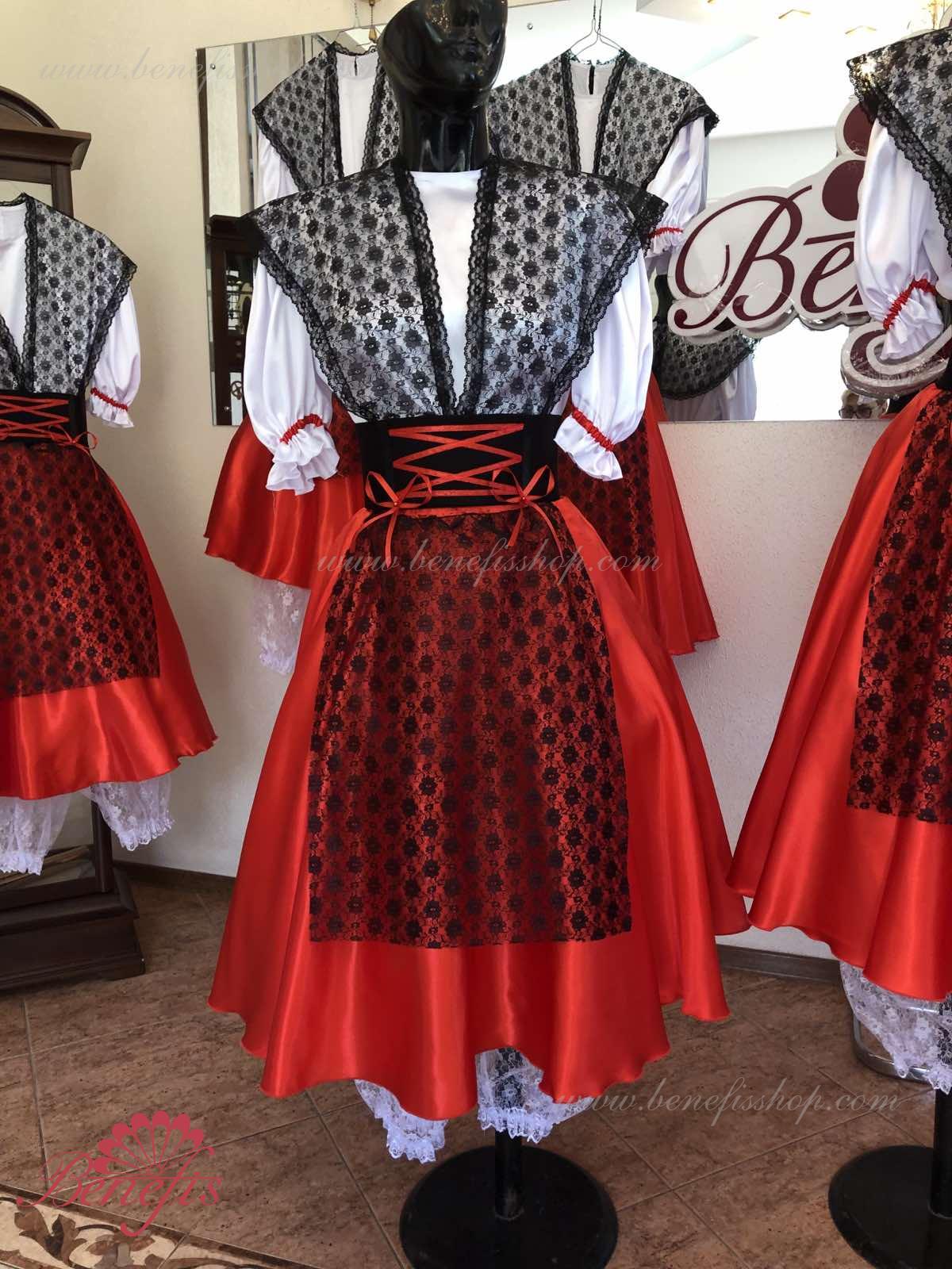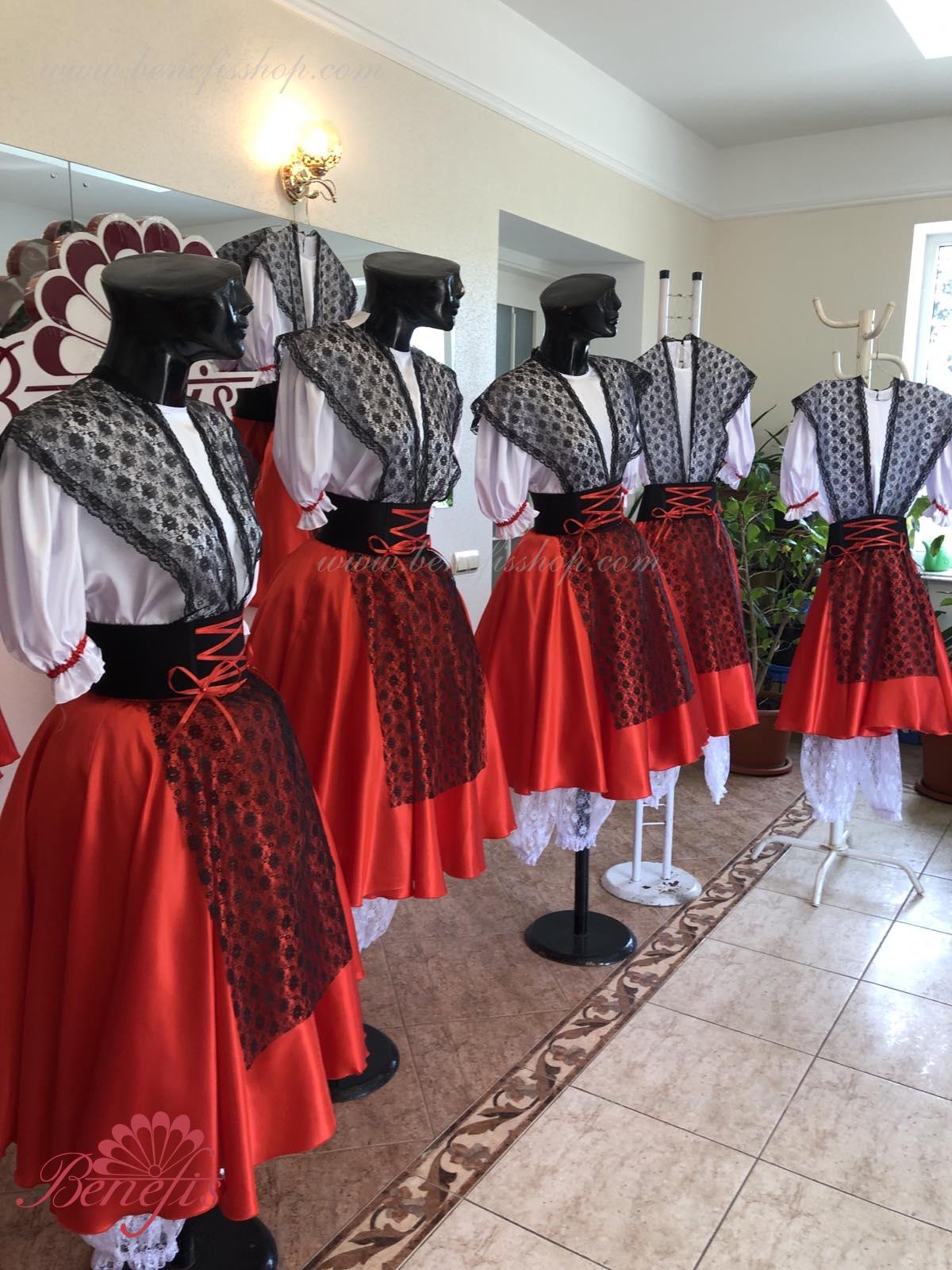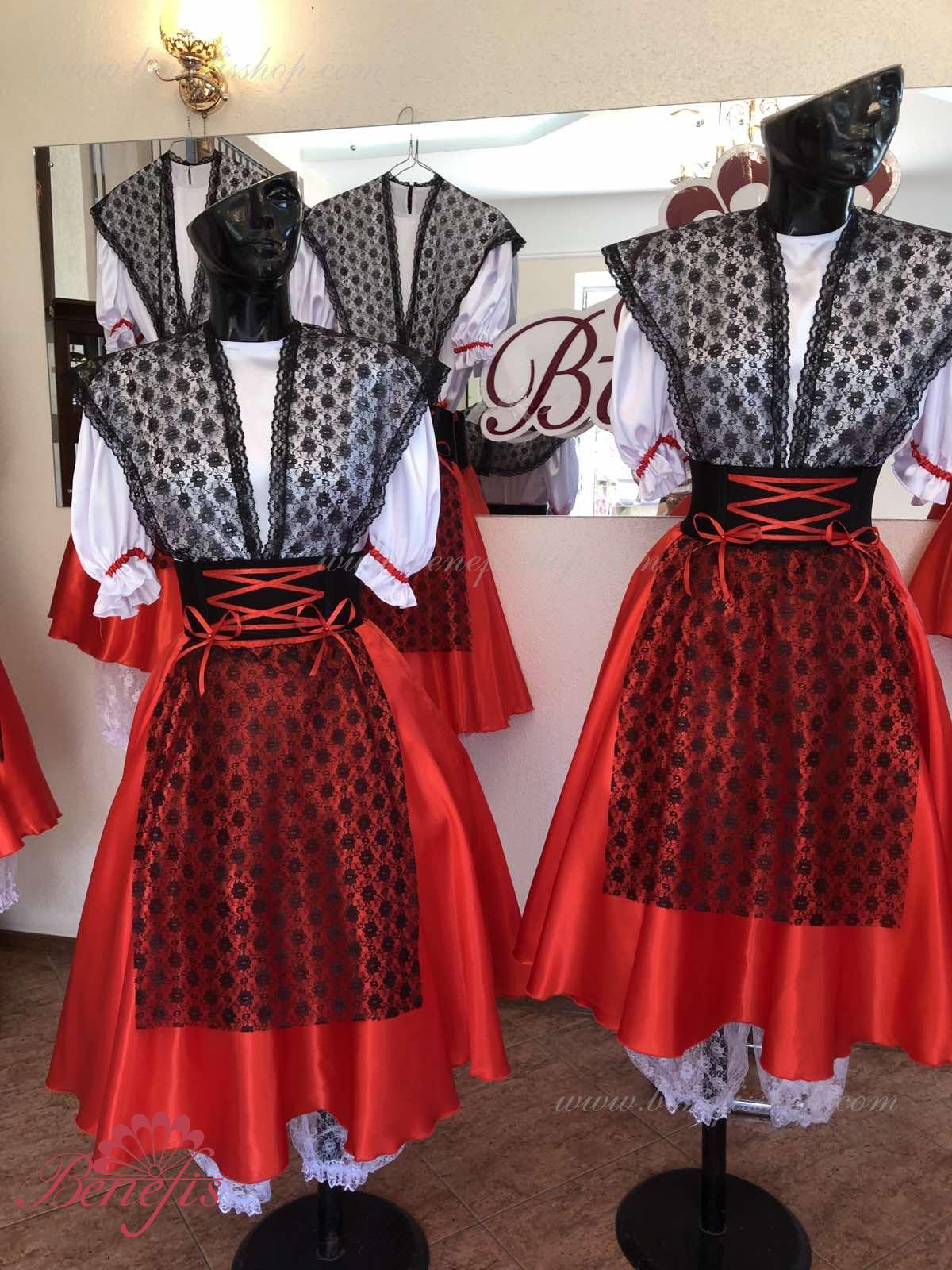 Detalii: bluză, fustă, curea, pantaloni. Acest costum de scenă de balet se bazează pe o bluză ușoară din sifon cu guler gipur. Fusta din satin are volane delicate din tul ușor și este acoperită cu un șorț de guipură deasupra. Centura elastică este fixată în spate cu cârlige pe panglică de sub partea inferioară a fustei se prevad pantalonii din ghipură.