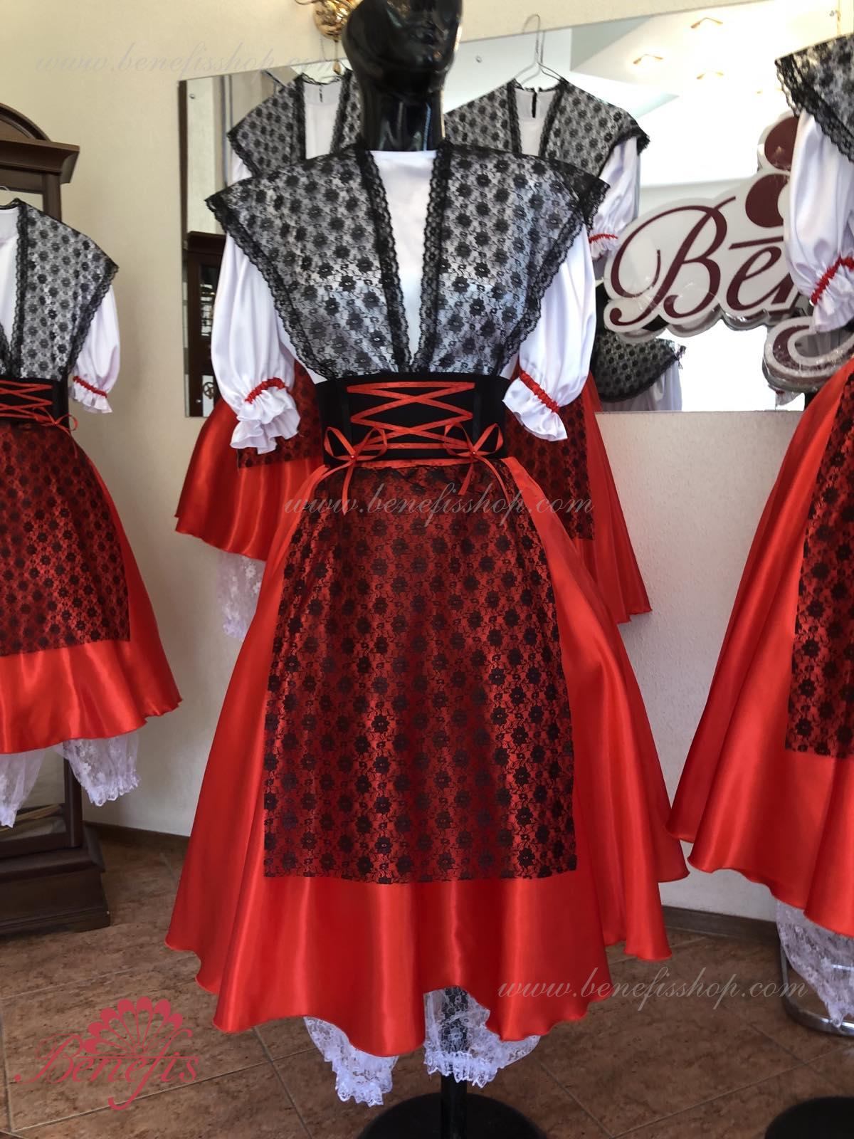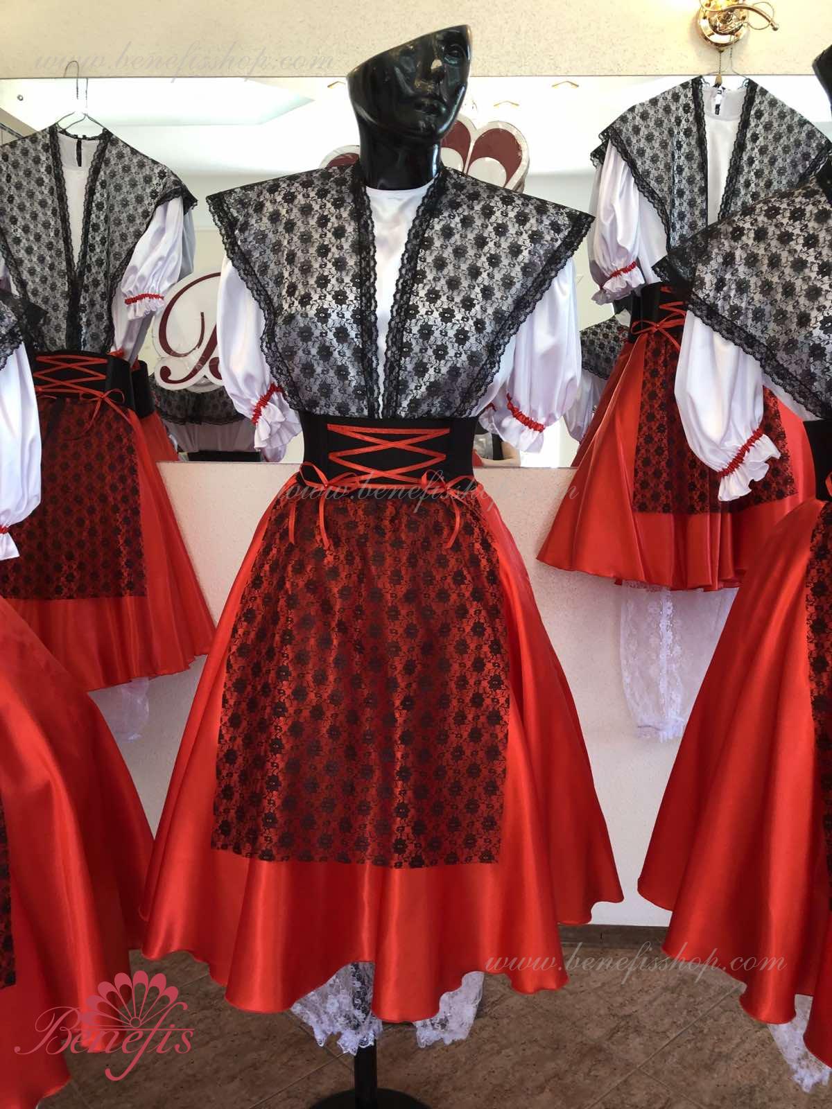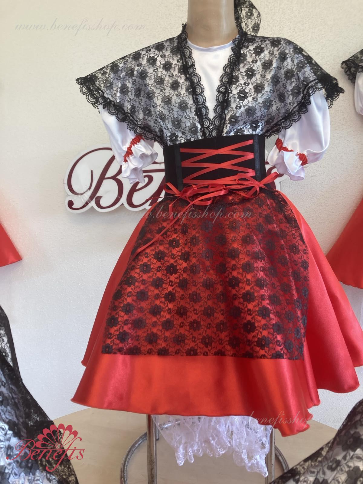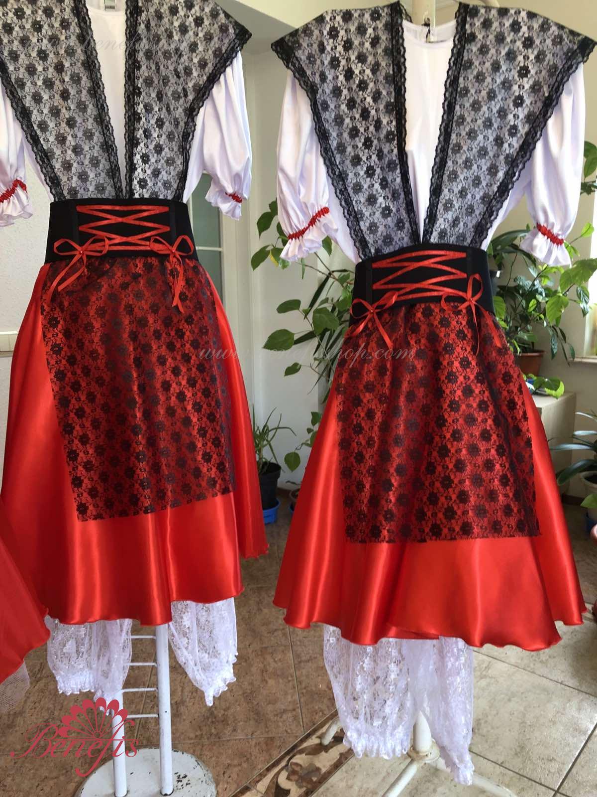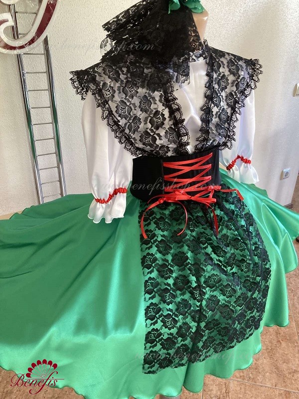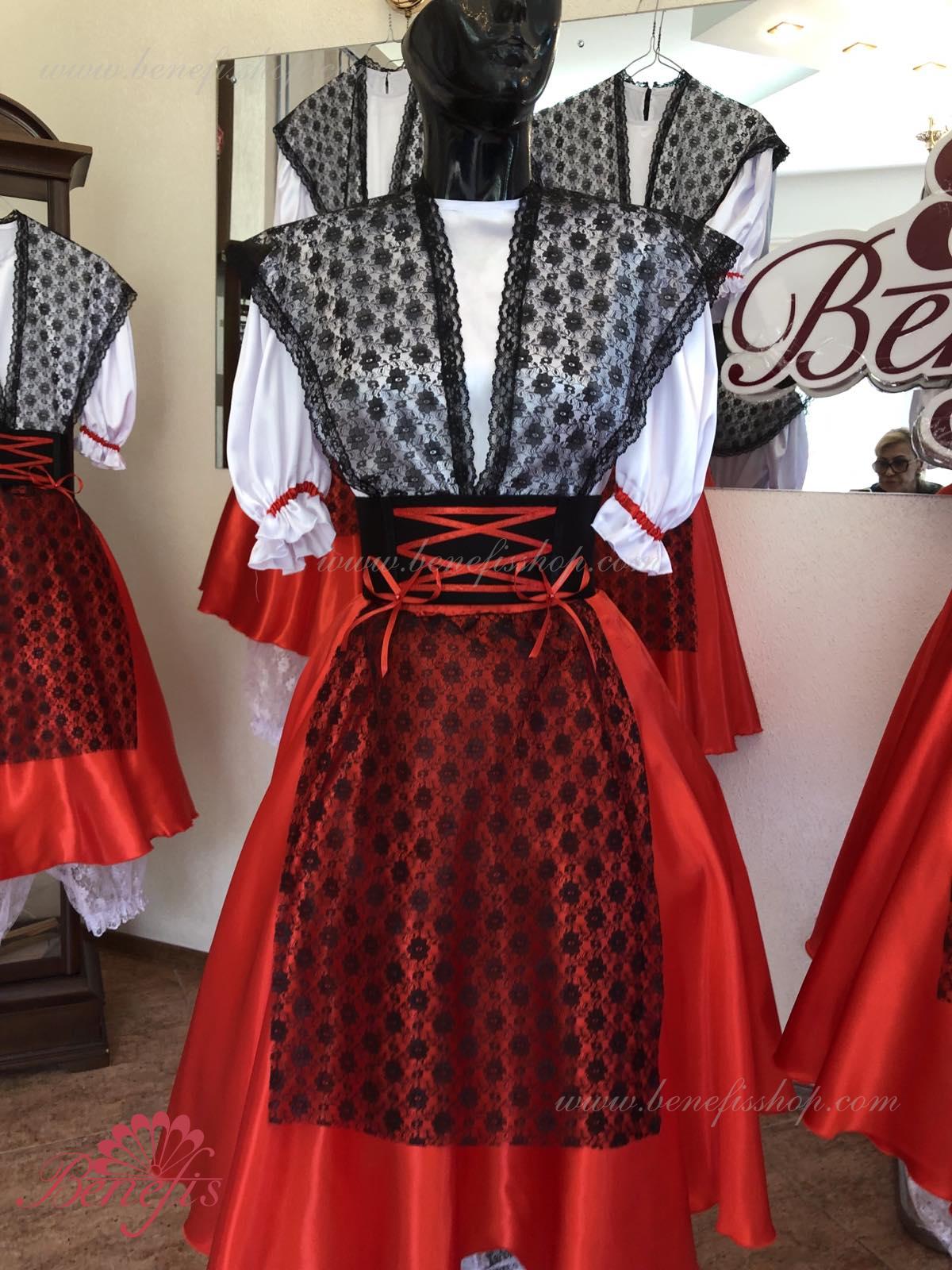 Detalii: bluză, fustă, curea, pantaloni. Acest costum de scenă de balet se bazează pe o bluză ușoară din sifon cu guler gipur. Fusta din satin are volane delicate din tul ușor și este acoperită cu un șorț de guipură deasupra. Centura elastică este fixată în spate cu cârlige pe panglică de sub partea inferioară a fustei se prevad pantalonii din ghipură.