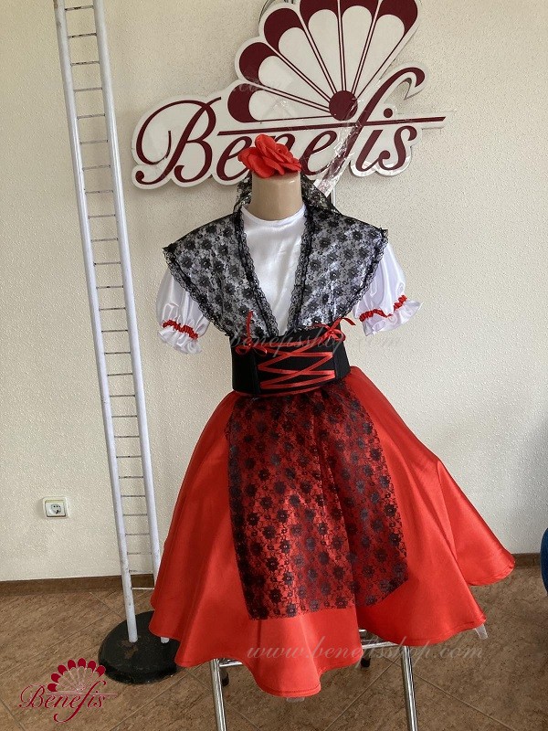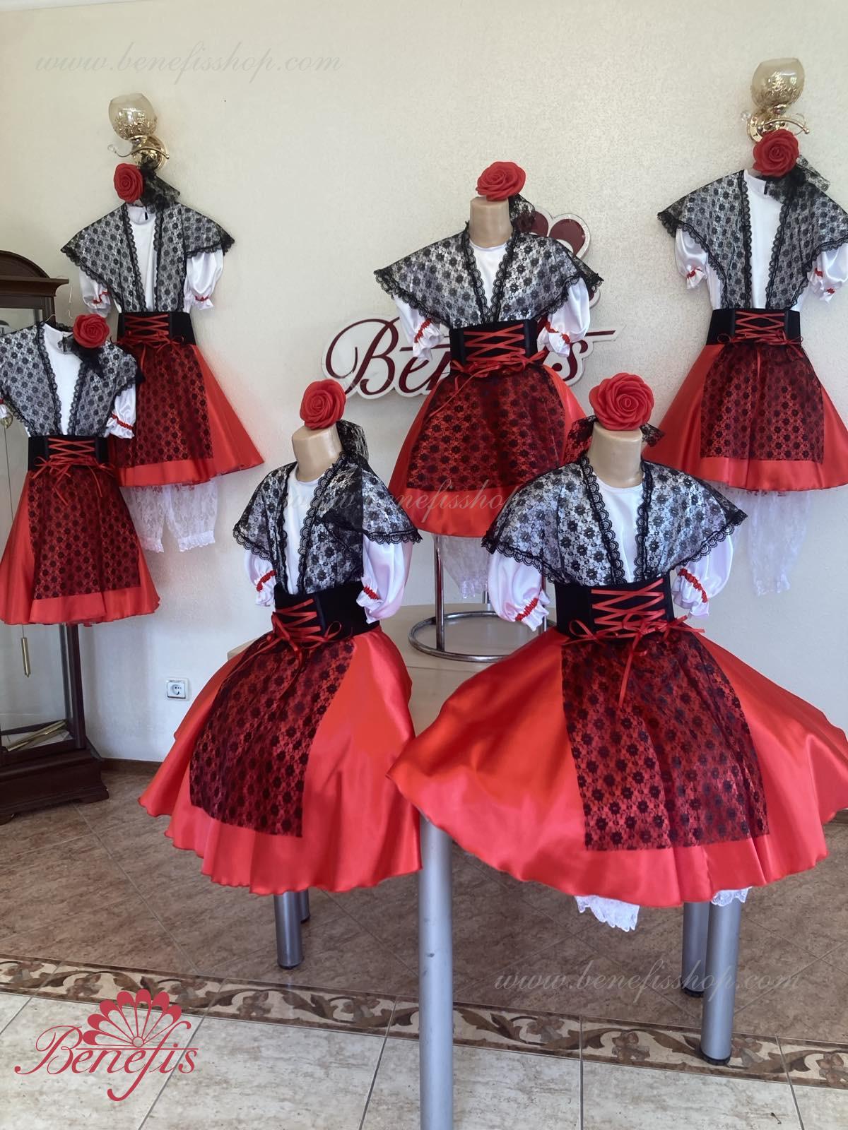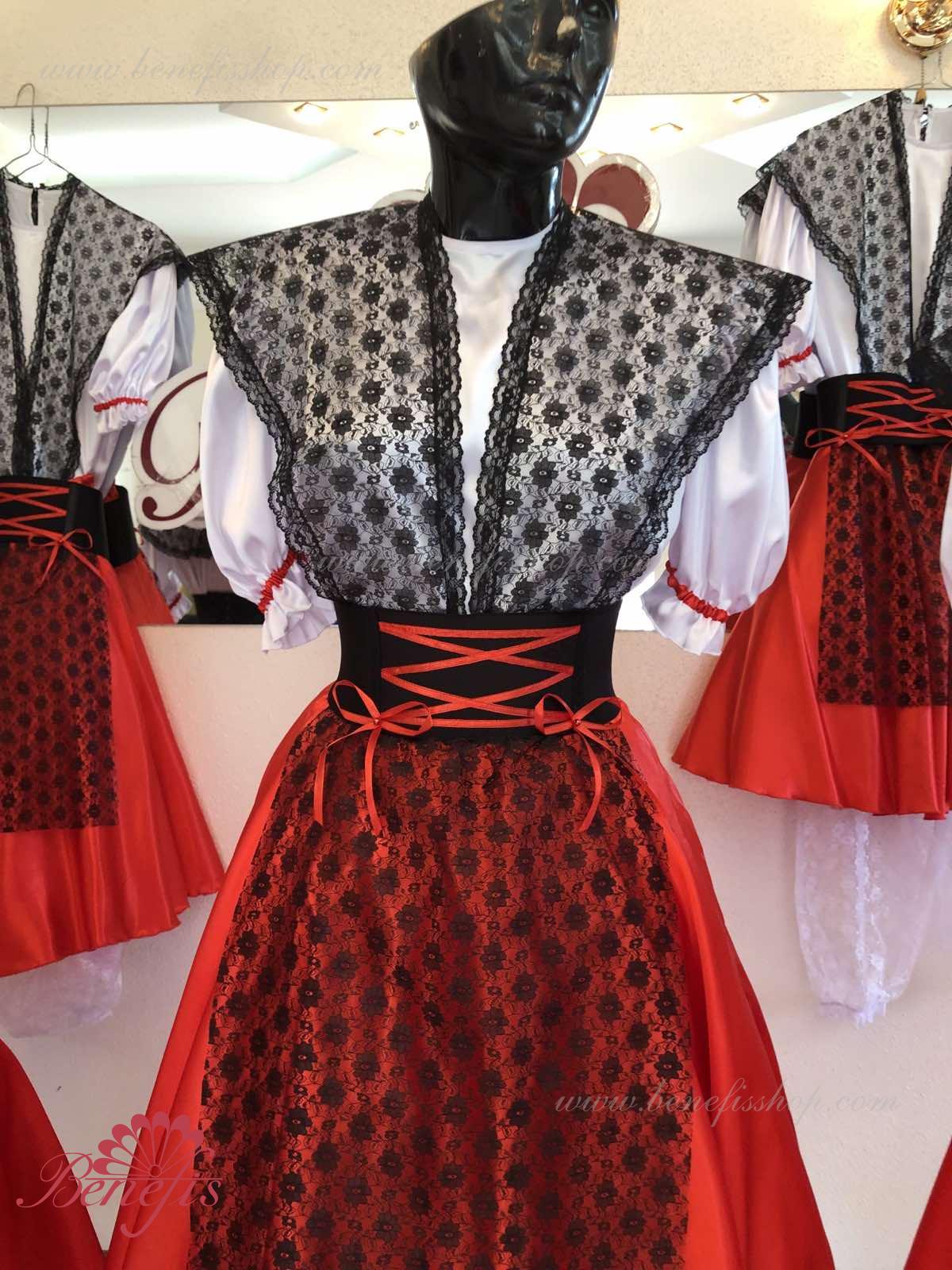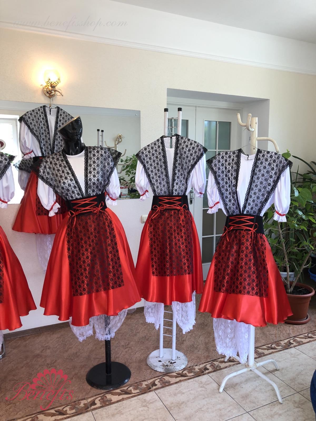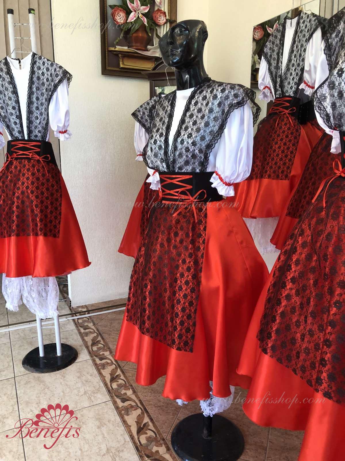 Detalii: bluză, fustă, curea, pantaloni. Acest costum de scenă de balet se bazează pe o bluză ușoară din sifon cu guler gipur. Fusta din satin are volane delicate din tul ușor și este acoperită cu un șorț de guipură deasupra. Centura elastică este fixată în spate cu cârlige pe panglică de sub partea inferioară a fustei se prevad pantalonii din ghipură.